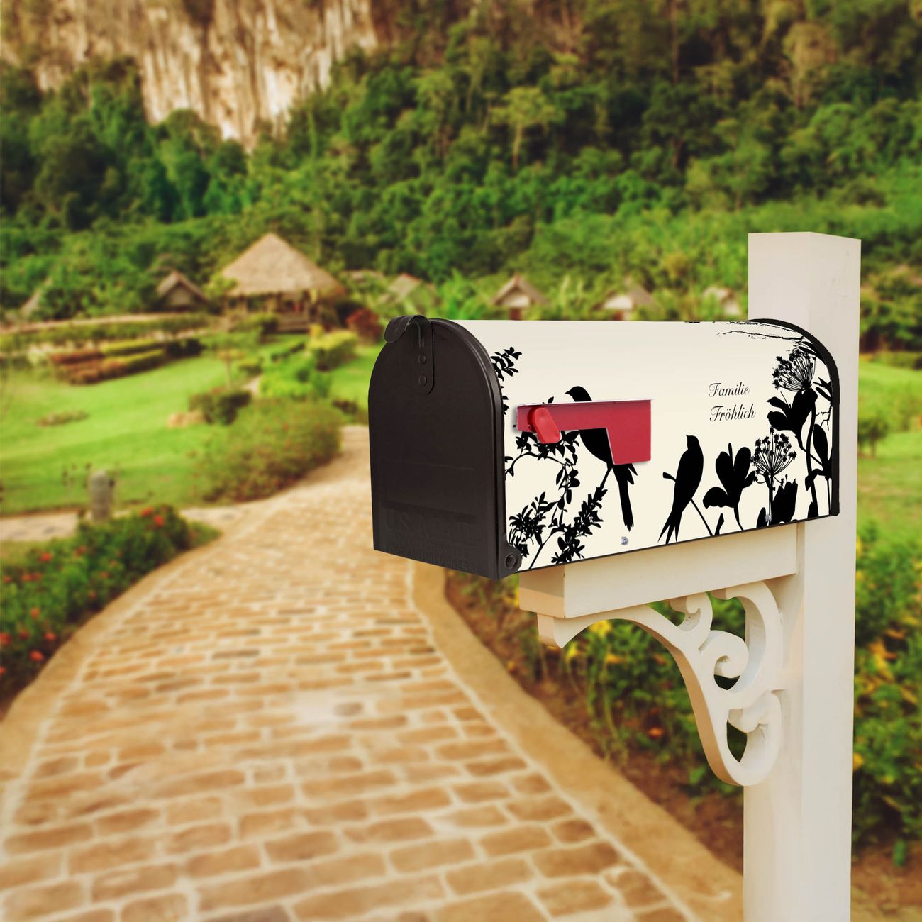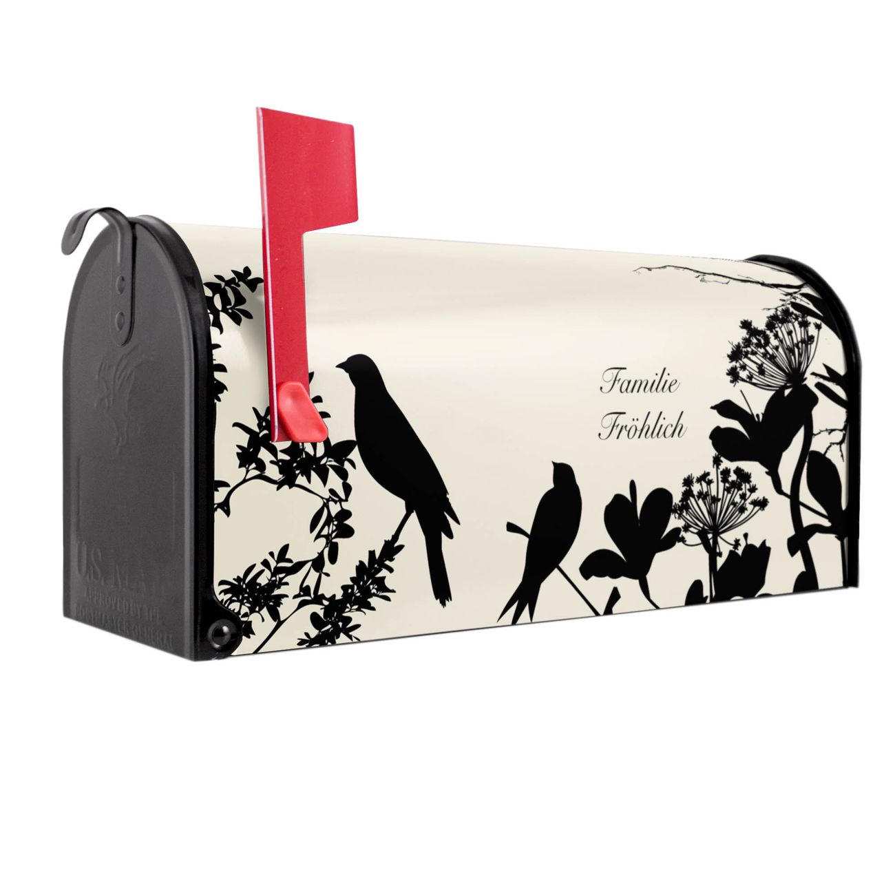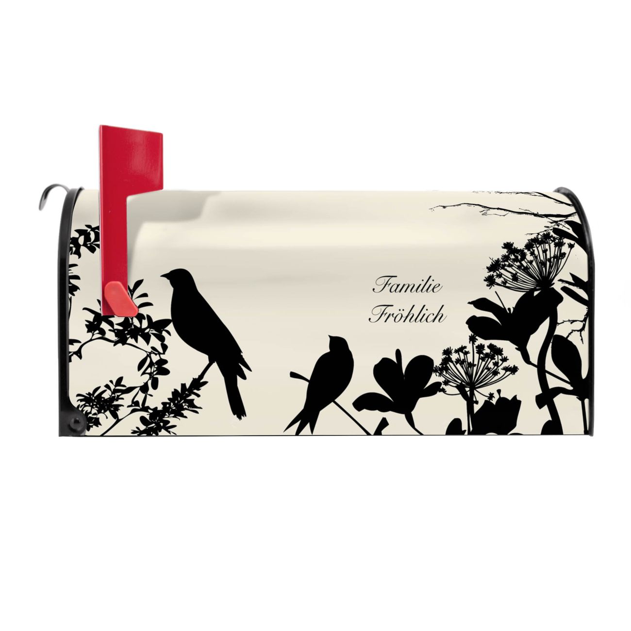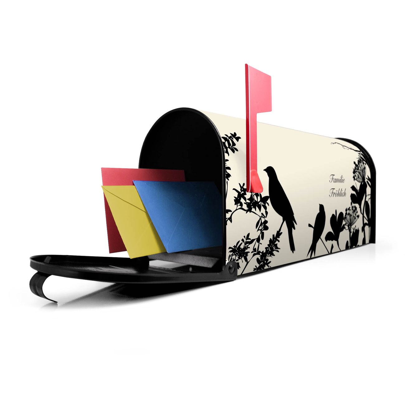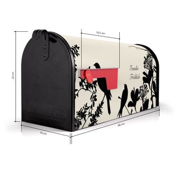 Der amerikanische Briefkasten von banjado mit Vögel Schattenriß Motiv bietet Ihnen ausreichend Fassungsvermögen, um große A4 Sendungen und Zeitschriften zu empfangen. Die typisch amerikanische rote Fahne zeigt Ihnen an, wenn Sie Post erhalten haben. Die US-Mailbox besteht aus verzinktem Stahlblech welches lackiert wurde und ist 48 x 22 x 16 CM (BxHxT) groß. Die Folie mit Motiv Vögel Schattenriß besteht aus einer wetter- und UV-resistenten Folie, die mit einem Schutzlaminat überzogen ist, sodass die US Mailbox zusätzlich vor Kratzern geschützt ist. An der Unterkante sind 4 Löcher je Seite um die Mailbox, typisch amerikanisch, an einem Holzpfahl oder einem Zaun zu befestigen. Auf Wunsch können Sie bei uns den passenden Standfuß oder die passende Wandhalterung kaufen um die US-Mailbox sicher zu befestigen. Wir bieten Ihnen ebenfalls Namensschilder, bereits beschriftet oder frei zu beschriften, und verschiedene selbst gestaltete Bitte-Keine-Werbung-Aufkleber.