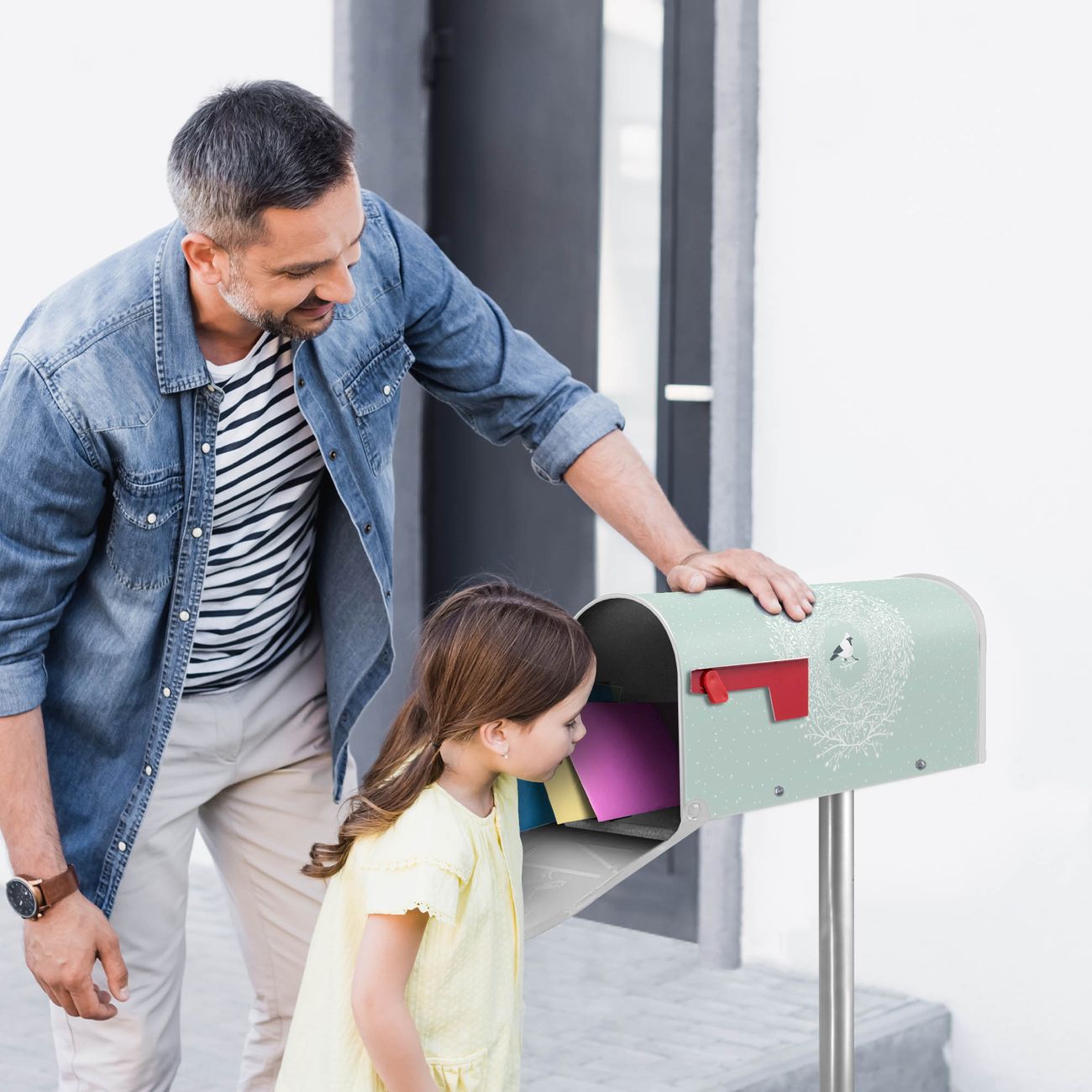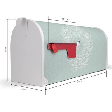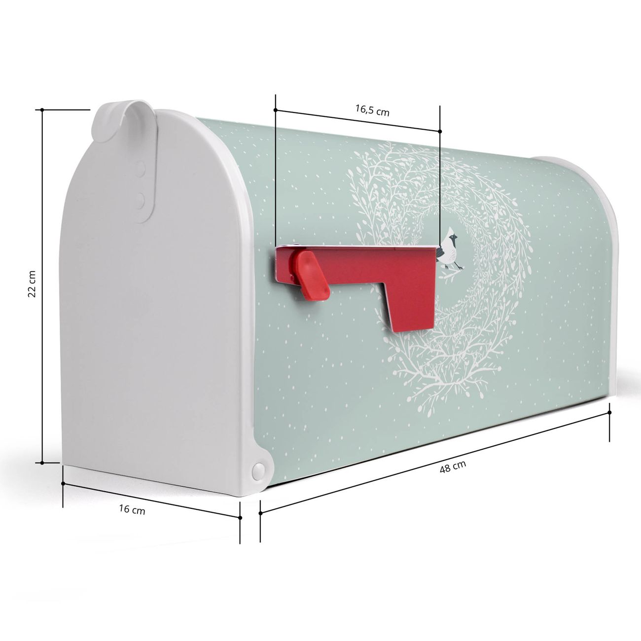 Der amerikanische Briefkasten von banjado mit Vogel im Kranz Motiv bietet Ihnen ausreichend Fassungsvermögen, um große A4 Sendungen und Zeitschriften zu empfangen. Die typisch amerikanische rote Fahne zeigt Ihnen an, wenn Sie Post erhalten haben. Die US-Mailbox besteht aus verzinktem Stahlblech welches lackiert wurde und ist 48 x 22 x 16 CM (BxHxT) groß. Die Folie mit Motiv Vogel im Kranz besteht aus einer wetter- und UV-resistenten Folie, die mit einem Schutzlaminat überzogen ist, sodass die US Mailbox zusätzlich vor Kratzern geschützt ist. An der Unterkante sind 4 Löcher je Seite um die Mailbox, typisch amerikanisch, an einem Holzpfahl oder einem Zaun zu befestigen. Auf Wunsch können Sie bei uns den passenden Standfuß oder die passende Wandhalterung kaufen um die US-Mailbox sicher zu befestigen. Wir bieten Ihnen ebenfalls Namensschilder, bereits beschriftet oder frei zu beschriften, und verschiedene selbst gestaltete Bitte-Keine-Werbung-Aufkleber.