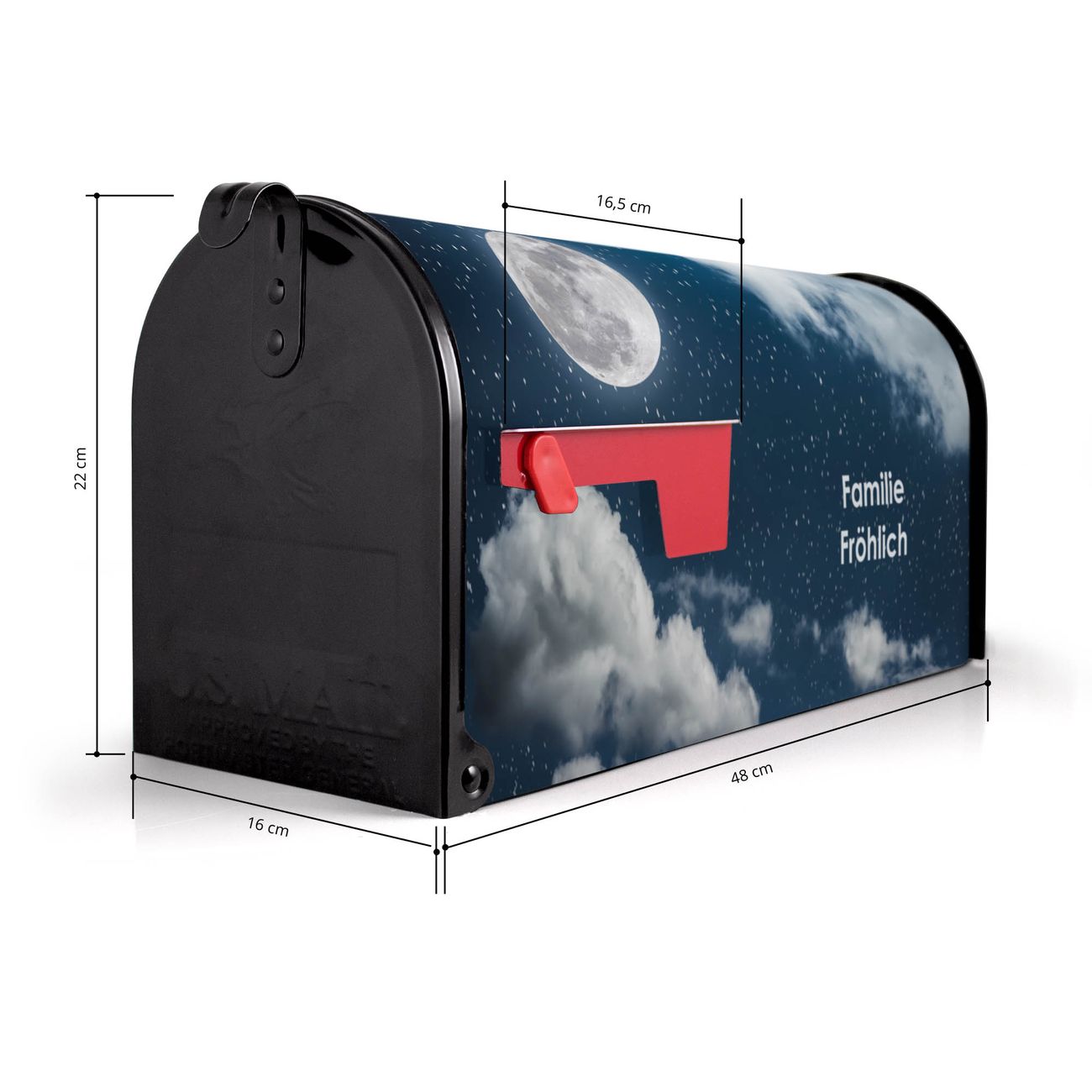 Der amerikanische Briefkasten von banjado mit Vollmond 3 Motiv bietet Ihnen ausreichend Fassungsvermögen, um große A4 Sendungen und Zeitschriften zu empfangen. Die typisch amerikanische rote Fahne zeigt Ihnen an, wenn Sie Post erhalten haben. Die US-Mailbox besteht aus verzinktem Stahlblech welches lackiert wurde und ist 48 x 22 x 16 CM (BxHxT) groß. Die Folie mit Motiv Vollmond 3 besteht aus einer wetter- und UV-resistenten Folie, die mit einem Schutzlaminat überzogen ist, sodass die US Mailbox zusätzlich vor Kratzern geschützt ist. An der Unterkante sind 4 Löcher je Seite um die Mailbox, typisch amerikanisch, an einem Holzpfahl oder einem Zaun zu befestigen. Auf Wunsch können Sie bei uns den passenden Standfuß oder die passende Wandhalterung kaufen um die US-Mailbox sicher zu befestigen. Wir bieten Ihnen ebenfalls Namensschilder, bereits beschriftet oder frei zu beschriften, und verschiedene selbst gestaltete Bitte-Keine-Werbung-Aufkleber.
