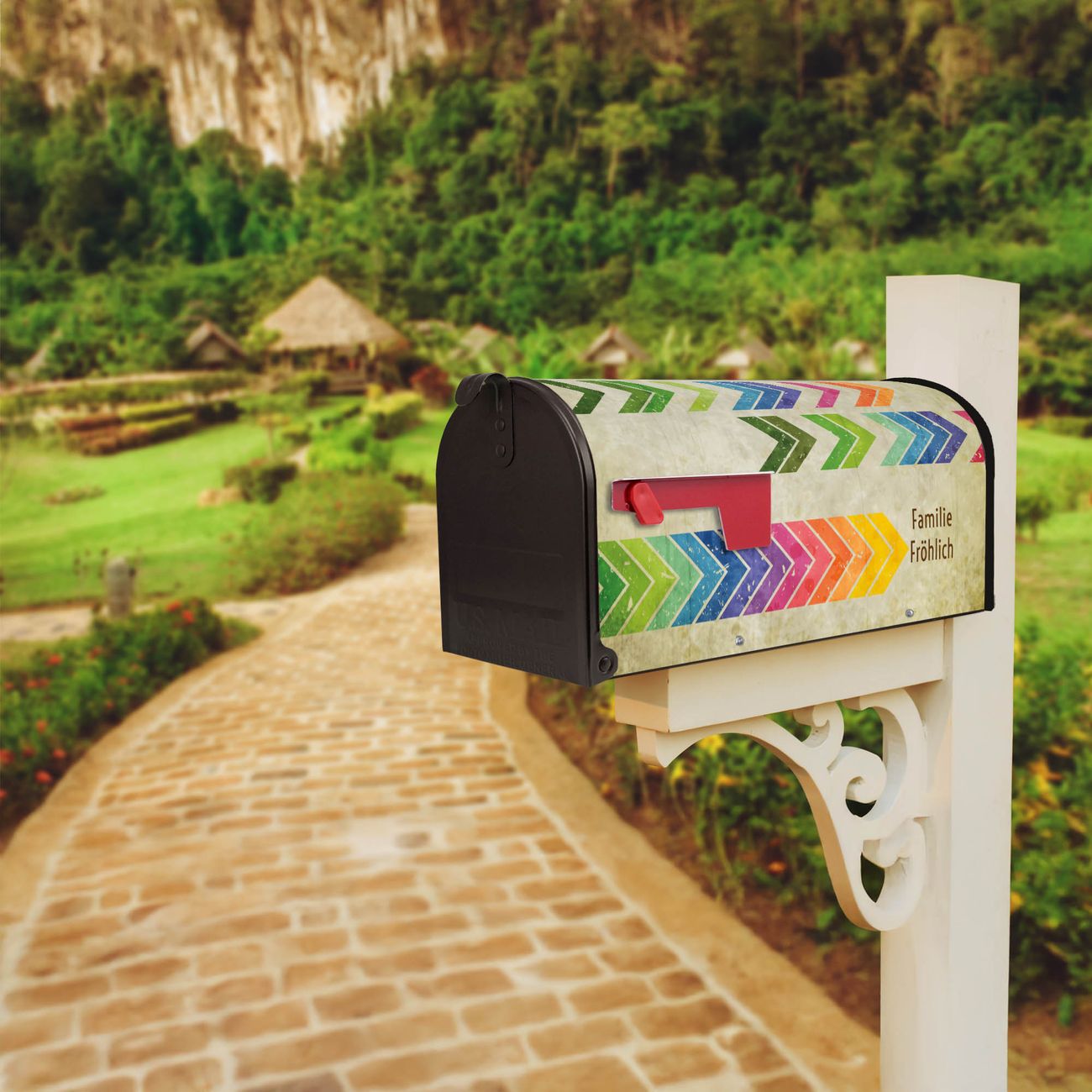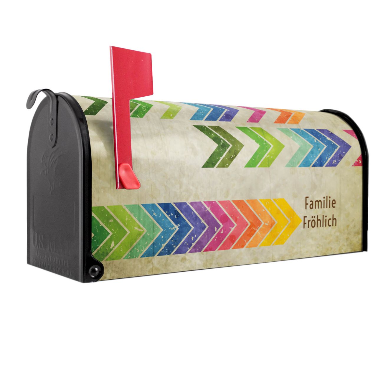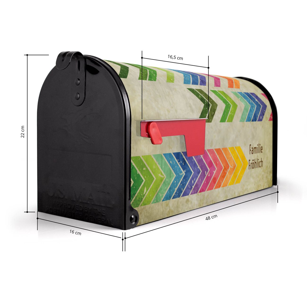 Der amerikanische Briefkasten von banjado mit Vorspulen Motiv bietet Ihnen ausreichend Fassungsvermögen, um große A4 Sendungen und Zeitschriften zu empfangen. Die typisch amerikanische rote Fahne zeigt Ihnen an, wenn Sie Post erhalten haben. Die US-Mailbox besteht aus verzinktem Stahlblech welches lackiert wurde und ist 48 x 22 x 16 CM (BxHxT) groß. Die Folie mit Motiv Vorspulen besteht aus einer wetter- und UV-resistenten Folie, die mit einem Schutzlaminat überzogen ist, sodass die US Mailbox zusätzlich vor Kratzern geschützt ist. An der Unterkante sind 4 Löcher je Seite um die Mailbox, typisch amerikanisch, an einem Holzpfahl oder einem Zaun zu befestigen. Auf Wunsch können Sie bei uns den passenden Standfuß oder die passende Wandhalterung kaufen um die US-Mailbox sicher zu befestigen. Wir bieten Ihnen ebenfalls Namensschilder, bereits beschriftet oder frei zu beschriften, und verschiedene selbst gestaltete Bitte-Keine-Werbung-Aufkleber.