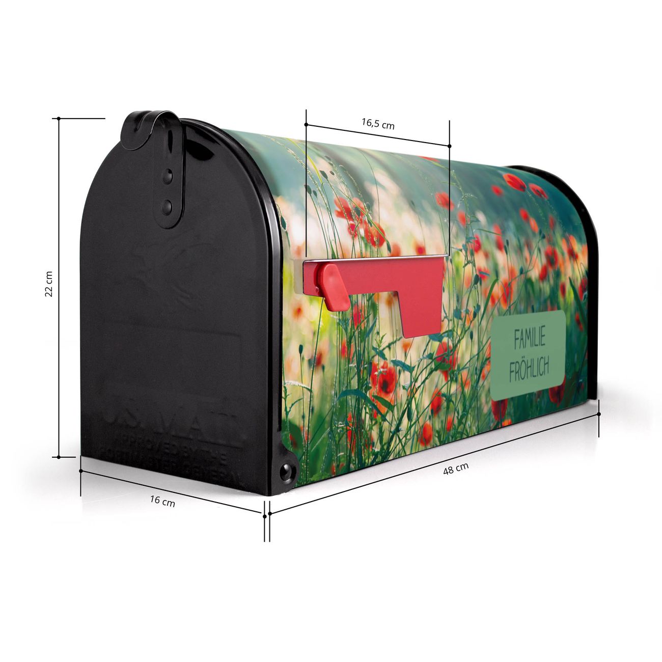 Der amerikanische Briefkasten von banjado mit Waldmohn Motiv bietet Ihnen ausreichend Fassungsvermögen, um große A4 Sendungen und Zeitschriften zu empfangen. Die typisch amerikanische rote Fahne zeigt Ihnen an, wenn Sie Post erhalten haben. Die US-Mailbox besteht aus verzinktem Stahlblech welches lackiert wurde und ist 48 x 22 x 16 CM (BxHxT) groß. Die Folie mit Motiv Waldmohn besteht aus einer wetter- und UV-resistenten Folie, die mit einem Schutzlaminat überzogen ist, sodass die US Mailbox zusätzlich vor Kratzern geschützt ist. An der Unterkante sind 4 Löcher je Seite um die Mailbox, typisch amerikanisch, an einem Holzpfahl oder einem Zaun zu befestigen. Auf Wunsch können Sie bei uns den passenden Standfuß oder die passende Wandhalterung kaufen um die US-Mailbox sicher zu befestigen. Wir bieten Ihnen ebenfalls Namensschilder, bereits beschriftet oder frei zu beschriften, und verschiedene selbst gestaltete Bitte-Keine-Werbung-Aufkleber.