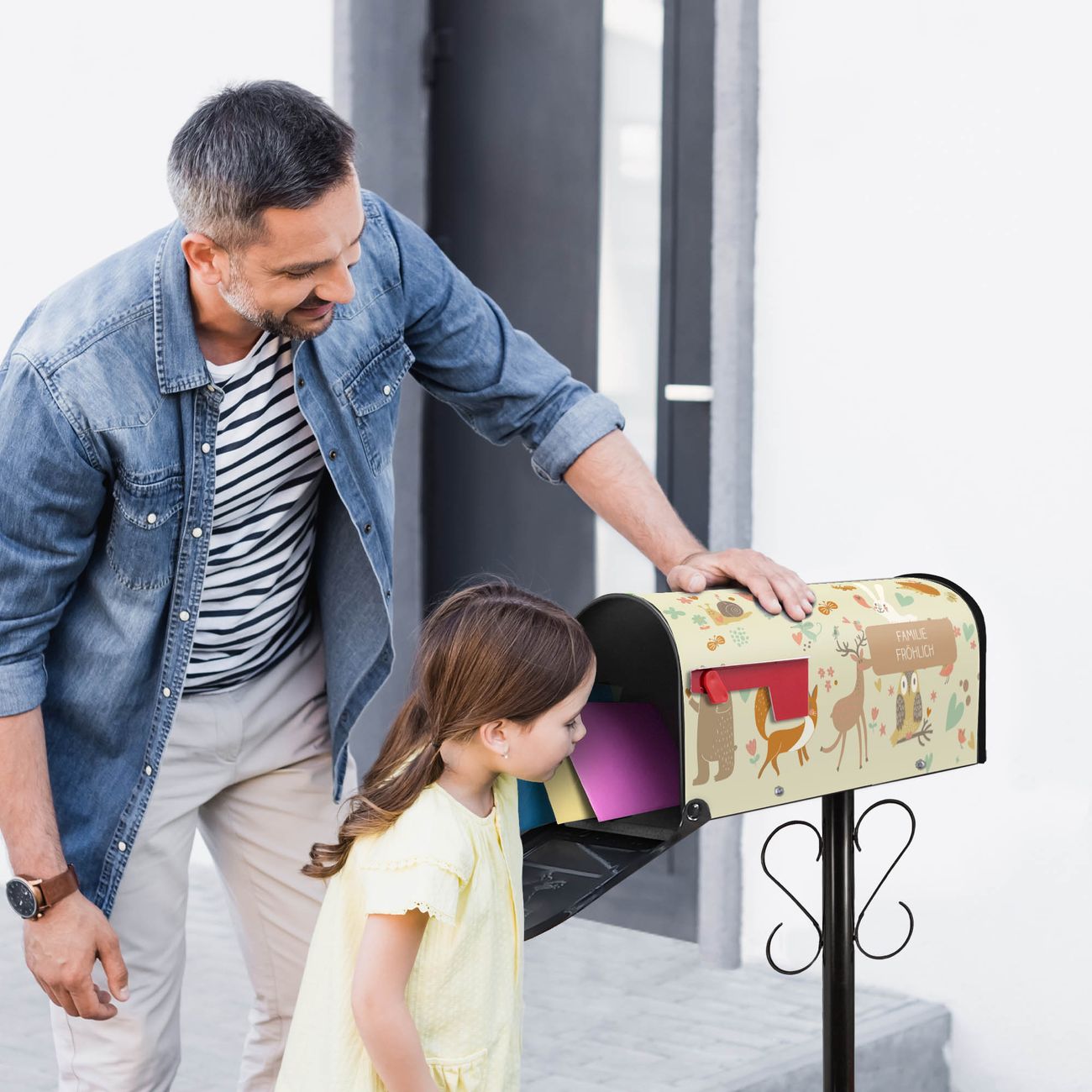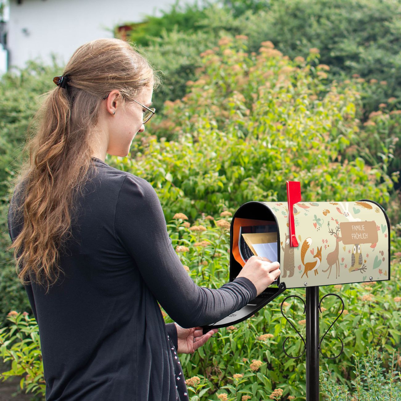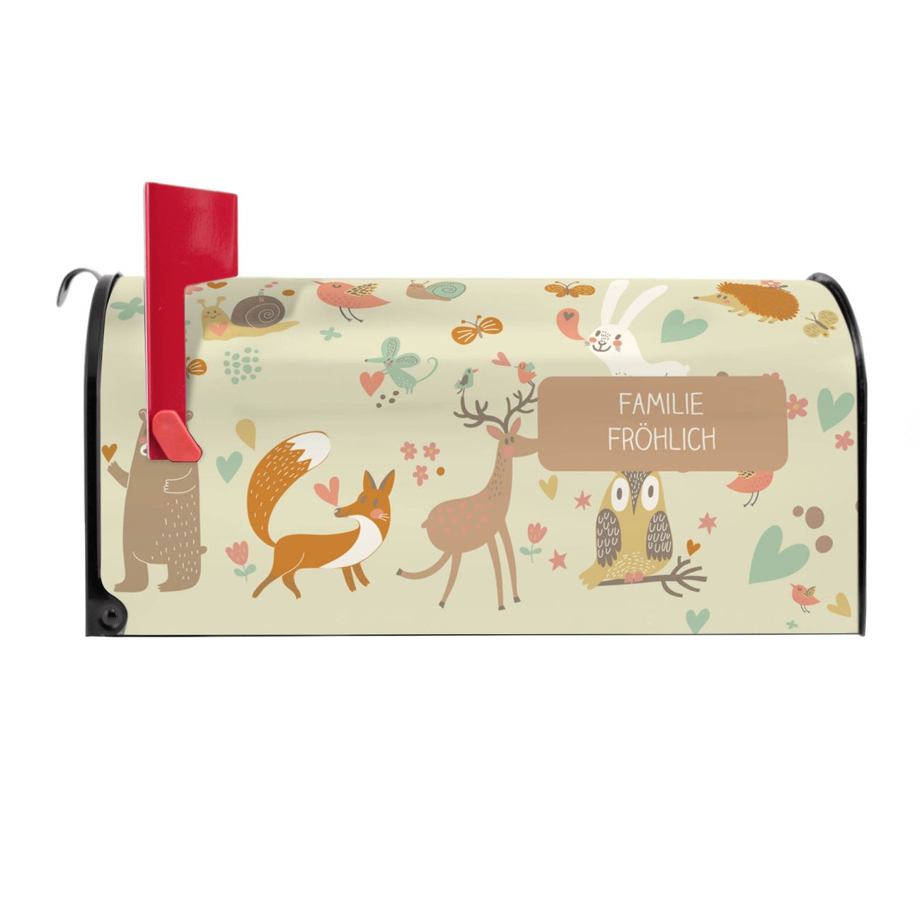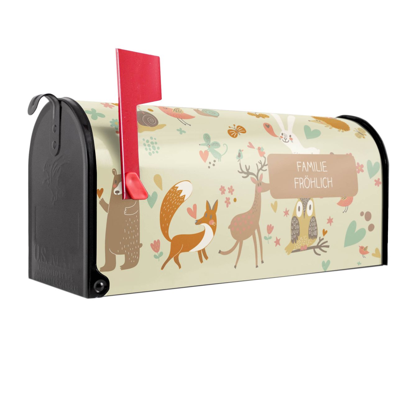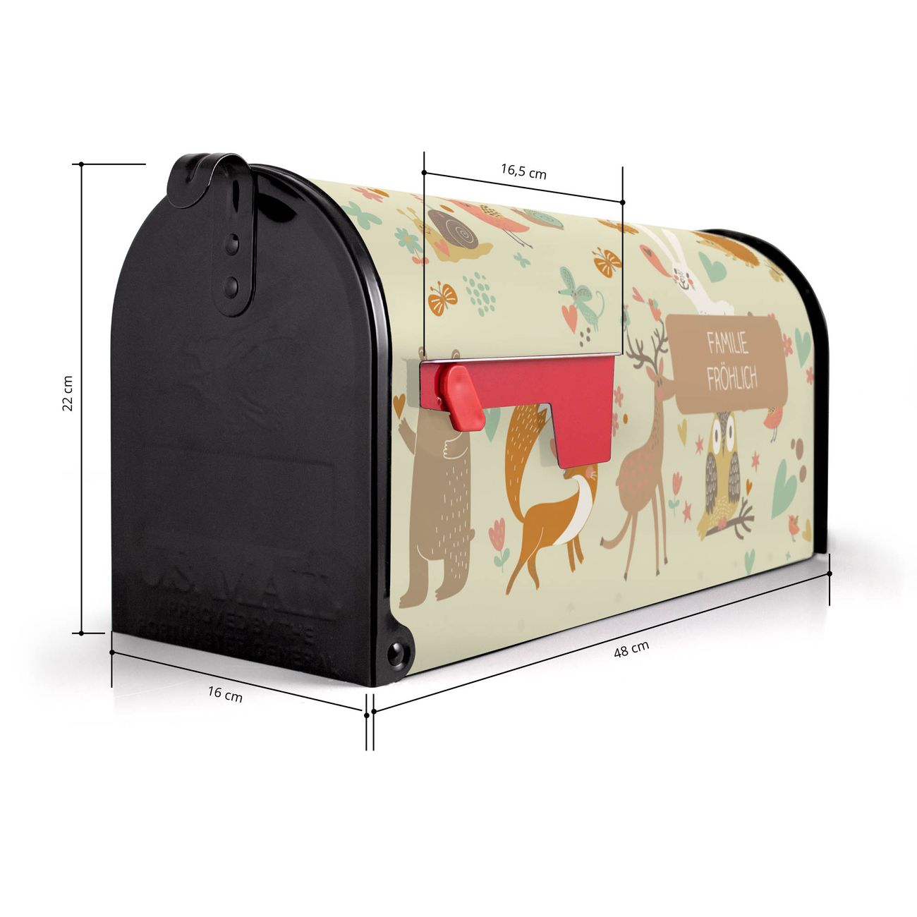 Der amerikanische Briefkasten von banjado mit Waldtiere Motiv bietet Ihnen ausreichend Fassungsvermögen, um große A4 Sendungen und Zeitschriften zu empfangen. Die typisch amerikanische rote Fahne zeigt Ihnen an, wenn Sie Post erhalten haben. Die US-Mailbox besteht aus verzinktem Stahlblech welches lackiert wurde und ist 48 x 22 x 16 CM (BxHxT) groß. Die Folie mit Motiv Waldtiere besteht aus einer wetter- und UV-resistenten Folie, die mit einem Schutzlaminat überzogen ist, sodass die US Mailbox zusätzlich vor Kratzern geschützt ist. An der Unterkante sind 4 Löcher je Seite um die Mailbox, typisch amerikanisch, an einem Holzpfahl oder einem Zaun zu befestigen. Auf Wunsch können Sie bei uns den passenden Standfuß oder die passende Wandhalterung kaufen um die US-Mailbox sicher zu befestigen. Wir bieten Ihnen ebenfalls Namensschilder, bereits beschriftet oder frei zu beschriften, und verschiedene selbst gestaltete Bitte-Keine-Werbung-Aufkleber.