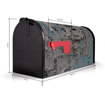 Der amerikanische Briefkasten von banjado mit Wand mit Zeitungen Motiv bietet Ihnen ausreichend Fassungsvermögen, um große A4 Sendungen und Zeitschriften zu empfangen. Die typisch amerikanische rote Fahne zeigt Ihnen an, wenn Sie Post erhalten haben. Die US-Mailbox besteht aus verzinktem Stahlblech welches lackiert wurde und ist 48 x 22 x 16 CM (BxHxT) groß. Die Folie mit Motiv Wand mit Zeitungen besteht aus einer wetter- und UV-resistenten Folie, die mit einem Schutzlaminat überzogen ist, sodass die US Mailbox zusätzlich vor Kratzern geschützt ist. An der Unterkante sind 4 Löcher je Seite um die Mailbox, typisch amerikanisch, an einem Holzpfahl oder einem Zaun zu befestigen. Auf Wunsch können Sie bei uns den passenden Standfuß oder die passende Wandhalterung kaufen um die US-Mailbox sicher zu befestigen. Wir bieten Ihnen ebenfalls Namensschilder, bereits beschriftet oder frei zu beschriften, und verschiedene selbst gestaltete Bitte-Keine-Werbung-Aufkleber.