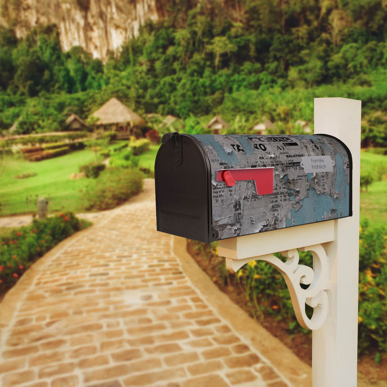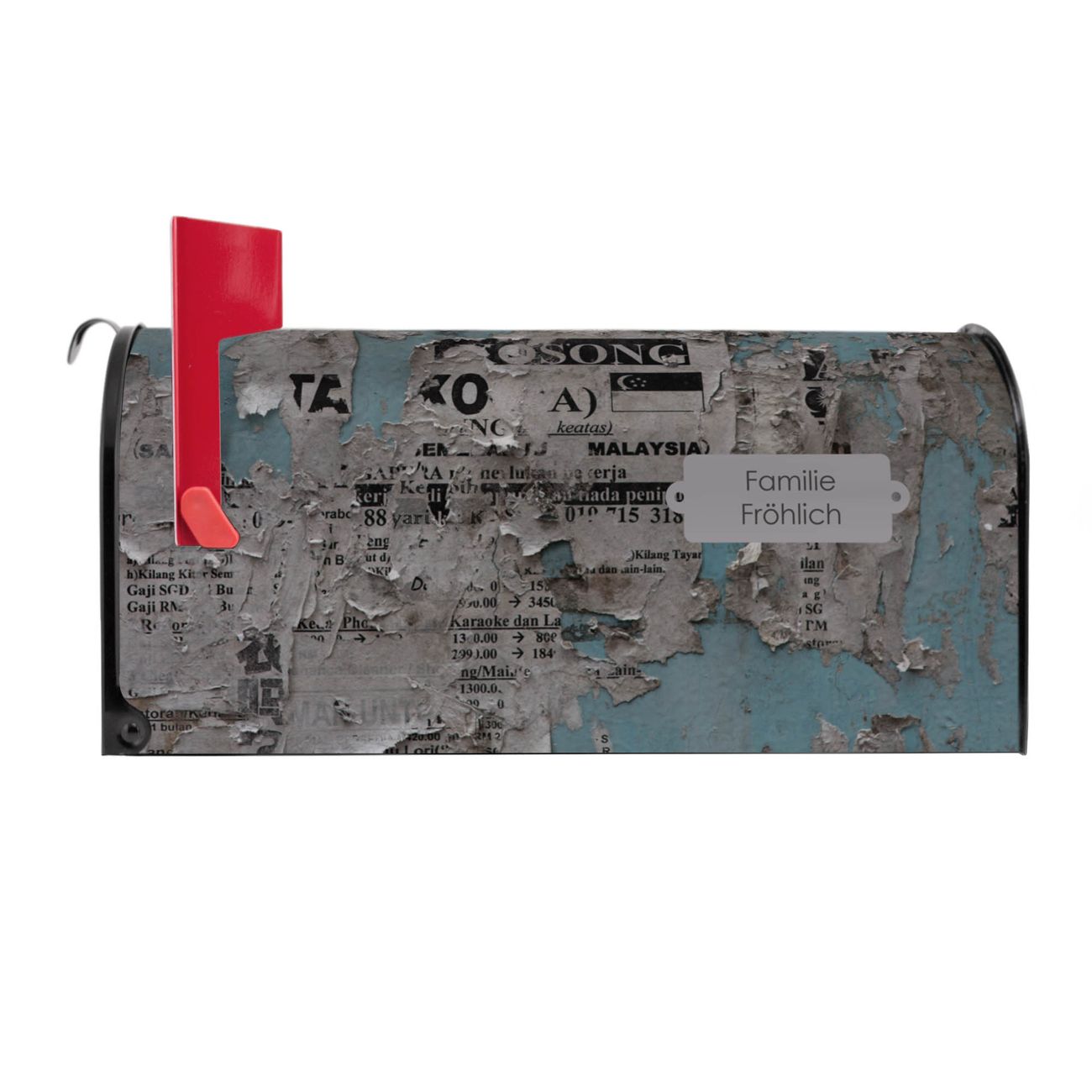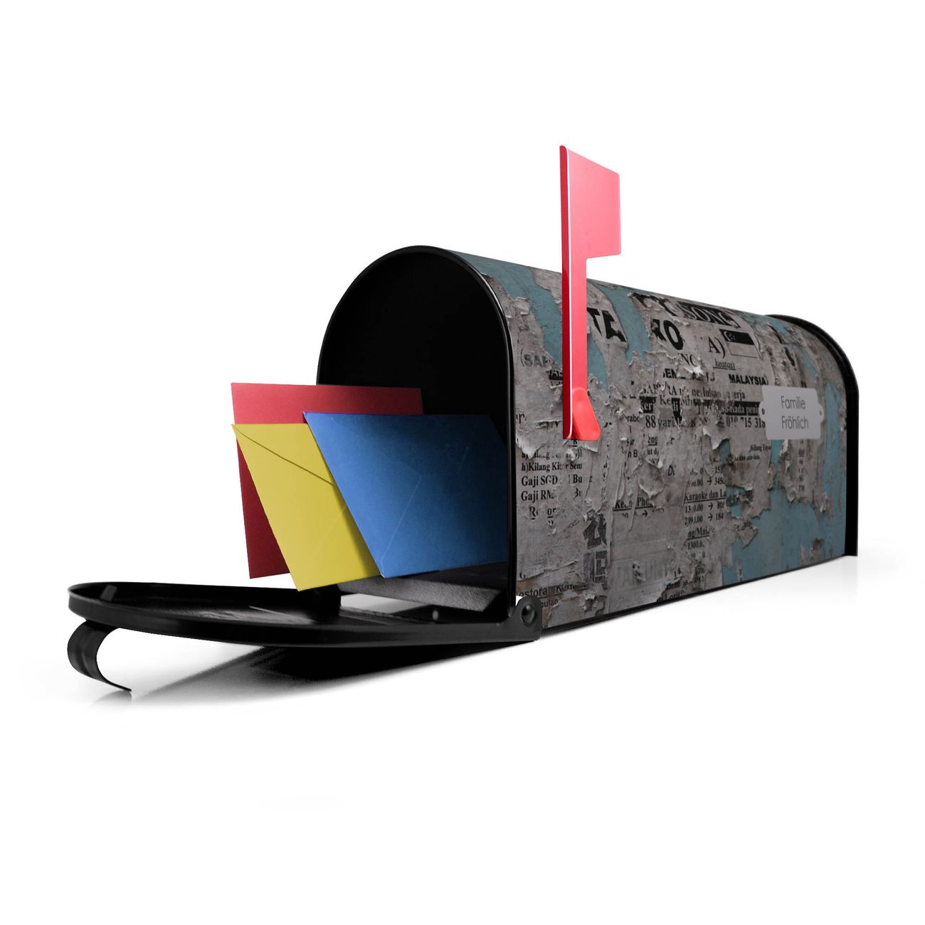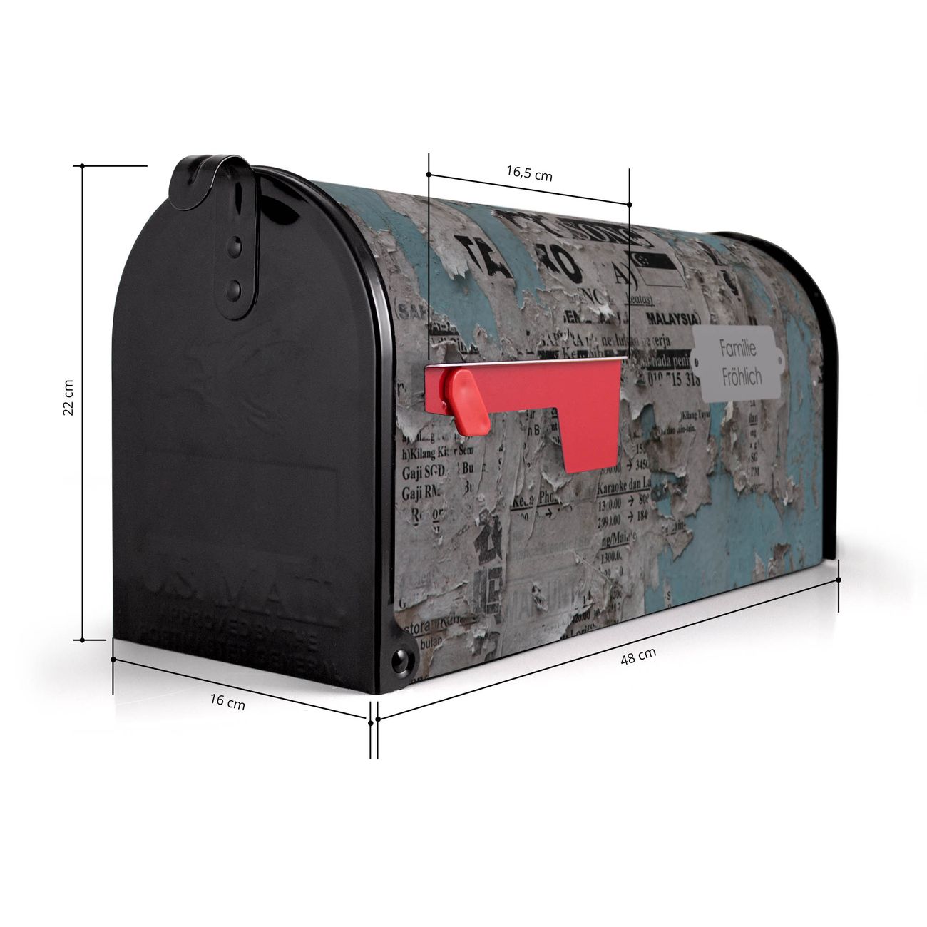 Der amerikanische Briefkasten von banjado mit Wand mit Zeitungen Motiv bietet Ihnen ausreichend Fassungsvermögen, um große A4 Sendungen und Zeitschriften zu empfangen. Die typisch amerikanische rote Fahne zeigt Ihnen an, wenn Sie Post erhalten haben. Die US-Mailbox besteht aus verzinktem Stahlblech welches lackiert wurde und ist 48 x 22 x 16 CM (BxHxT) groß. Die Folie mit Motiv Wand mit Zeitungen besteht aus einer wetter- und UV-resistenten Folie, die mit einem Schutzlaminat überzogen ist, sodass die US Mailbox zusätzlich vor Kratzern geschützt ist. An der Unterkante sind 4 Löcher je Seite um die Mailbox, typisch amerikanisch, an einem Holzpfahl oder einem Zaun zu befestigen. Auf Wunsch können Sie bei uns den passenden Standfuß oder die passende Wandhalterung kaufen um die US-Mailbox sicher zu befestigen. Wir bieten Ihnen ebenfalls Namensschilder, bereits beschriftet oder frei zu beschriften, und verschiedene selbst gestaltete Bitte-Keine-Werbung-Aufkleber.
