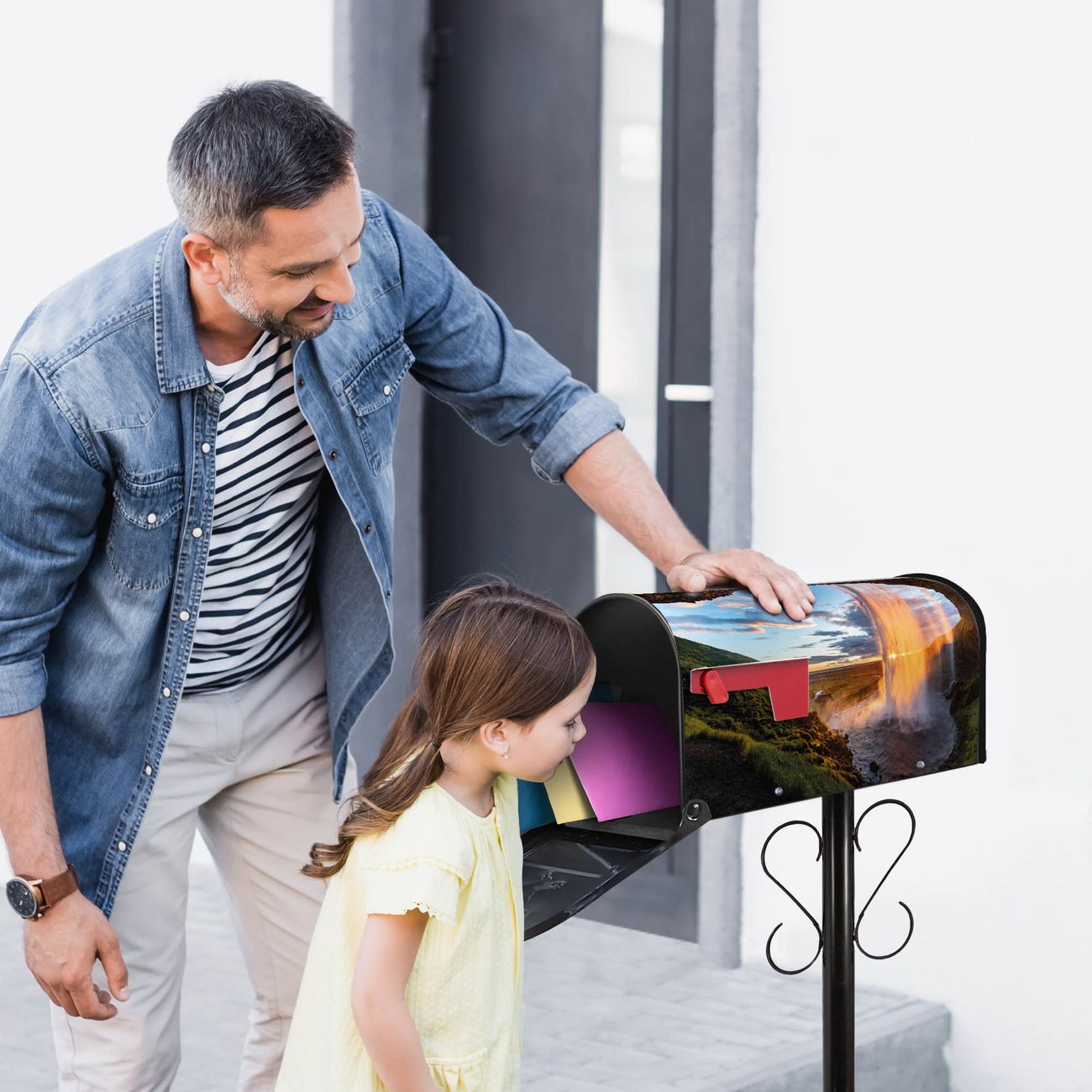Der amerikanische Briefkasten von banjado mit Wasserfall im Sonnenlicht Motiv bietet Ihnen ausreichend Fassungsvermögen, um große A4 Sendungen und Zeitschriften zu empfangen. Die typisch amerikanische rote Fahne zeigt Ihnen an, wenn Sie Post erhalten haben. Die US-Mailbox besteht aus verzinktem Stahlblech welches lackiert wurde und ist 48 x 22 x 16 CM (BxHxT) groß. Die Folie mit Motiv Wasserfall im Sonnenlicht besteht aus einer wetter- und UV-resistenten Folie, die mit einem Schutzlaminat überzogen ist, sodass die US Mailbox zusätzlich vor Kratzern geschützt ist. An der Unterkante sind 4 Löcher je Seite um die Mailbox, typisch amerikanisch, an einem Holzpfahl oder einem Zaun zu befestigen. Auf Wunsch können Sie bei uns den passenden Standfuß oder die passende Wandhalterung kaufen um die US-Mailbox sicher zu befestigen. Wir bieten Ihnen ebenfalls Namensschilder, bereits beschriftet oder frei zu beschriften, und verschiedene selbst gestaltete Bitte-Keine-Werbung-Aufkleber.