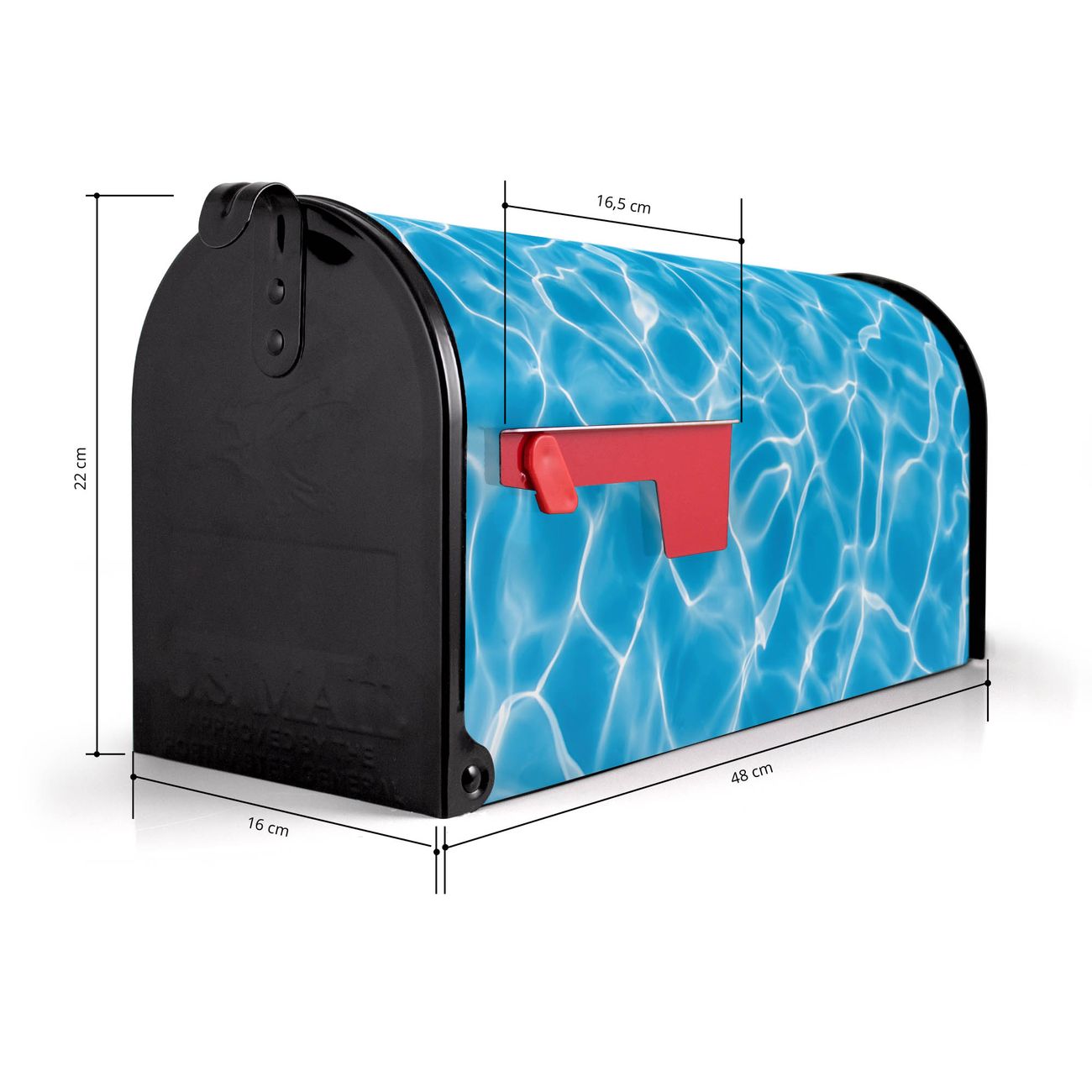 Der amerikanische Briefkasten von banjado mit Wasseroberfläche Motiv bietet Ihnen ausreichend Fassungsvermögen, um große A4 Sendungen und Zeitschriften zu empfangen. Die typisch amerikanische rote Fahne zeigt Ihnen an, wenn Sie Post erhalten haben. Die US-Mailbox besteht aus verzinktem Stahlblech welches lackiert wurde und ist 48 x 22 x 16 CM (BxHxT) groß. Die Folie mit Motiv Wasseroberfläche besteht aus einer wetter- und UV-resistenten Folie, die mit einem Schutzlaminat überzogen ist, sodass die US Mailbox zusätzlich vor Kratzern geschützt ist. An der Unterkante sind 4 Löcher je Seite um die Mailbox, typisch amerikanisch, an einem Holzpfahl oder einem Zaun zu befestigen. Auf Wunsch können Sie bei uns den passenden Standfuß oder die passende Wandhalterung kaufen um die US-Mailbox sicher zu befestigen. Wir bieten Ihnen ebenfalls Namensschilder, bereits beschriftet oder frei zu beschriften, und verschiedene selbst gestaltete Bitte-Keine-Werbung-Aufkleber.