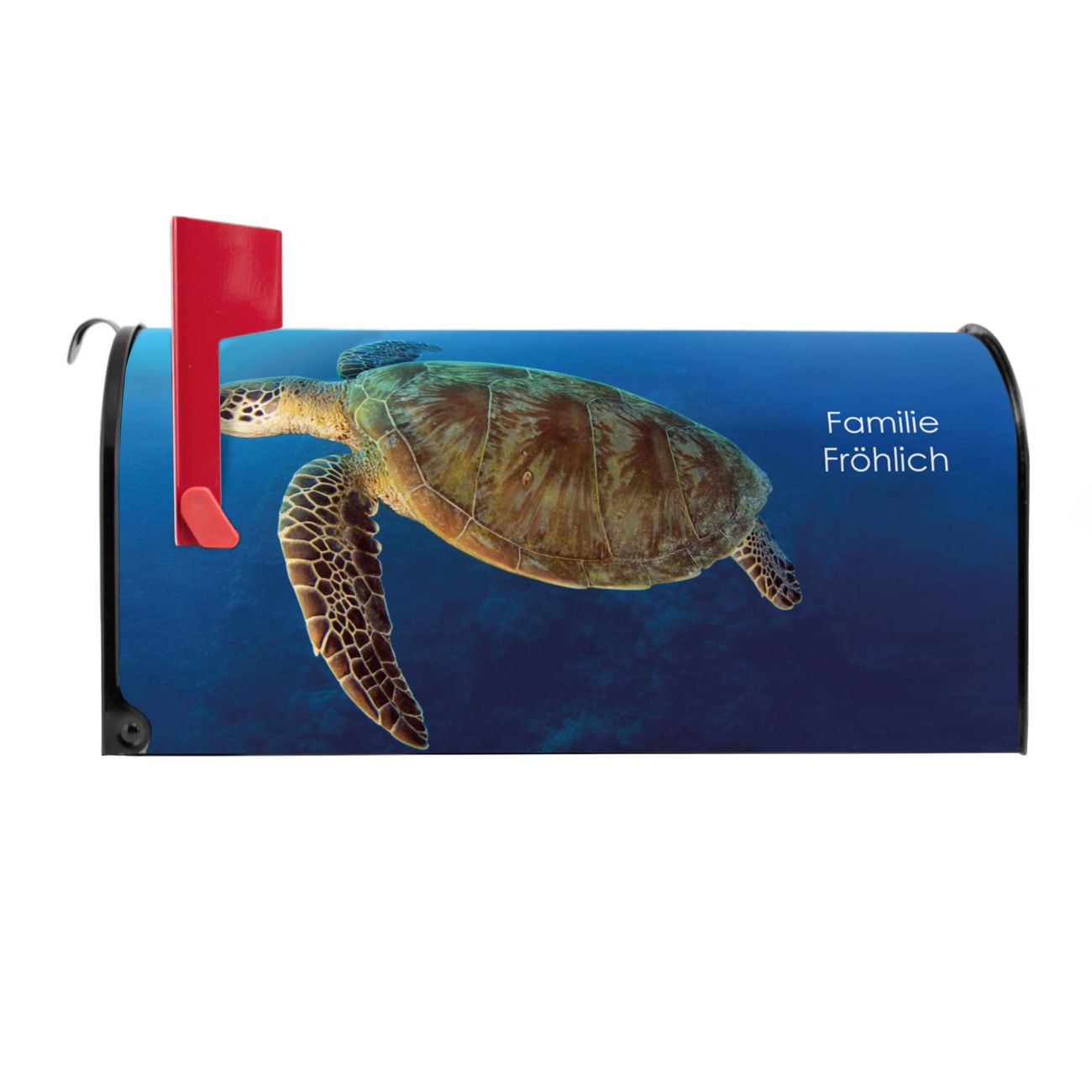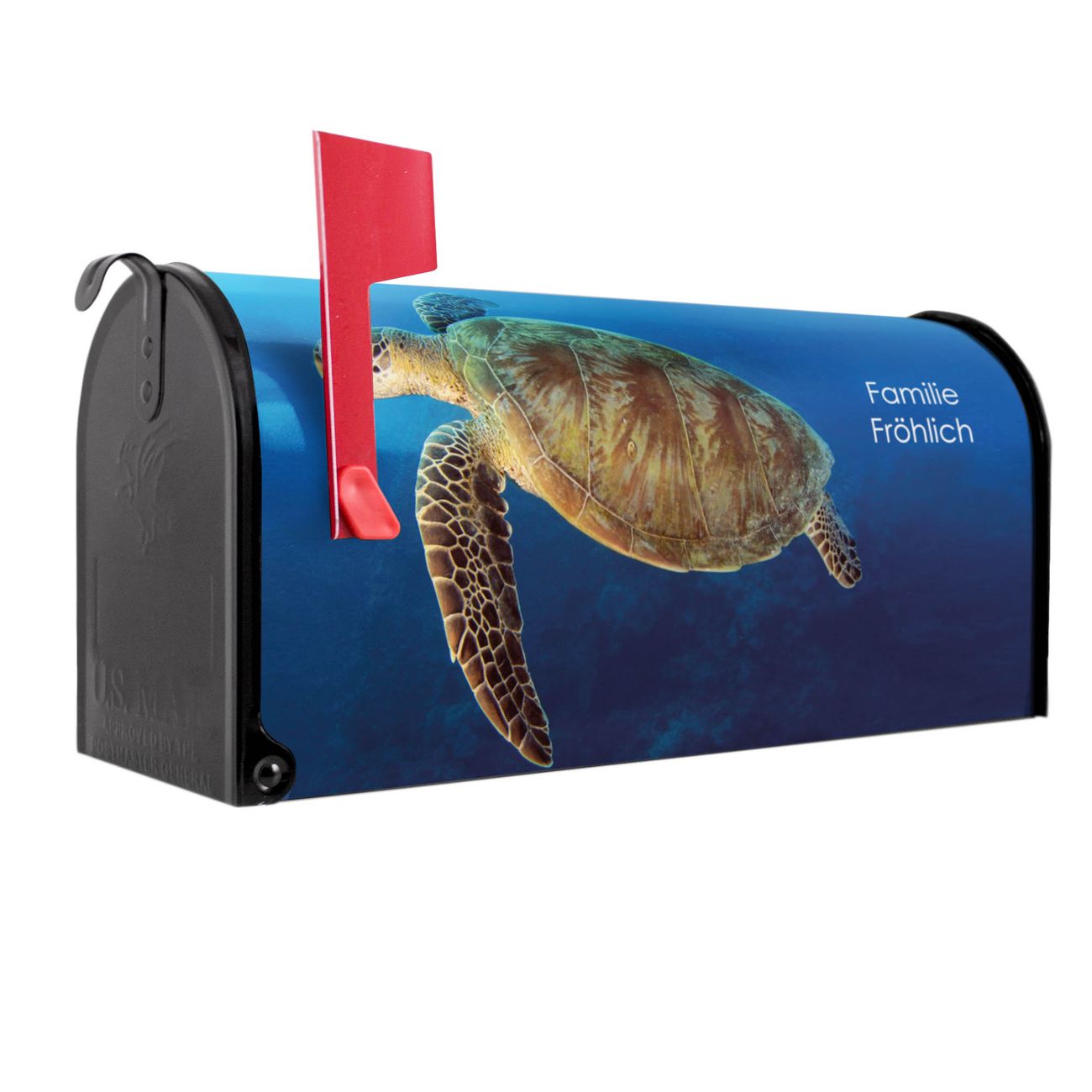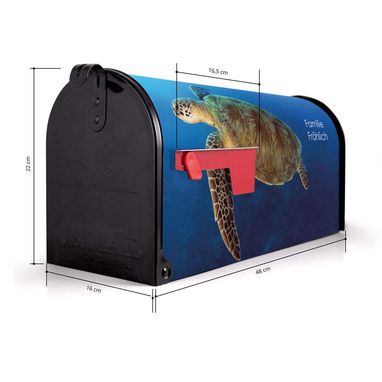 Der amerikanische Briefkasten von banjado mit Wasserschildkröte Motiv bietet Ihnen ausreichend Fassungsvermögen, um große A4 Sendungen und Zeitschriften zu empfangen. Die typisch amerikanische rote Fahne zeigt Ihnen an, wenn Sie Post erhalten haben. Die US-Mailbox besteht aus verzinktem Stahlblech welches lackiert wurde und ist 48 x 22 x 16 CM (BxHxT) groß. Die Folie mit Motiv Wasserschildkröte besteht aus einer wetter- und UV-resistenten Folie, die mit einem Schutzlaminat überzogen ist, sodass die US Mailbox zusätzlich vor Kratzern geschützt ist. An der Unterkante sind 4 Löcher je Seite um die Mailbox, typisch amerikanisch, an einem Holzpfahl oder einem Zaun zu befestigen. Auf Wunsch können Sie bei uns den passenden Standfuß oder die passende Wandhalterung kaufen um die US-Mailbox sicher zu befestigen. Wir bieten Ihnen ebenfalls Namensschilder, bereits beschriftet oder frei zu beschriften, und verschiedene selbst gestaltete Bitte-Keine-Werbung-Aufkleber.