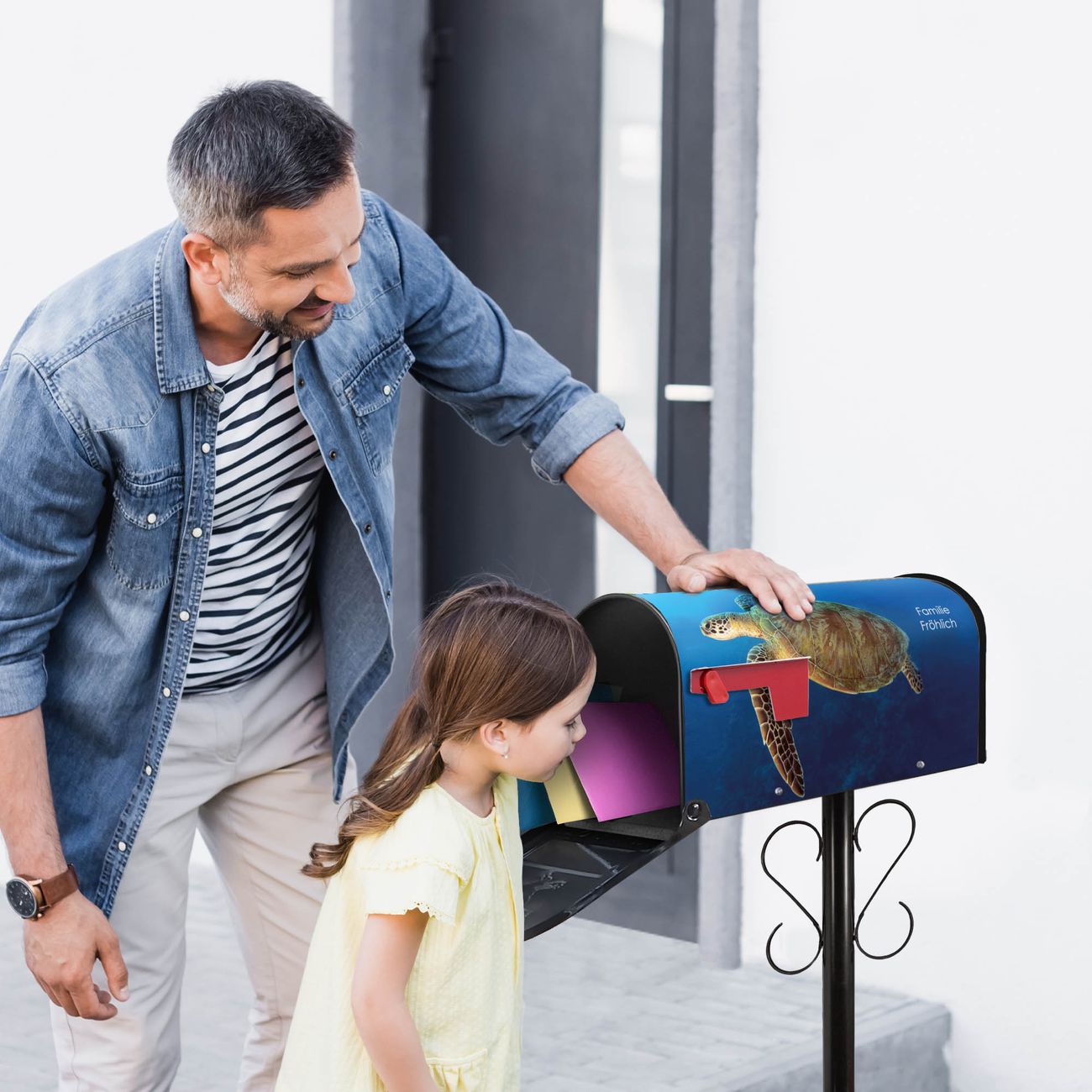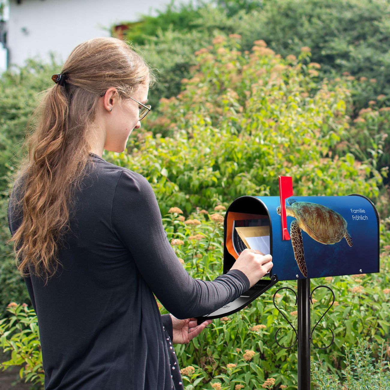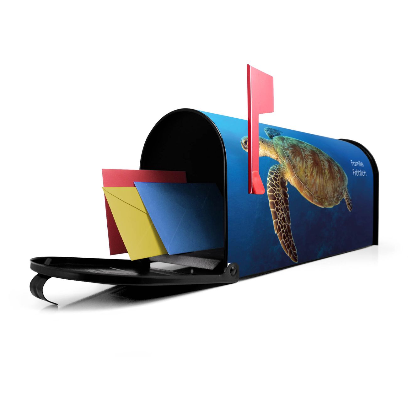 Der amerikanische Briefkasten von banjado mit Wasserschildkröte Motiv bietet Ihnen ausreichend Fassungsvermögen, um große A4 Sendungen und Zeitschriften zu empfangen. Die typisch amerikanische rote Fahne zeigt Ihnen an, wenn Sie Post erhalten haben. Die US-Mailbox besteht aus verzinktem Stahlblech welches lackiert wurde und ist 48 x 22 x 16 CM (BxHxT) groß. Die Folie mit Motiv Wasserschildkröte besteht aus einer wetter- und UV-resistenten Folie, die mit einem Schutzlaminat überzogen ist, sodass die US Mailbox zusätzlich vor Kratzern geschützt ist. An der Unterkante sind 4 Löcher je Seite um die Mailbox, typisch amerikanisch, an einem Holzpfahl oder einem Zaun zu befestigen. Auf Wunsch können Sie bei uns den passenden Standfuß oder die passende Wandhalterung kaufen um die US-Mailbox sicher zu befestigen. Wir bieten Ihnen ebenfalls Namensschilder, bereits beschriftet oder frei zu beschriften, und verschiedene selbst gestaltete Bitte-Keine-Werbung-Aufkleber.