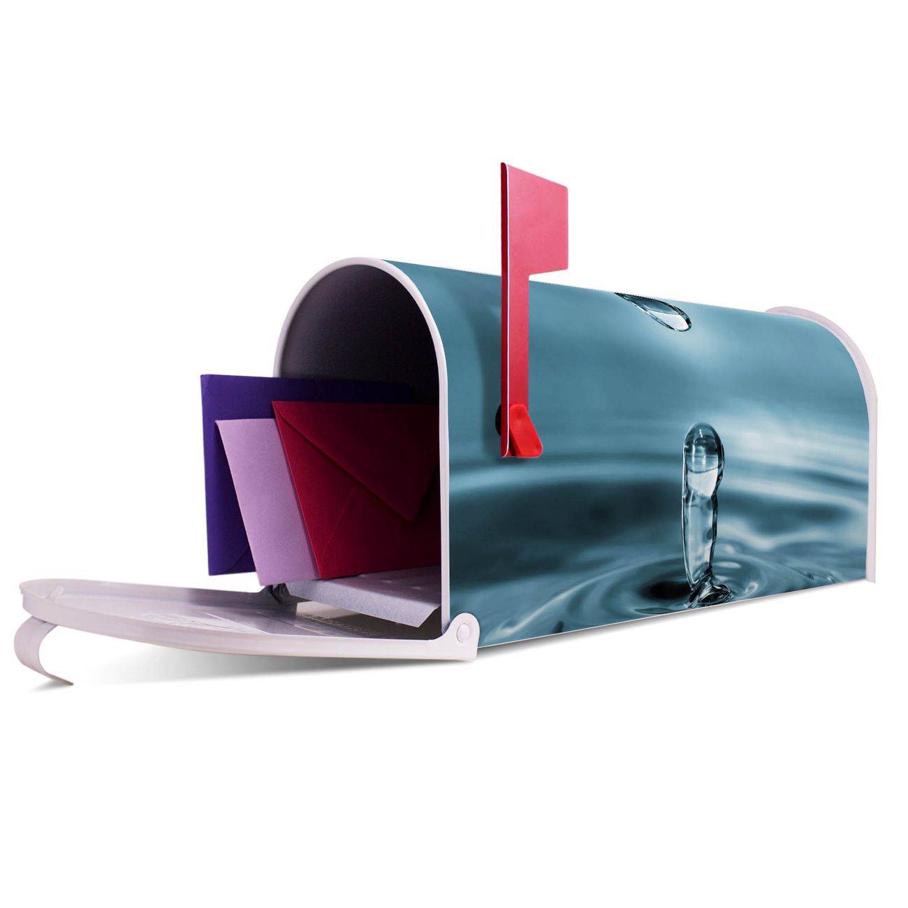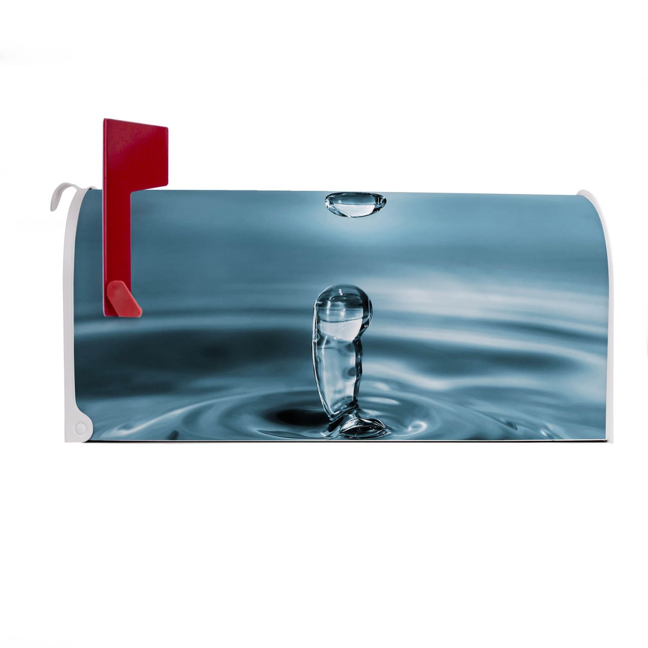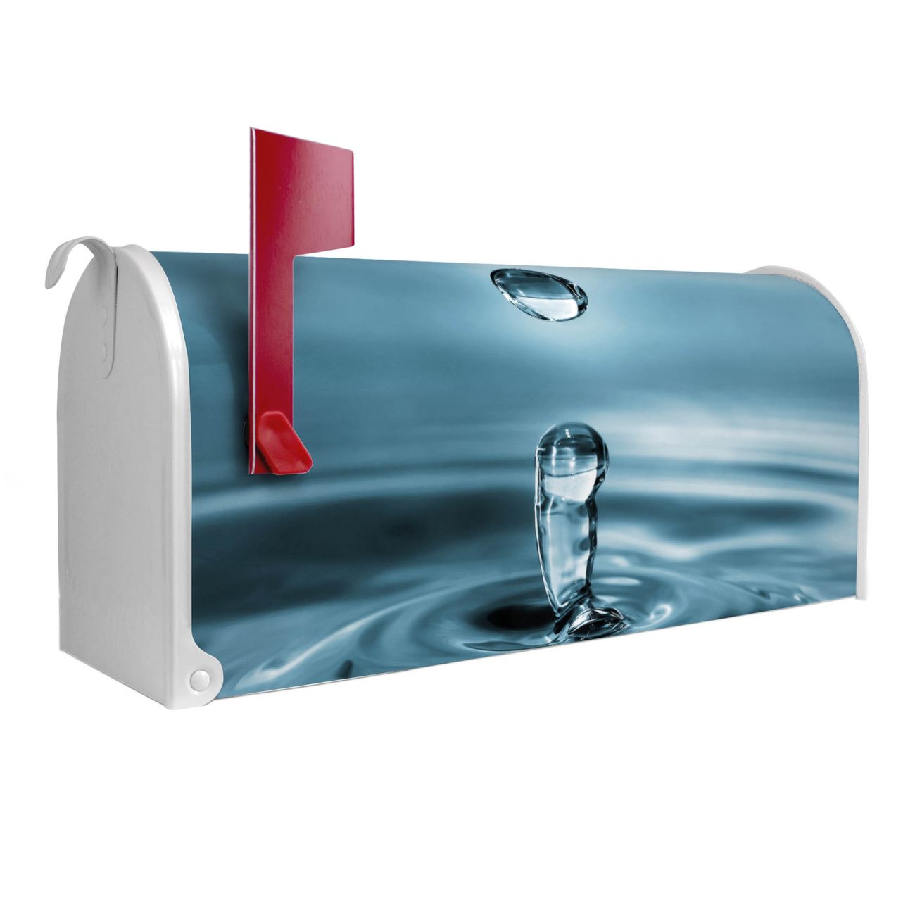Der amerikanische Briefkasten von banjado mit Wassertropfen Motiv bietet Ihnen ausreichend Fassungsvermögen, um große A4 Sendungen und Zeitschriften zu empfangen. Die typisch amerikanische rote Fahne zeigt Ihnen an, wenn Sie Post erhalten haben. Die US-Mailbox besteht aus verzinktem Stahlblech welches lackiert wurde und ist 48 x 22 x 16 CM (BxHxT) groß. Die Folie mit Motiv Wassertropfen besteht aus einer wetter- und UV-resistenten Folie, die mit einem Schutzlaminat überzogen ist, sodass die US Mailbox zusätzlich vor Kratzern geschützt ist. An der Unterkante sind 4 Löcher je Seite um die Mailbox, typisch amerikanisch, an einem Holzpfahl oder einem Zaun zu befestigen. Auf Wunsch können Sie bei uns den passenden Standfuß oder die passende Wandhalterung kaufen um die US-Mailbox sicher zu befestigen. Wir bieten Ihnen ebenfalls Namensschilder, bereits beschriftet oder frei zu beschriften, und verschiedene selbst gestaltete Bitte-Keine-Werbung-Aufkleber.