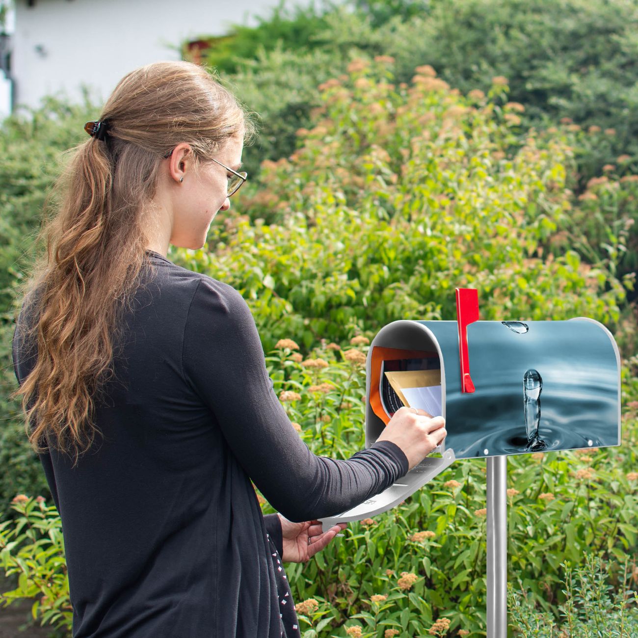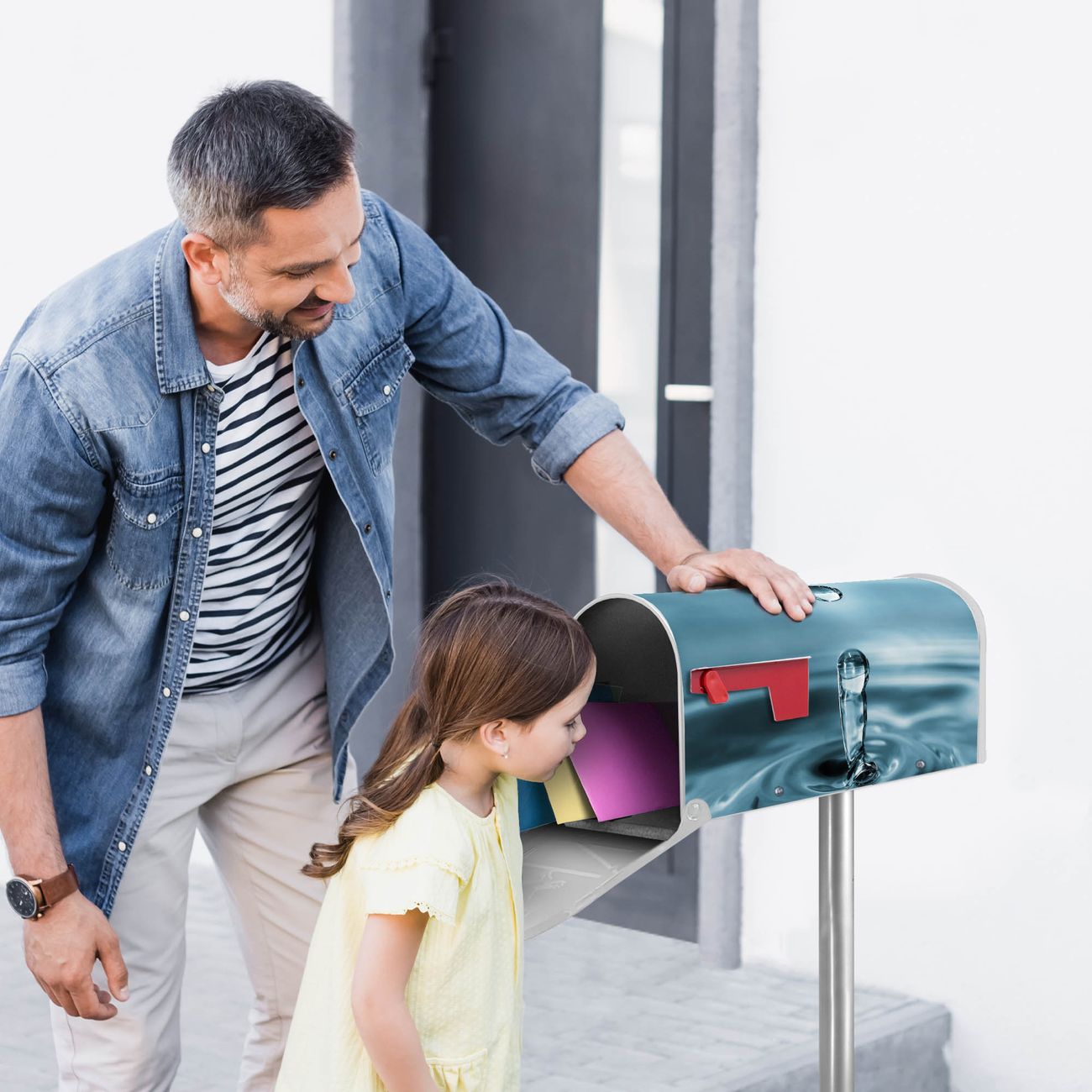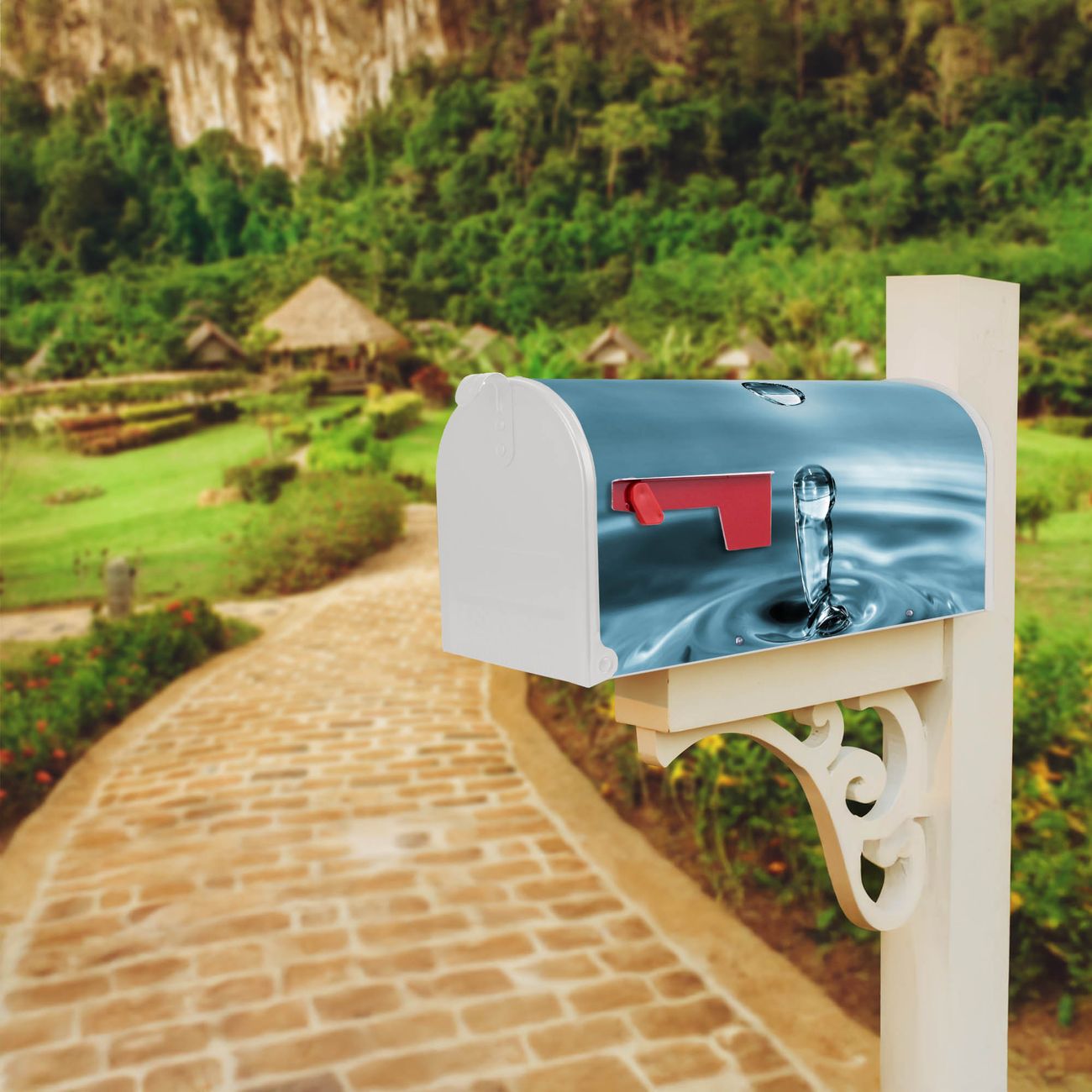 Der amerikanische Briefkasten von banjado mit Wassertropfen Motiv bietet Ihnen ausreichend Fassungsvermögen, um große A4 Sendungen und Zeitschriften zu empfangen. Die typisch amerikanische rote Fahne zeigt Ihnen an, wenn Sie Post erhalten haben. Die US-Mailbox besteht aus verzinktem Stahlblech welches lackiert wurde und ist 48 x 22 x 16 CM (BxHxT) groß. Die Folie mit Motiv Wassertropfen besteht aus einer wetter- und UV-resistenten Folie, die mit einem Schutzlaminat überzogen ist, sodass die US Mailbox zusätzlich vor Kratzern geschützt ist. An der Unterkante sind 4 Löcher je Seite um die Mailbox, typisch amerikanisch, an einem Holzpfahl oder einem Zaun zu befestigen. Auf Wunsch können Sie bei uns den passenden Standfuß oder die passende Wandhalterung kaufen um die US-Mailbox sicher zu befestigen. Wir bieten Ihnen ebenfalls Namensschilder, bereits beschriftet oder frei zu beschriften, und verschiedene selbst gestaltete Bitte-Keine-Werbung-Aufkleber.