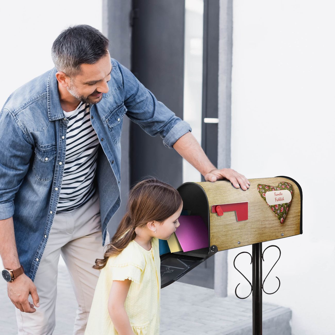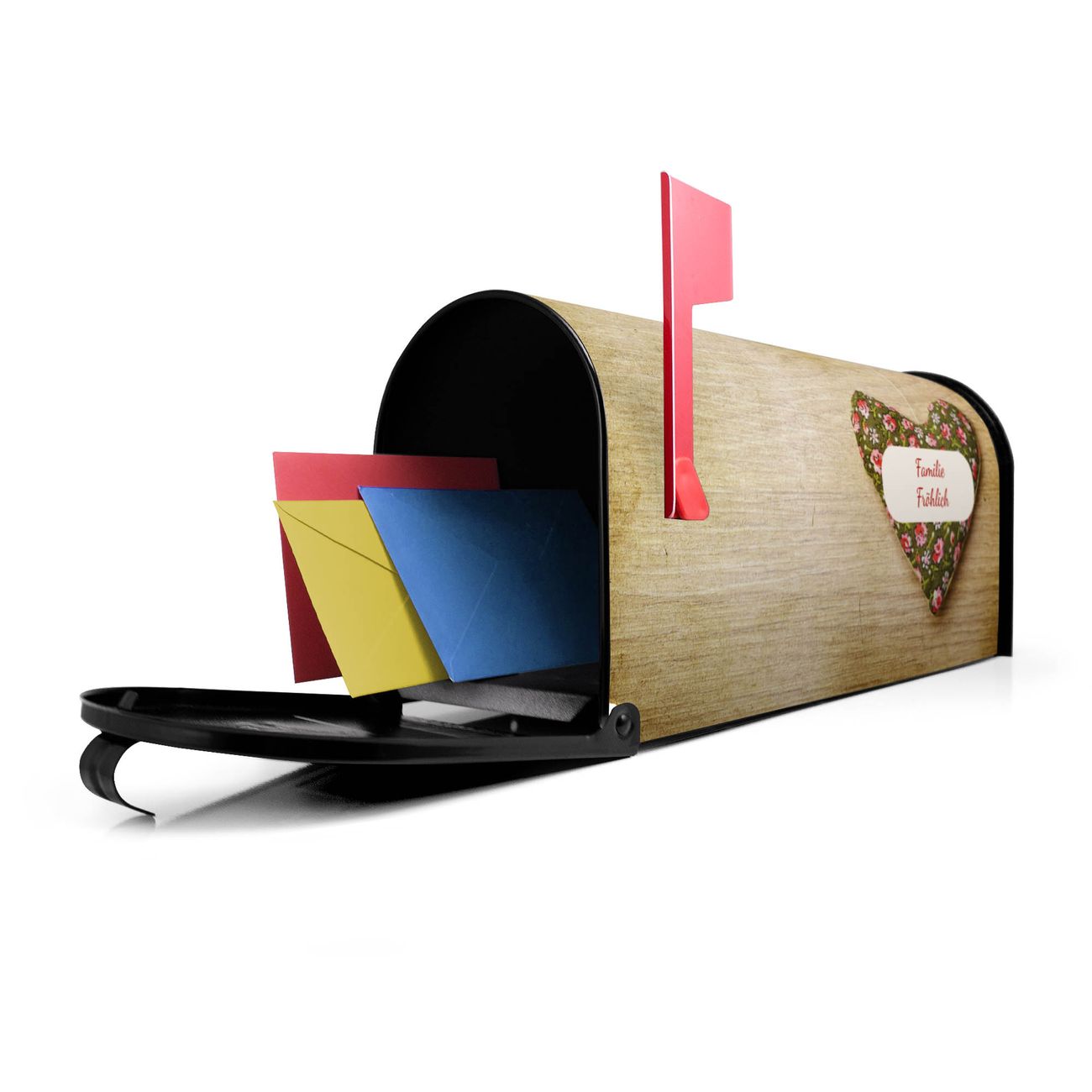Der amerikanische Briefkasten von banjado mit Weiches Herz Motiv bietet Ihnen ausreichend Fassungsvermögen, um große A4 Sendungen und Zeitschriften zu empfangen. Die typisch amerikanische rote Fahne zeigt Ihnen an, wenn Sie Post erhalten haben. Die US-Mailbox besteht aus verzinktem Stahlblech welches lackiert wurde und ist 48 x 22 x 16 CM (BxHxT) groß. Die Folie mit Motiv Weiches Herz besteht aus einer wetter- und UV-resistenten Folie, die mit einem Schutzlaminat überzogen ist, sodass die US Mailbox zusätzlich vor Kratzern geschützt ist. An der Unterkante sind 4 Löcher je Seite um die Mailbox, typisch amerikanisch, an einem Holzpfahl oder einem Zaun zu befestigen. Auf Wunsch können Sie bei uns den passenden Standfuß oder die passende Wandhalterung kaufen um die US-Mailbox sicher zu befestigen. Wir bieten Ihnen ebenfalls Namensschilder, bereits beschriftet oder frei zu beschriften, und verschiedene selbst gestaltete Bitte-Keine-Werbung-Aufkleber.