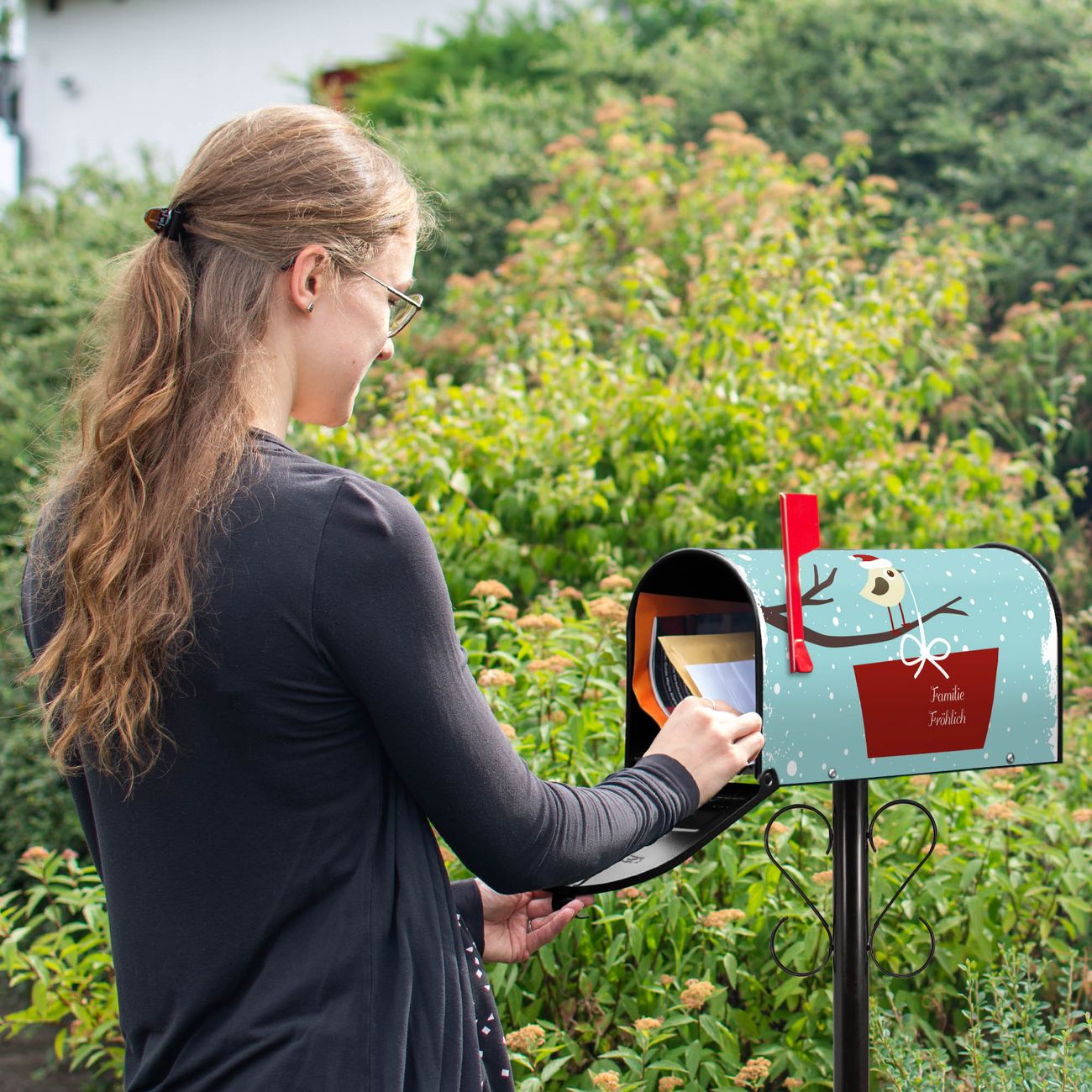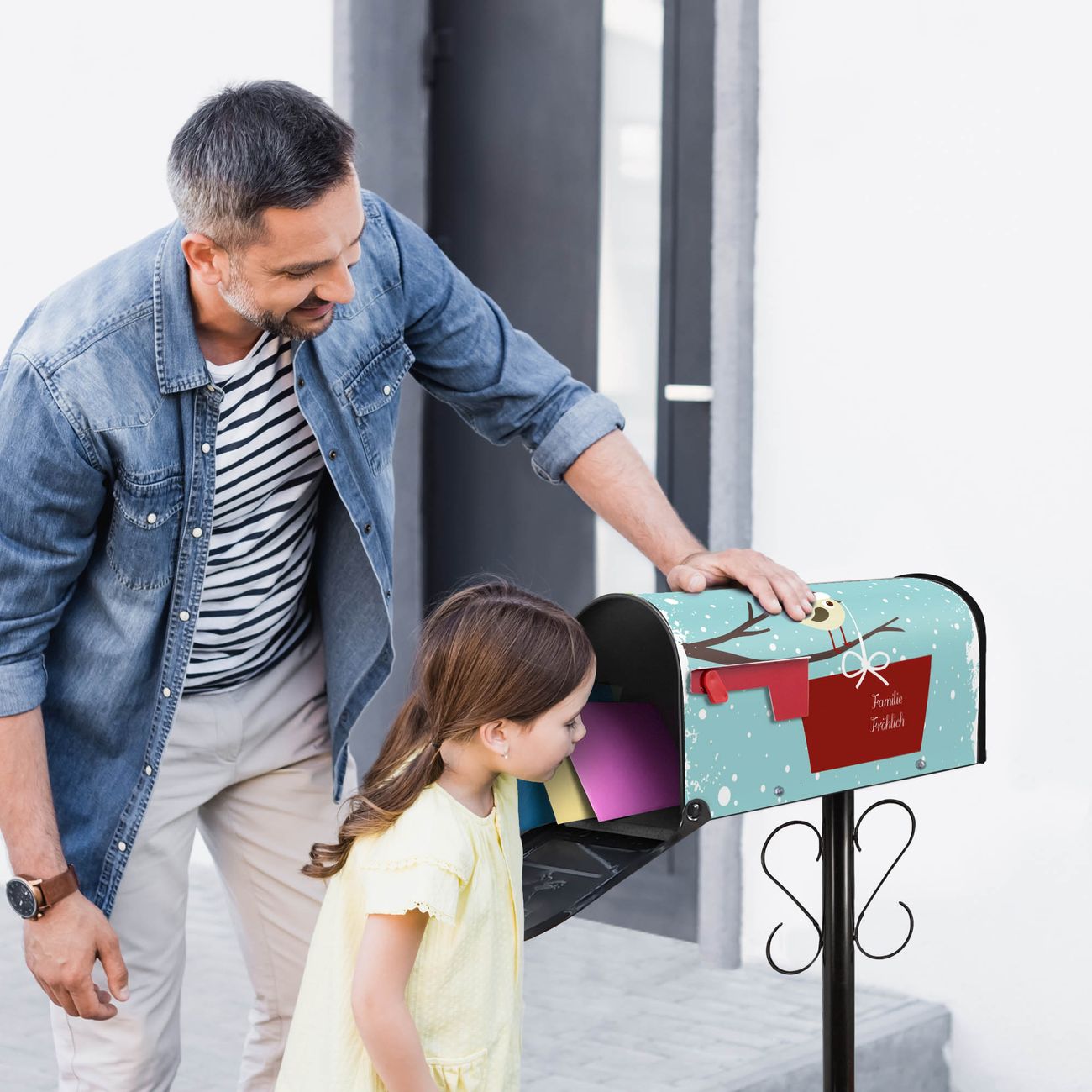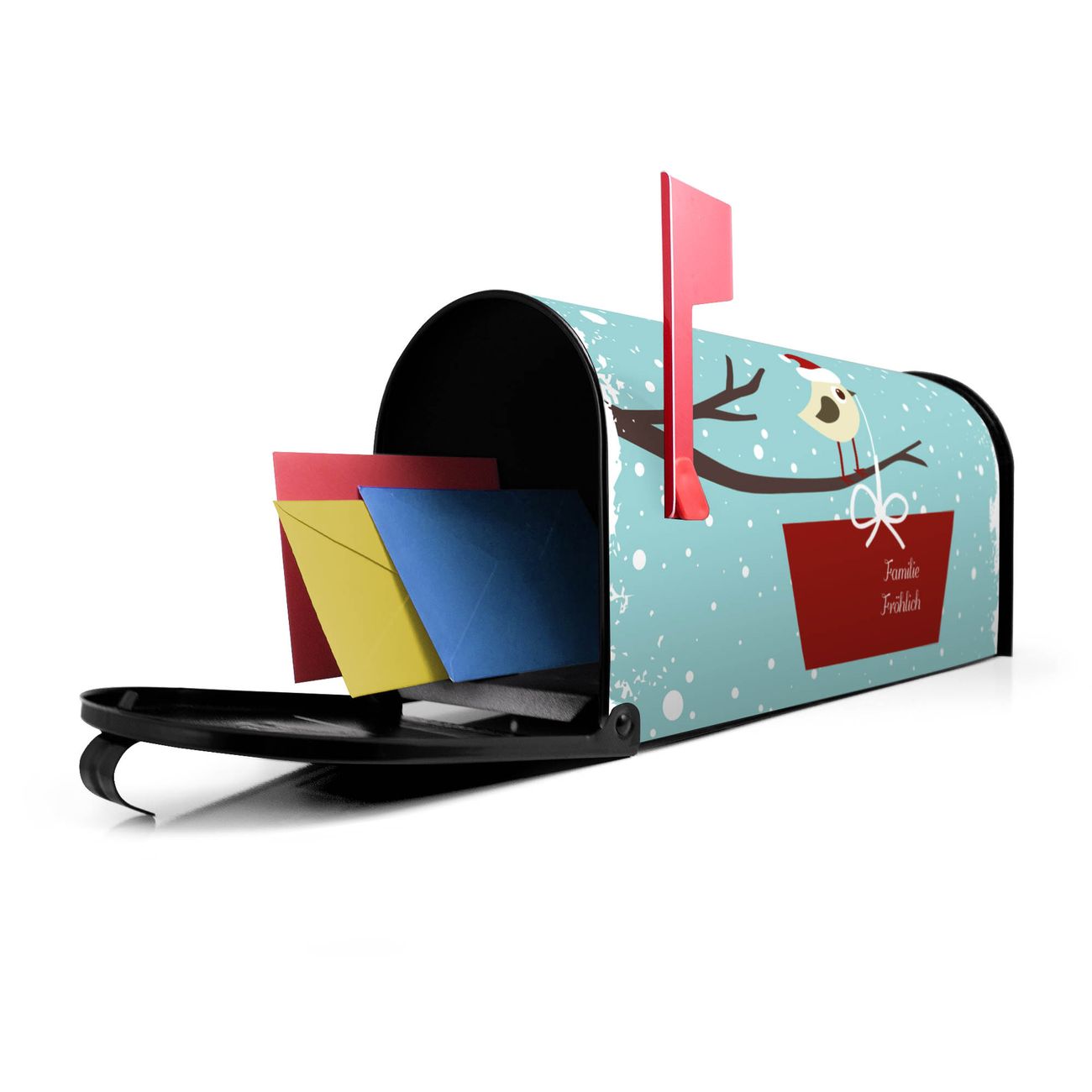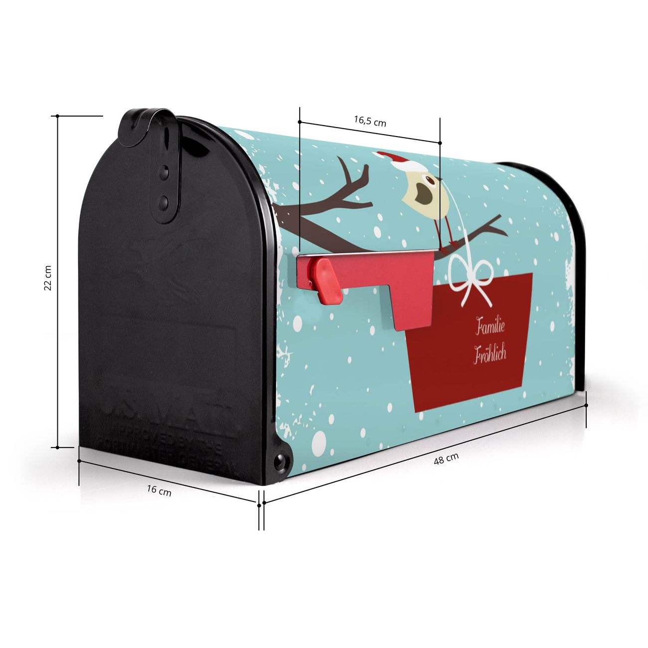 Der amerikanische Briefkasten von banjado mit Weihnachten Motiv bietet Ihnen ausreichend Fassungsvermögen, um große A4 Sendungen und Zeitschriften zu empfangen. Die typisch amerikanische rote Fahne zeigt Ihnen an, wenn Sie Post erhalten haben. Die US-Mailbox besteht aus verzinktem Stahlblech welches lackiert wurde und ist 48 x 22 x 16 CM (BxHxT) groß. Die Folie mit Motiv Weihnachten besteht aus einer wetter- und UV-resistenten Folie, die mit einem Schutzlaminat überzogen ist, sodass die US Mailbox zusätzlich vor Kratzern geschützt ist. An der Unterkante sind 4 Löcher je Seite um die Mailbox, typisch amerikanisch, an einem Holzpfahl oder einem Zaun zu befestigen. Auf Wunsch können Sie bei uns den passenden Standfuß oder die passende Wandhalterung kaufen um die US-Mailbox sicher zu befestigen. Wir bieten Ihnen ebenfalls Namensschilder, bereits beschriftet oder frei zu beschriften, und verschiedene selbst gestaltete Bitte-Keine-Werbung-Aufkleber.