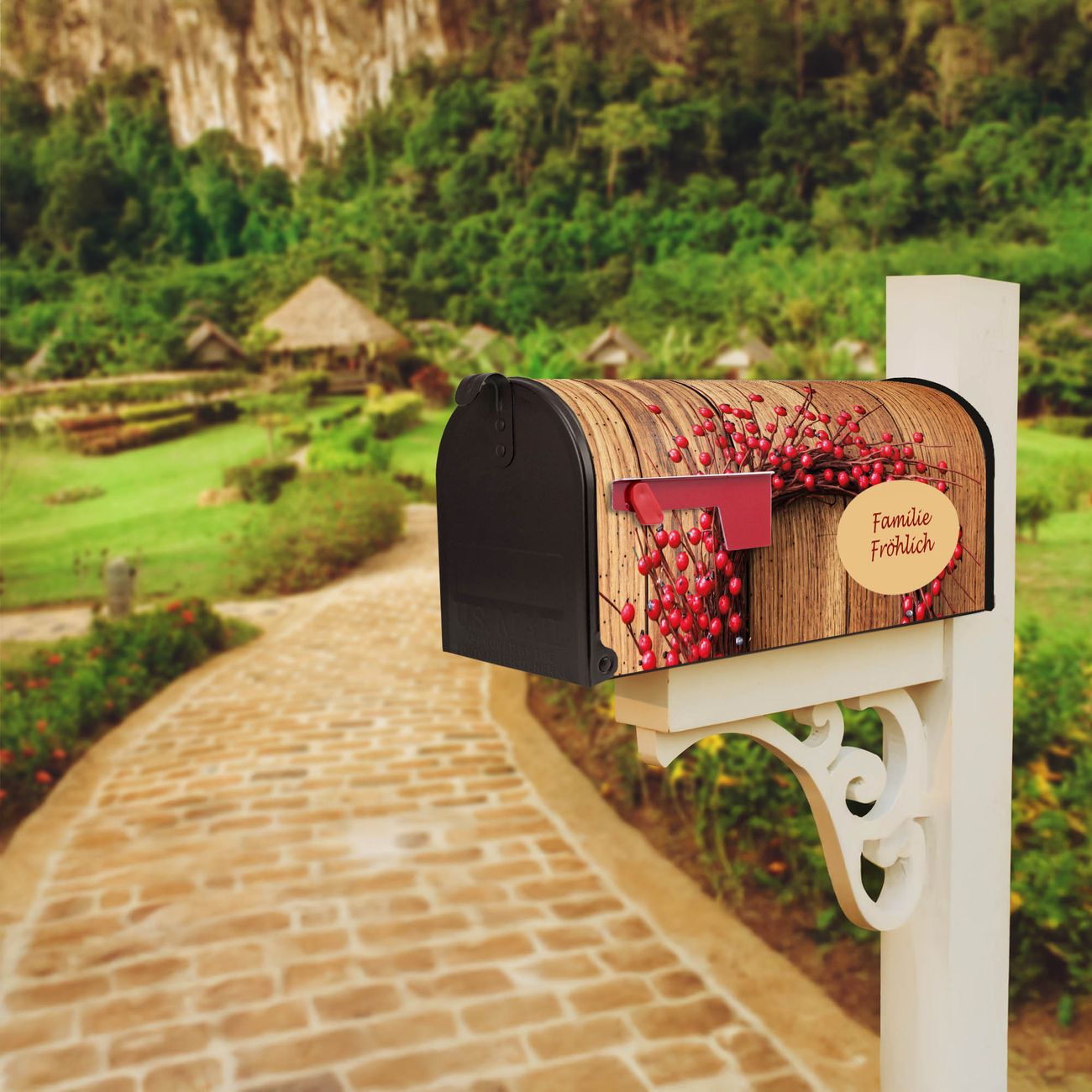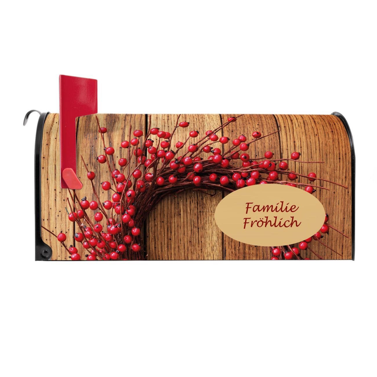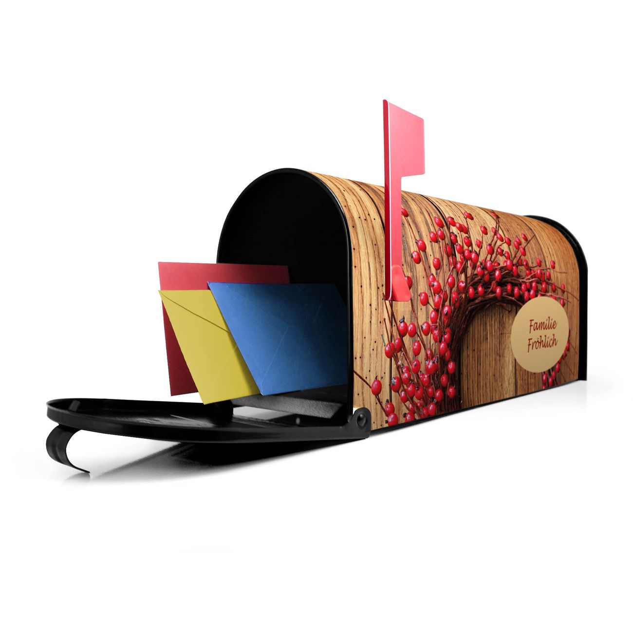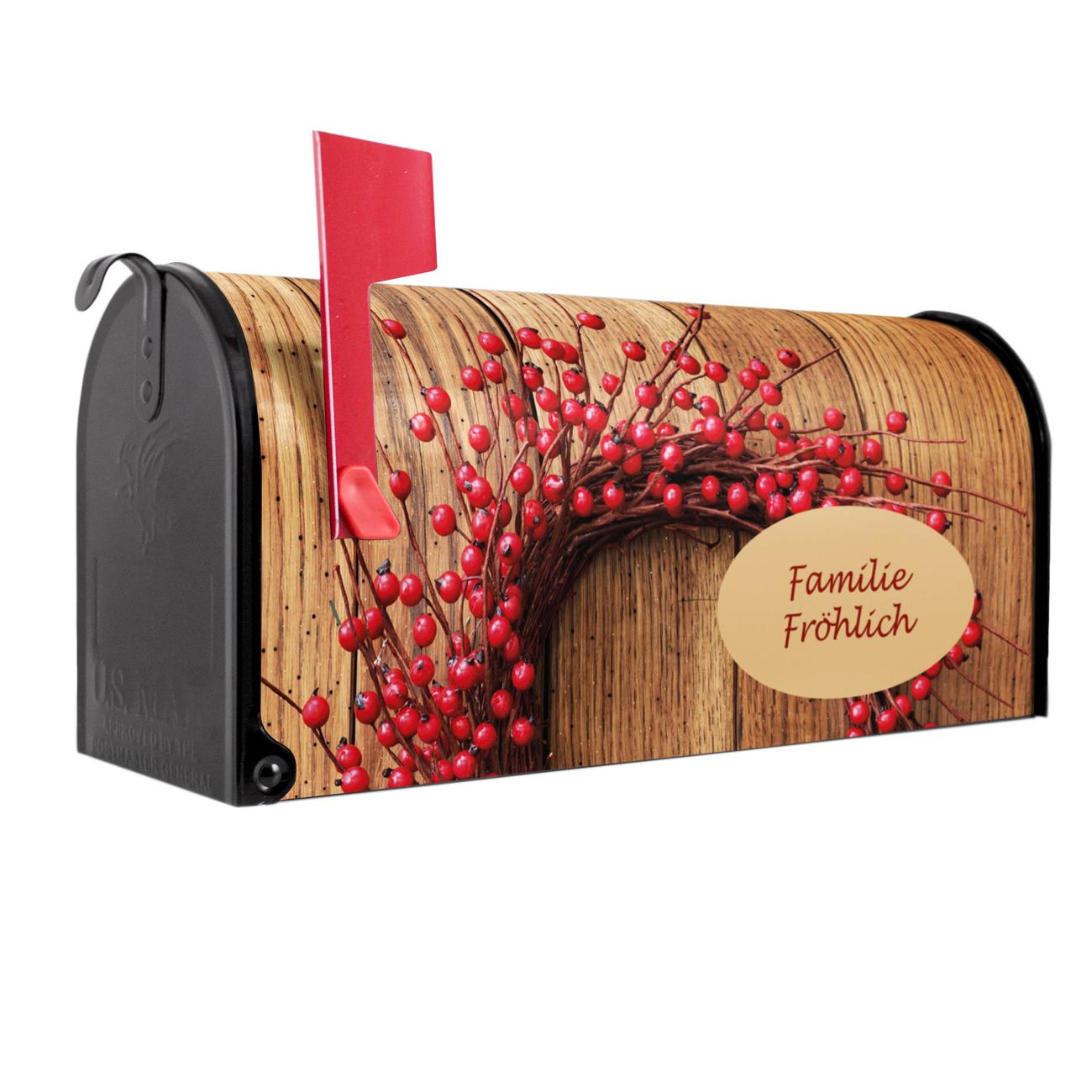 Der amerikanische Briefkasten von banjado mit Weihnachtskranz Motiv bietet Ihnen ausreichend Fassungsvermögen, um große A4 Sendungen und Zeitschriften zu empfangen. Die typisch amerikanische rote Fahne zeigt Ihnen an, wenn Sie Post erhalten haben. Die US-Mailbox besteht aus verzinktem Stahlblech welches lackiert wurde und ist 48 x 22 x 16 CM (BxHxT) groß. Die Folie mit Motiv Weihnachtskranz besteht aus einer wetter- und UV-resistenten Folie, die mit einem Schutzlaminat überzogen ist, sodass die US Mailbox zusätzlich vor Kratzern geschützt ist. An der Unterkante sind 4 Löcher je Seite um die Mailbox, typisch amerikanisch, an einem Holzpfahl oder einem Zaun zu befestigen. Auf Wunsch können Sie bei uns den passenden Standfuß oder die passende Wandhalterung kaufen um die US-Mailbox sicher zu befestigen. Wir bieten Ihnen ebenfalls Namensschilder, bereits beschriftet oder frei zu beschriften, und verschiedene selbst gestaltete Bitte-Keine-Werbung-Aufkleber.