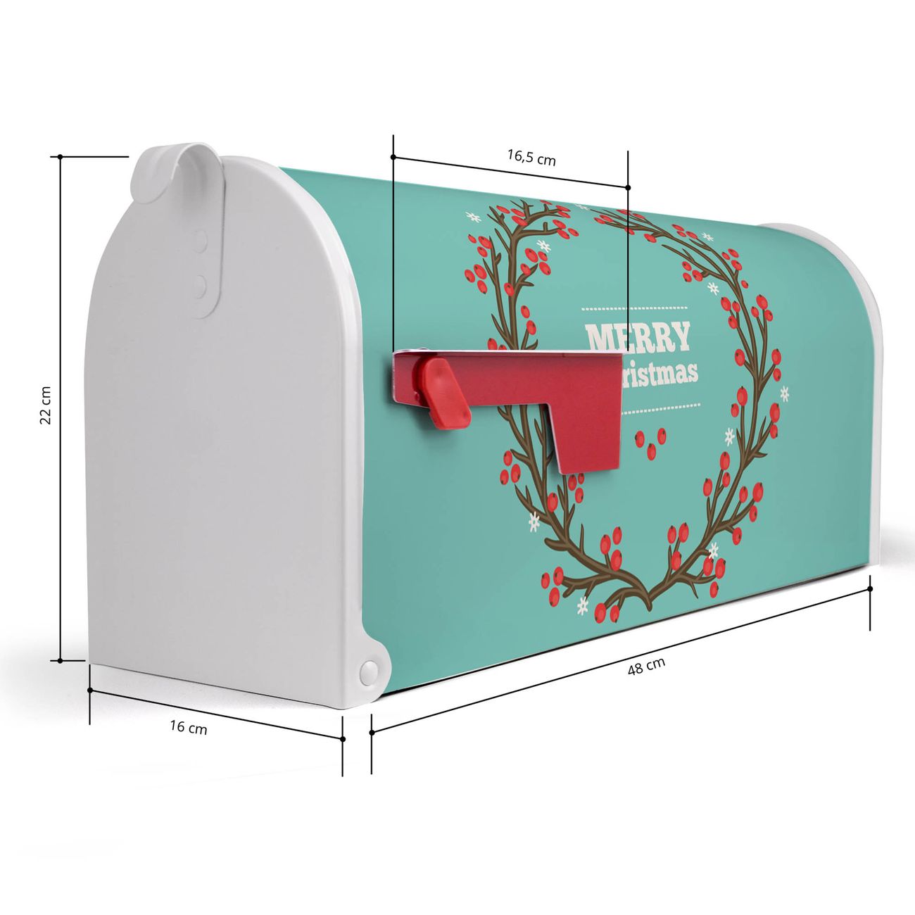 Der amerikanische Briefkasten von banjado mit Weihnachtsranke Motiv bietet Ihnen ausreichend Fassungsvermögen, um große A4 Sendungen und Zeitschriften zu empfangen. Die typisch amerikanische rote Fahne zeigt Ihnen an, wenn Sie Post erhalten haben. Die US-Mailbox besteht aus verzinktem Stahlblech welches lackiert wurde und ist 48 x 22 x 16 CM (BxHxT) groß. Die Folie mit Motiv Weihnachtsranke besteht aus einer wetter- und UV-resistenten Folie, die mit einem Schutzlaminat überzogen ist, sodass die US Mailbox zusätzlich vor Kratzern geschützt ist. An der Unterkante sind 4 Löcher je Seite um die Mailbox, typisch amerikanisch, an einem Holzpfahl oder einem Zaun zu befestigen. Auf Wunsch können Sie bei uns den passenden Standfuß oder die passende Wandhalterung kaufen um die US-Mailbox sicher zu befestigen. Wir bieten Ihnen ebenfalls Namensschilder, bereits beschriftet oder frei zu beschriften, und verschiedene selbst gestaltete Bitte-Keine-Werbung-Aufkleber.