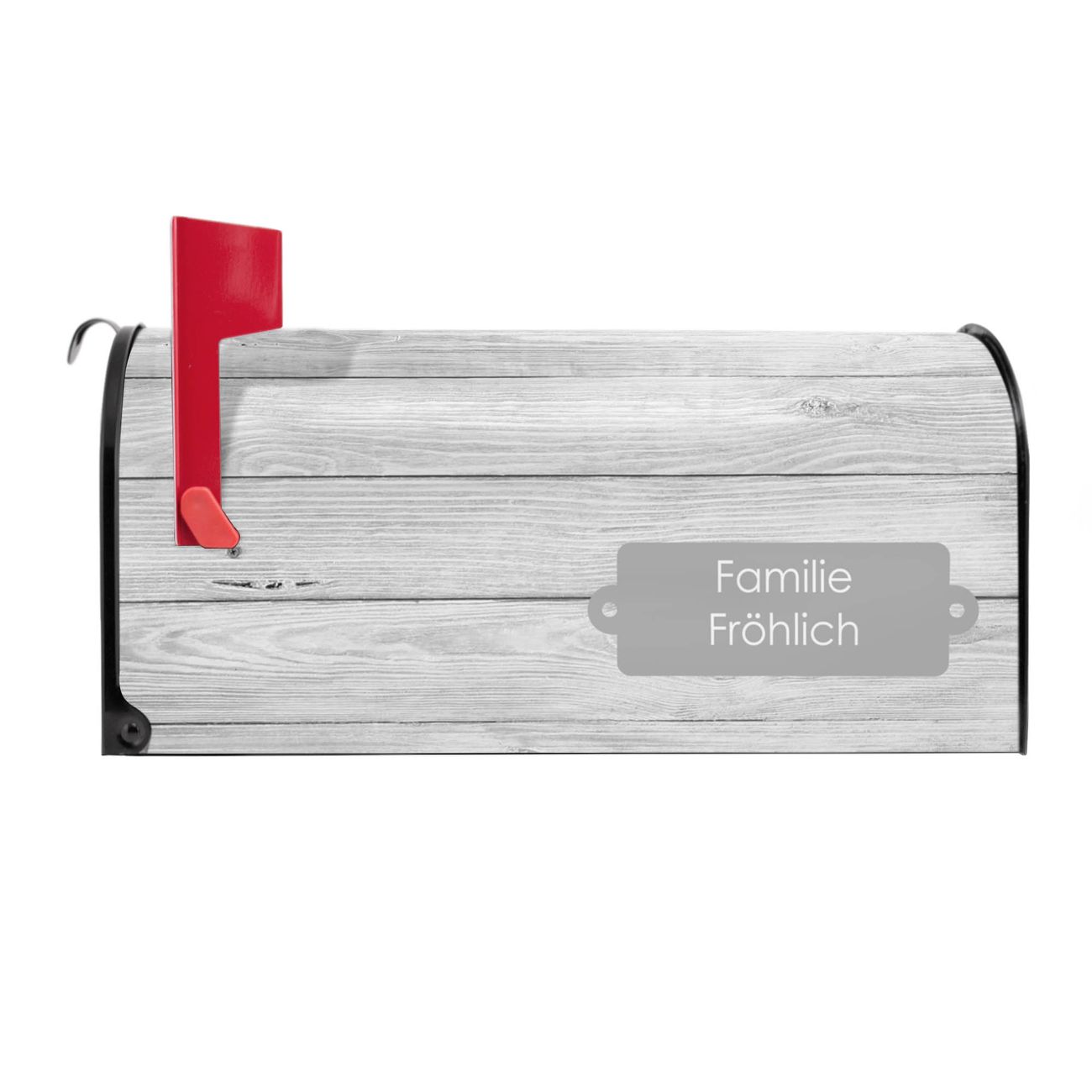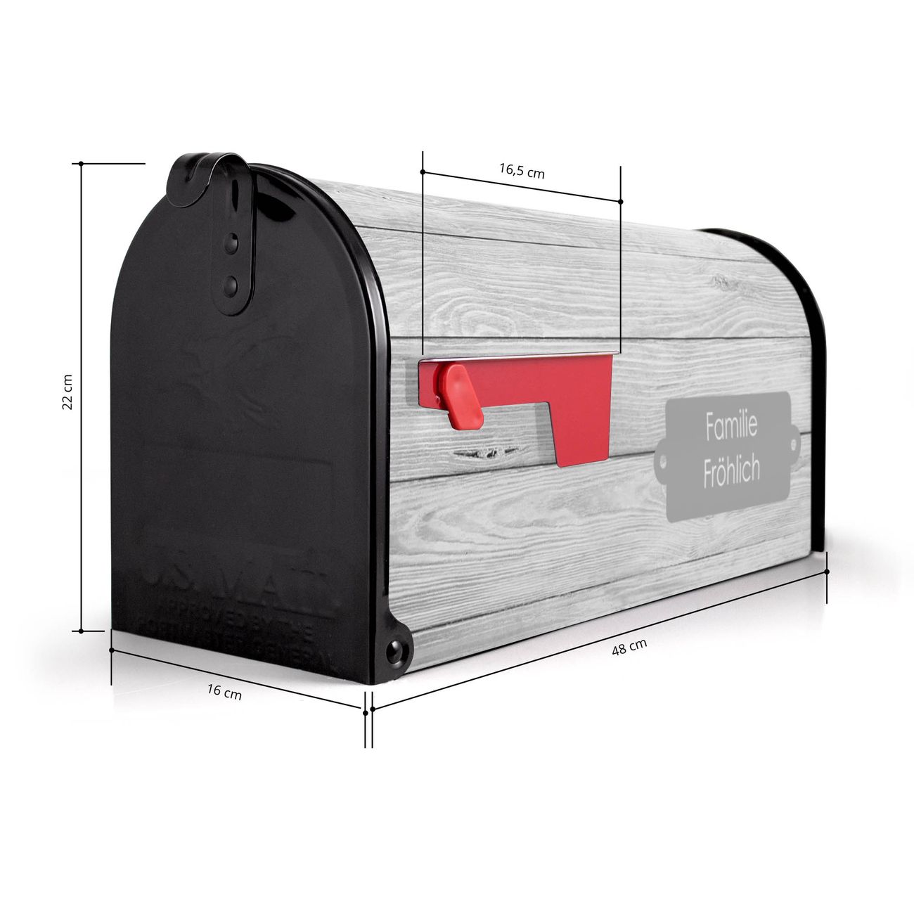 Der amerikanische Briefkasten von banjado mit Weiß Gebeizt Motiv bietet Ihnen ausreichend Fassungsvermögen, um große A4 Sendungen und Zeitschriften zu empfangen. Die typisch amerikanische rote Fahne zeigt Ihnen an, wenn Sie Post erhalten haben. Die US-Mailbox besteht aus verzinktem Stahlblech welches lackiert wurde und ist 48 x 22 x 16 CM (BxHxT) groß. Die Folie mit Motiv Weiß Gebeizt besteht aus einer wetter- und UV-resistenten Folie, die mit einem Schutzlaminat überzogen ist, sodass die US Mailbox zusätzlich vor Kratzern geschützt ist. An der Unterkante sind 4 Löcher je Seite um die Mailbox, typisch amerikanisch, an einem Holzpfahl oder einem Zaun zu befestigen. Auf Wunsch können Sie bei uns den passenden Standfuß oder die passende Wandhalterung kaufen um die US-Mailbox sicher zu befestigen. Wir bieten Ihnen ebenfalls Namensschilder, bereits beschriftet oder frei zu beschriften, und verschiedene selbst gestaltete Bitte-Keine-Werbung-Aufkleber.