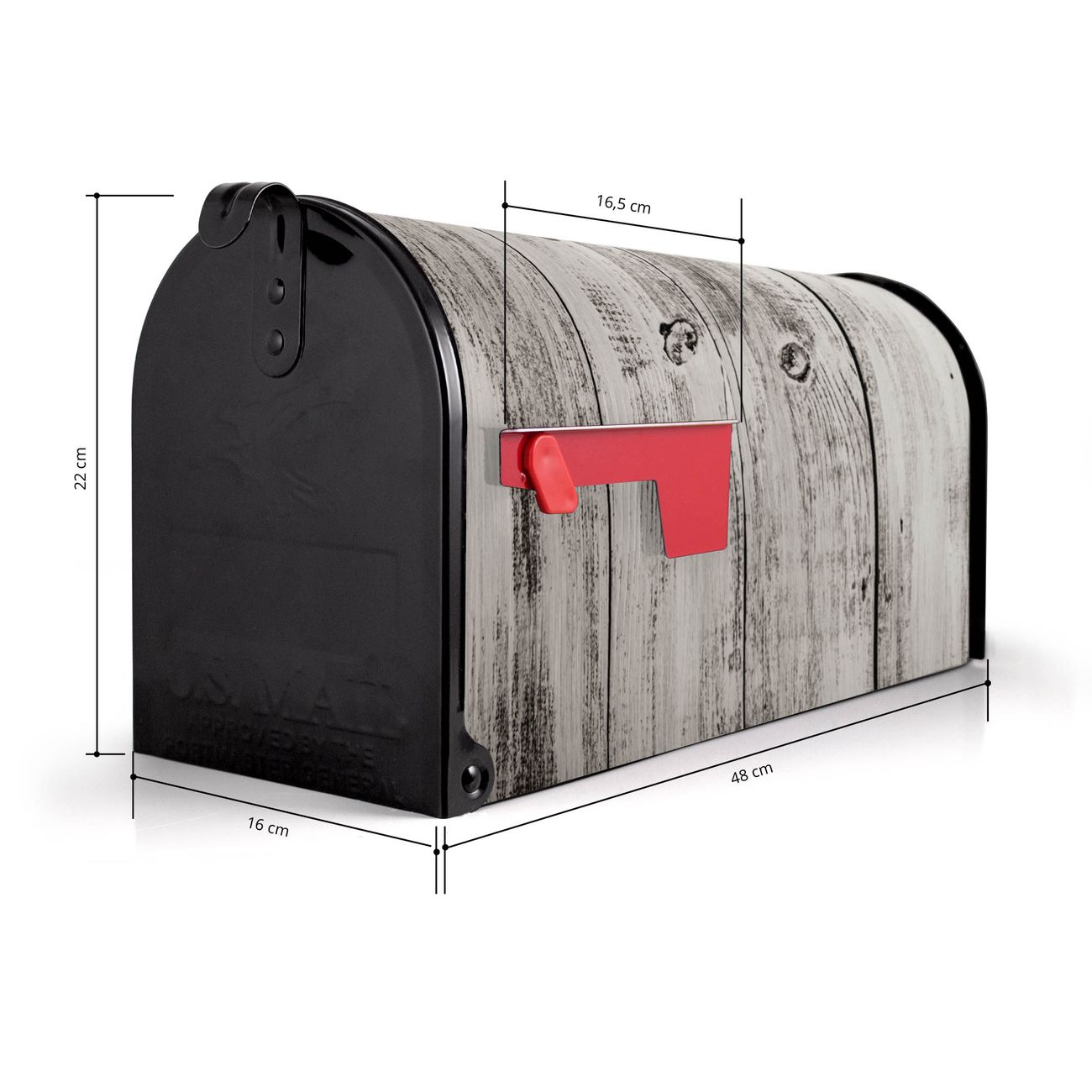 Der amerikanische Briefkasten von banjado mit weiße Bretter Motiv bietet Ihnen ausreichend Fassungsvermögen, um große A4 Sendungen und Zeitschriften zu empfangen. Die typisch amerikanische rote Fahne zeigt Ihnen an, wenn Sie Post erhalten haben. Die US-Mailbox besteht aus verzinktem Stahlblech welches lackiert wurde und ist 48 x 22 x 16 CM (BxHxT) groß. Die Folie mit Motiv weiße Bretter besteht aus einer wetter- und UV-resistenten Folie, die mit einem Schutzlaminat überzogen ist, sodass die US Mailbox zusätzlich vor Kratzern geschützt ist. An der Unterkante sind 4 Löcher je Seite um die Mailbox, typisch amerikanisch, an einem Holzpfahl oder einem Zaun zu befestigen. Auf Wunsch können Sie bei uns den passenden Standfuß oder die passende Wandhalterung kaufen um die US-Mailbox sicher zu befestigen. Wir bieten Ihnen ebenfalls Namensschilder, bereits beschriftet oder frei zu beschriften, und verschiedene selbst gestaltete Bitte-Keine-Werbung-Aufkleber.
