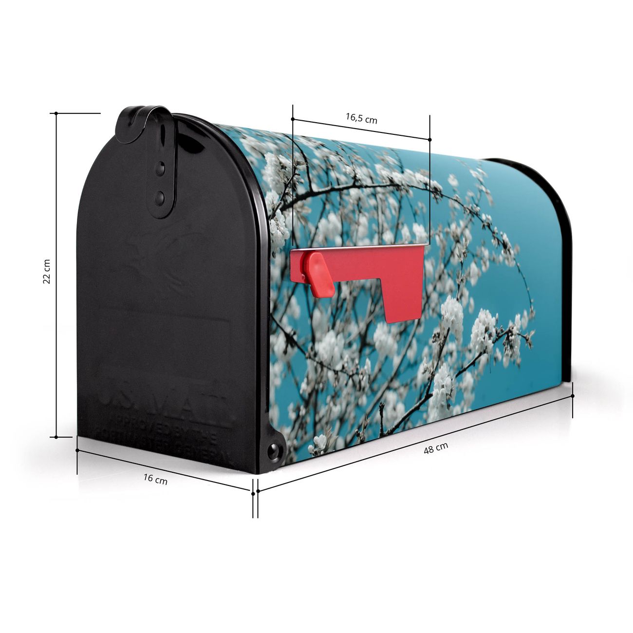Der amerikanische Briefkasten von banjado mit weiße Kirschblüten Motiv bietet Ihnen ausreichend Fassungsvermögen, um große A4 Sendungen und Zeitschriften zu empfangen. Die typisch amerikanische rote Fahne zeigt Ihnen an, wenn Sie Post erhalten haben. Die US-Mailbox besteht aus verzinktem Stahlblech welches lackiert wurde und ist 48 x 22 x 16 CM (BxHxT) groß. Die Folie mit Motiv weiße Kirschblüten besteht aus einer wetter- und UV-resistenten Folie, die mit einem Schutzlaminat überzogen ist, sodass die US Mailbox zusätzlich vor Kratzern geschützt ist. An der Unterkante sind 4 Löcher je Seite um die Mailbox, typisch amerikanisch, an einem Holzpfahl oder einem Zaun zu befestigen. Auf Wunsch können Sie bei uns den passenden Standfuß oder die passende Wandhalterung kaufen um die US-Mailbox sicher zu befestigen. Wir bieten Ihnen ebenfalls Namensschilder, bereits beschriftet oder frei zu beschriften, und verschiedene selbst gestaltete Bitte-Keine-Werbung-Aufkleber.