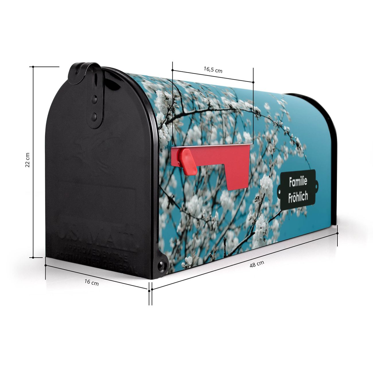 Der amerikanische Briefkasten von banjado mit weiße Kirschblüten Motiv bietet Ihnen ausreichend Fassungsvermögen, um große A4 Sendungen und Zeitschriften zu empfangen. Die typisch amerikanische rote Fahne zeigt Ihnen an, wenn Sie Post erhalten haben. Die US-Mailbox besteht aus verzinktem Stahlblech welches lackiert wurde und ist 48 x 22 x 16 CM (BxHxT) groß. Die Folie mit Motiv weiße Kirschblüten besteht aus einer wetter- und UV-resistenten Folie, die mit einem Schutzlaminat überzogen ist, sodass die US Mailbox zusätzlich vor Kratzern geschützt ist. An der Unterkante sind 4 Löcher je Seite um die Mailbox, typisch amerikanisch, an einem Holzpfahl oder einem Zaun zu befestigen. Auf Wunsch können Sie bei uns den passenden Standfuß oder die passende Wandhalterung kaufen um die US-Mailbox sicher zu befestigen. Wir bieten Ihnen ebenfalls Namensschilder, bereits beschriftet oder frei zu beschriften, und verschiedene selbst gestaltete Bitte-Keine-Werbung-Aufkleber.