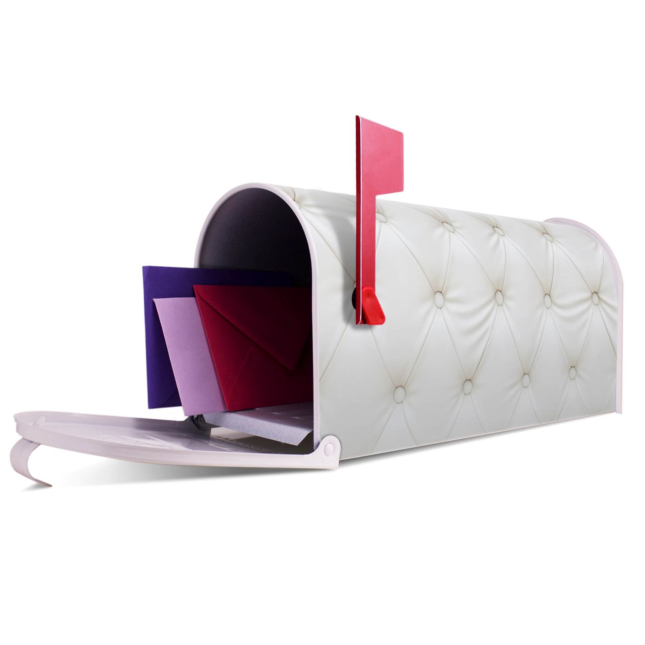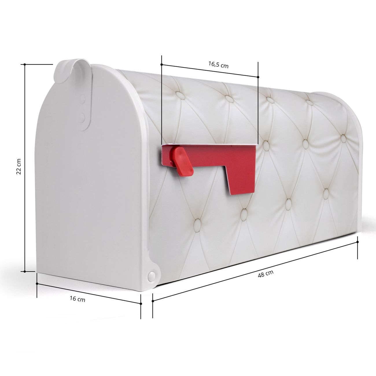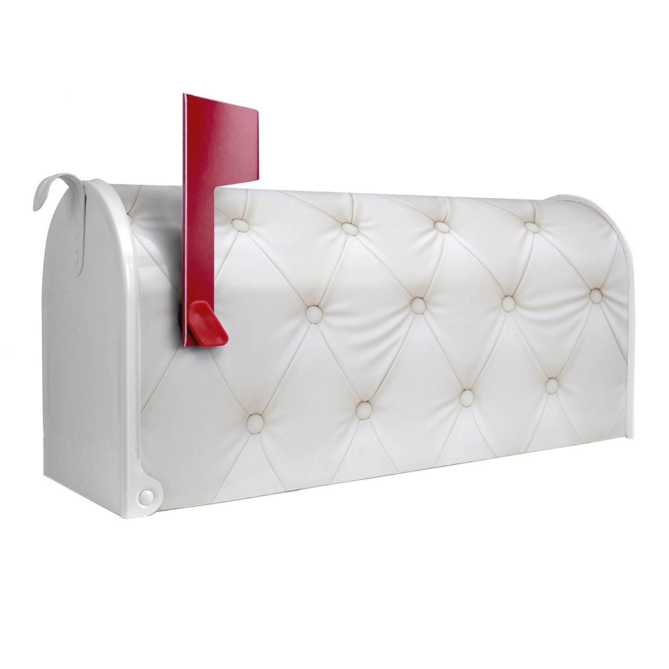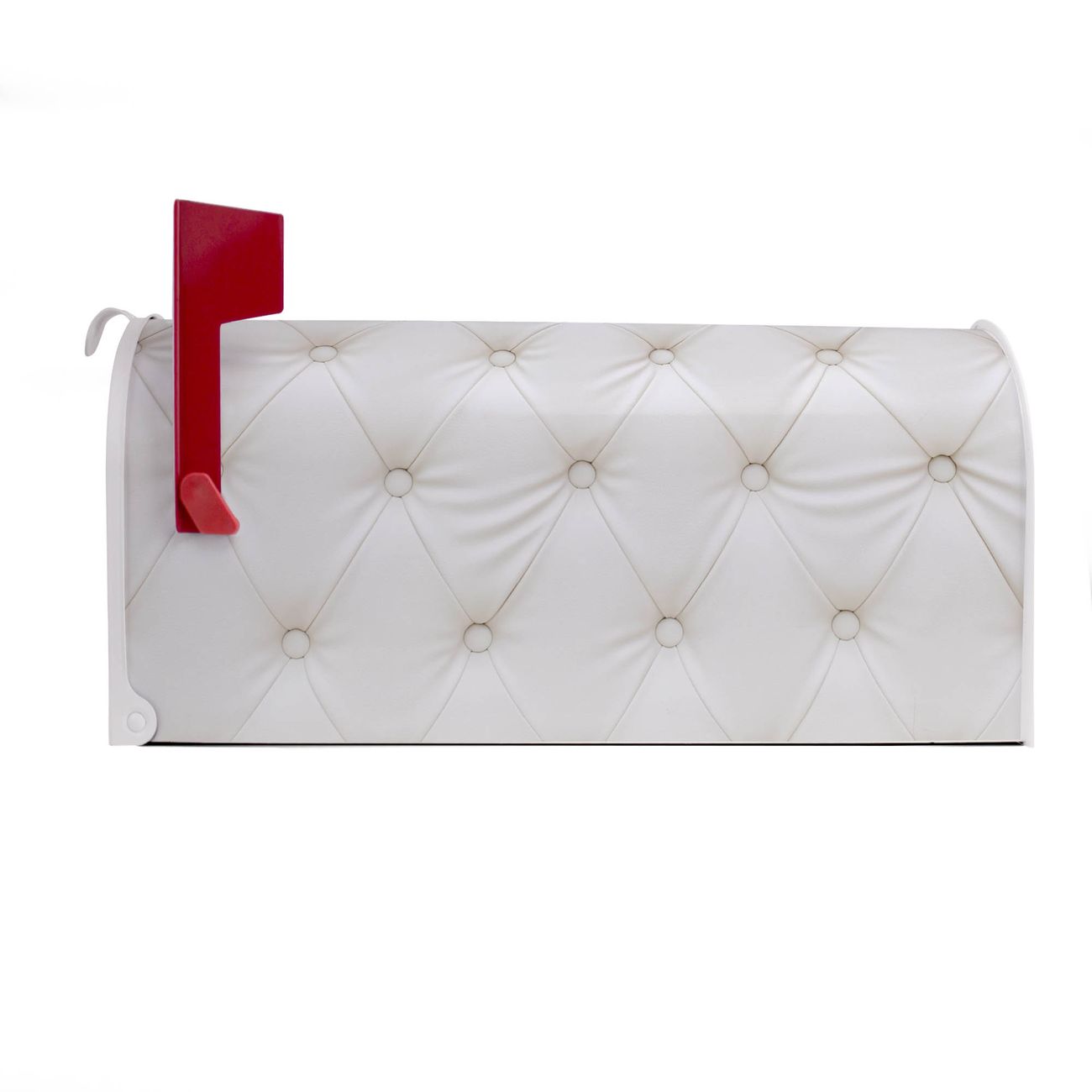 Der amerikanische Briefkasten von banjado mit Weißes Polster Motiv bietet Ihnen ausreichend Fassungsvermögen, um große A4 Sendungen und Zeitschriften zu empfangen. Die typisch amerikanische rote Fahne zeigt Ihnen an, wenn Sie Post erhalten haben. Die US-Mailbox besteht aus verzinktem Stahlblech welches lackiert wurde und ist 48 x 22 x 16 CM (BxHxT) groß. Die Folie mit Motiv Weißes Polster besteht aus einer wetter- und UV-resistenten Folie, die mit einem Schutzlaminat überzogen ist, sodass die US Mailbox zusätzlich vor Kratzern geschützt ist. An der Unterkante sind 4 Löcher je Seite um die Mailbox, typisch amerikanisch, an einem Holzpfahl oder einem Zaun zu befestigen. Auf Wunsch können Sie bei uns den passenden Standfuß oder die passende Wandhalterung kaufen um die US-Mailbox sicher zu befestigen. Wir bieten Ihnen ebenfalls Namensschilder, bereits beschriftet oder frei zu beschriften, und verschiedene selbst gestaltete Bitte-Keine-Werbung-Aufkleber.