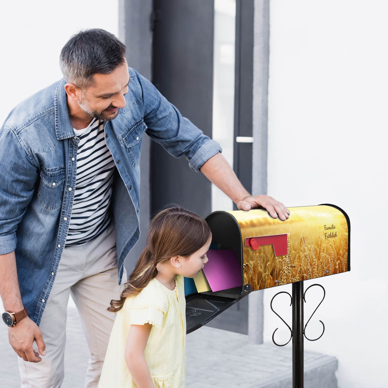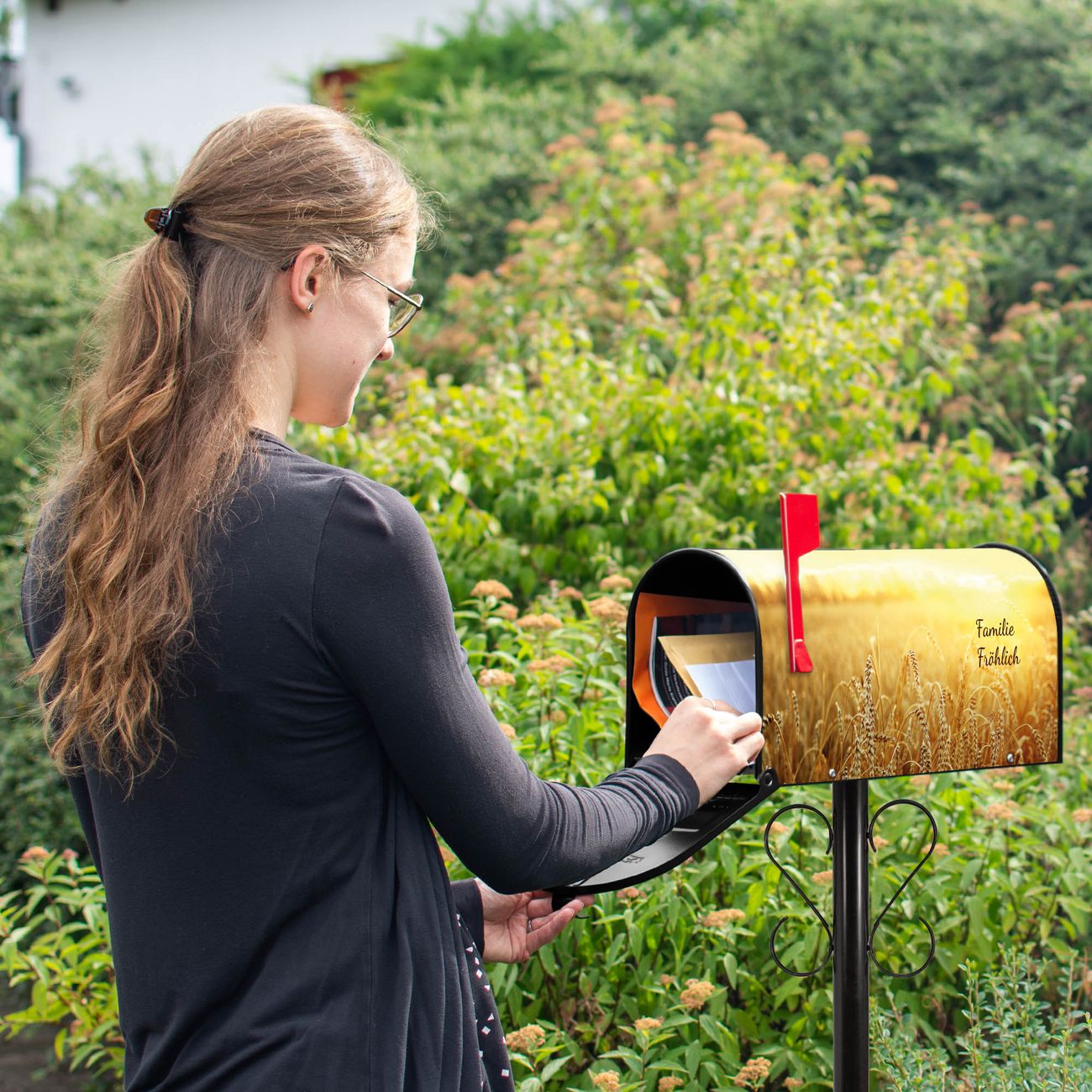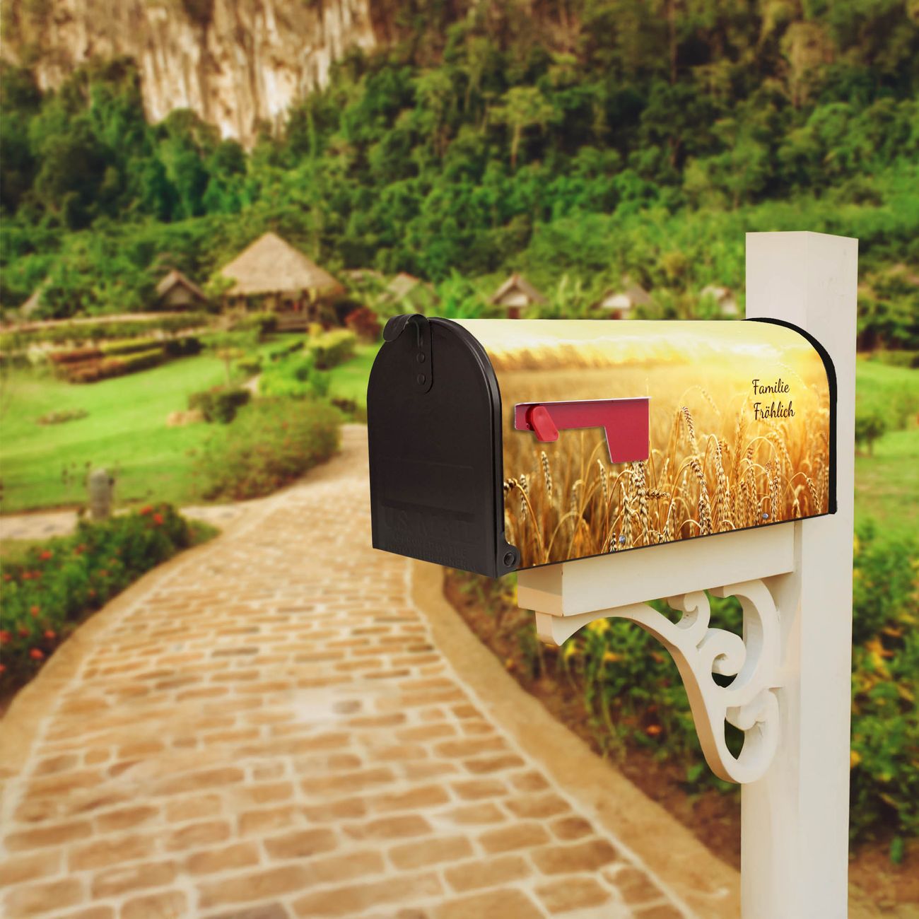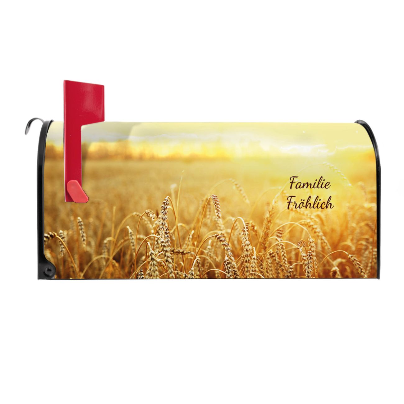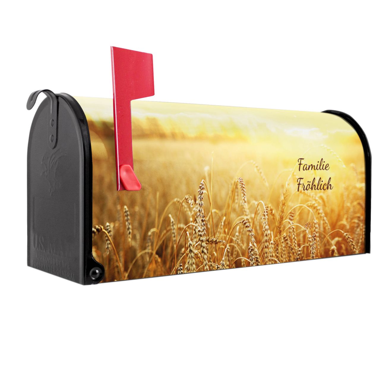 Unser amerikanischer Briefkasten mit dem Motiv Weizenfeld hat ein sehr ansprechendes und ausgefallenes Design, ist in der Grundfarbe weiß, grün oder schwarz erhältlich. Damit entlocken Sie Ihren Nachbarn und dem Postboten immer wieder ein Lächeln. Die Mailbox ist ein Original Import aus Mississippi USA und wird von unserer kleinen Manufaktur in Sachsen von Hand veredelt. Die US-Mailbox bietet ausreichend Platz auch für große Sendungen, eine Fahne die Ihnen Post anzeigt, wetterfestes und äußerst stabiles Material - so macht Post empfangen Freude.