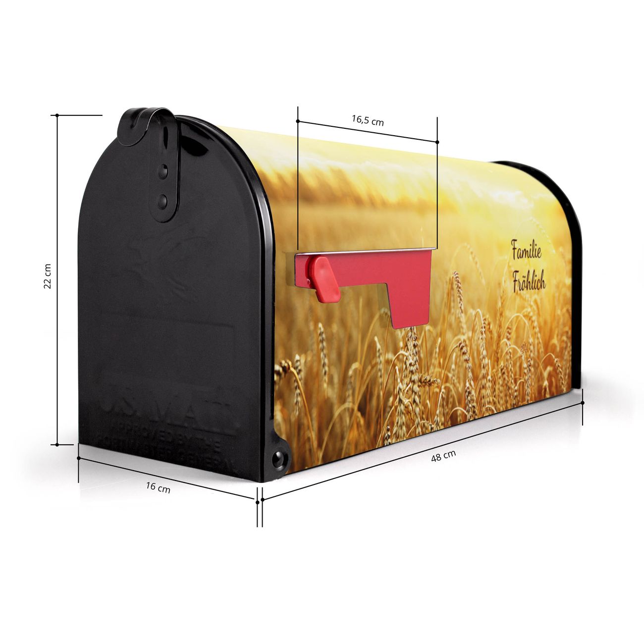 Der amerikanische Briefkasten von banjado mit Weizenfeld Motiv bietet Ihnen ausreichend Fassungsvermögen, um große A4 Sendungen und Zeitschriften zu empfangen. Die typisch amerikanische rote Fahne zeigt Ihnen an, wenn Sie Post erhalten haben. Die US-Mailbox besteht aus verzinktem Stahlblech welches lackiert wurde und ist 48 x 22 x 16 CM (BxHxT) groß. Die Folie mit Motiv Weizenfeld besteht aus einer wetter- und UV-resistenten Folie, die mit einem Schutzlaminat überzogen ist, sodass die US Mailbox zusätzlich vor Kratzern geschützt ist. An der Unterkante sind 4 Löcher je Seite um die Mailbox, typisch amerikanisch, an einem Holzpfahl oder einem Zaun zu befestigen. Auf Wunsch können Sie bei uns den passenden Standfuß oder die passende Wandhalterung kaufen um die US-Mailbox sicher zu befestigen. Wir bieten Ihnen ebenfalls Namensschilder, bereits beschriftet oder frei zu beschriften, und verschiedene selbst gestaltete Bitte-Keine-Werbung-Aufkleber.