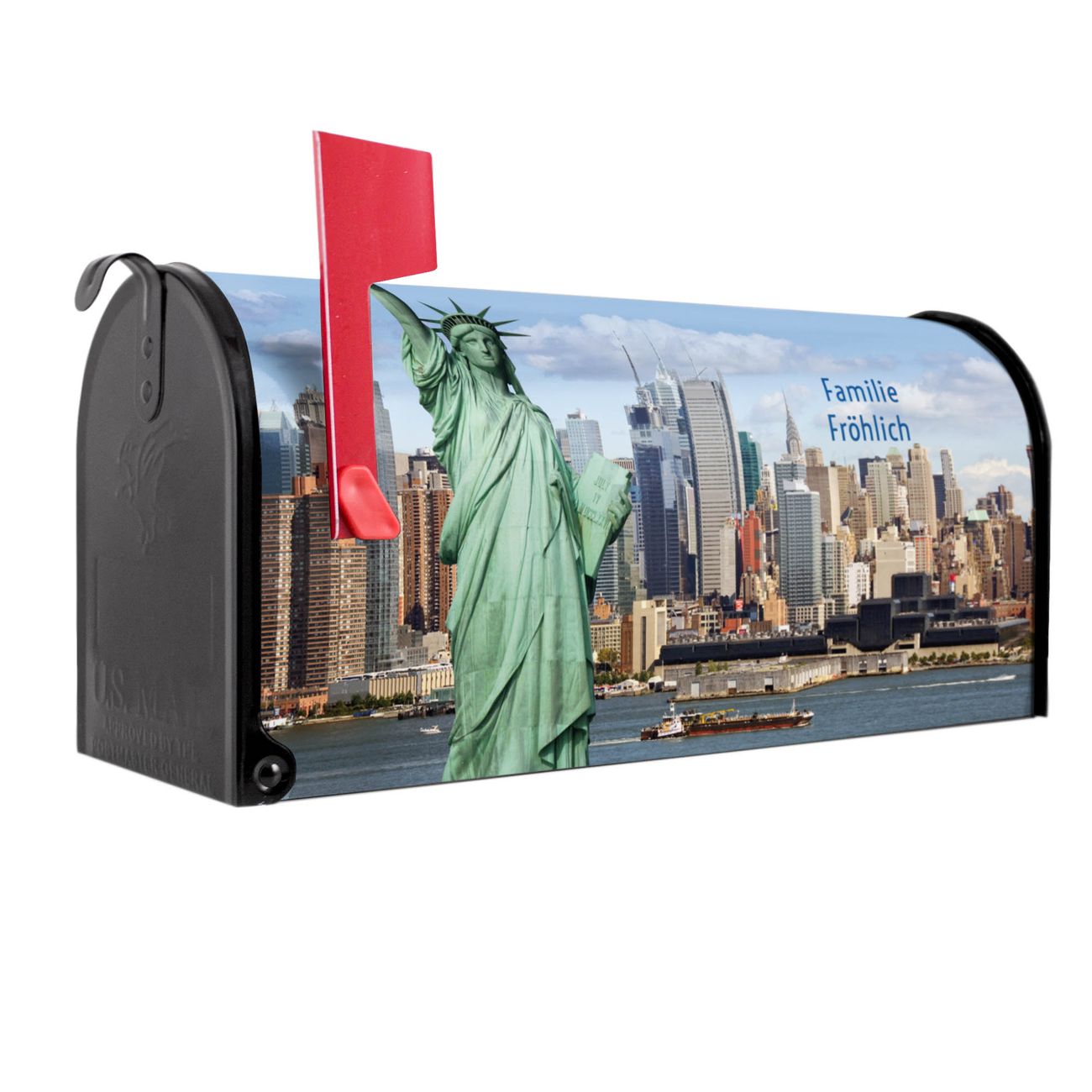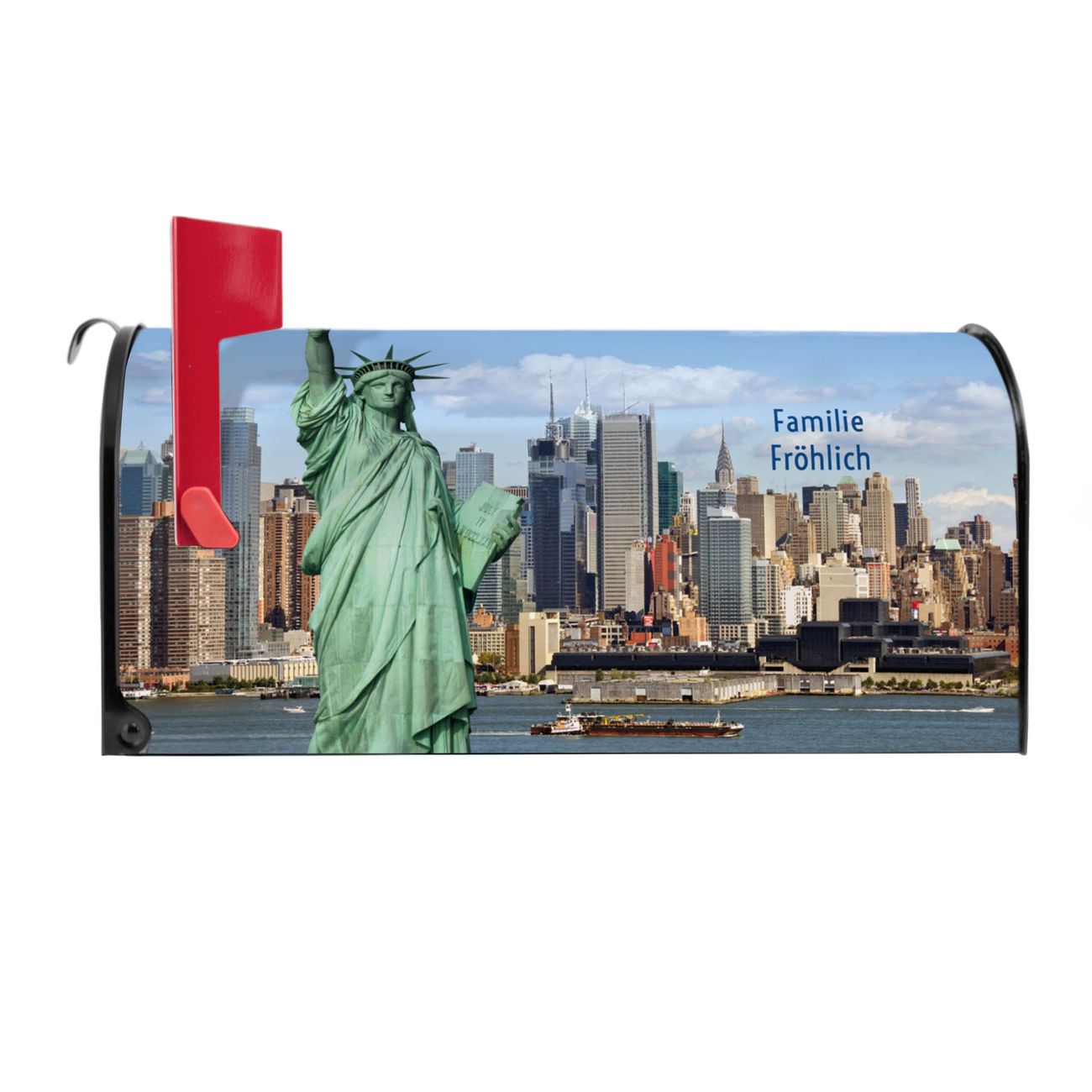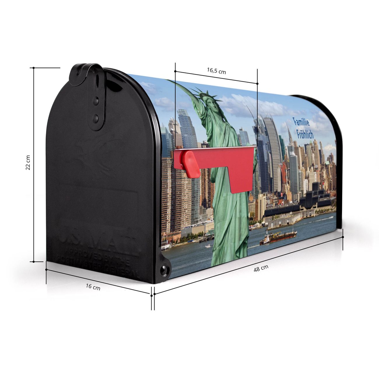 Der amerikanische Briefkasten von banjado mit Welcome To NY Motiv bietet Ihnen ausreichend Fassungsvermögen, um große A4 Sendungen und Zeitschriften zu empfangen. Die typisch amerikanische rote Fahne zeigt Ihnen an, wenn Sie Post erhalten haben. Die US-Mailbox besteht aus verzinktem Stahlblech welches lackiert wurde und ist 48 x 22 x 16 CM (BxHxT) groß. Die Folie mit Motiv Welcome To NY besteht aus einer wetter- und UV-resistenten Folie, die mit einem Schutzlaminat überzogen ist, sodass die US Mailbox zusätzlich vor Kratzern geschützt ist. An der Unterkante sind 4 Löcher je Seite um die Mailbox, typisch amerikanisch, an einem Holzpfahl oder einem Zaun zu befestigen. Auf Wunsch können Sie bei uns den passenden Standfuß oder die passende Wandhalterung kaufen um die US-Mailbox sicher zu befestigen. Wir bieten Ihnen ebenfalls Namensschilder, bereits beschriftet oder frei zu beschriften, und verschiedene selbst gestaltete Bitte-Keine-Werbung-Aufkleber.
