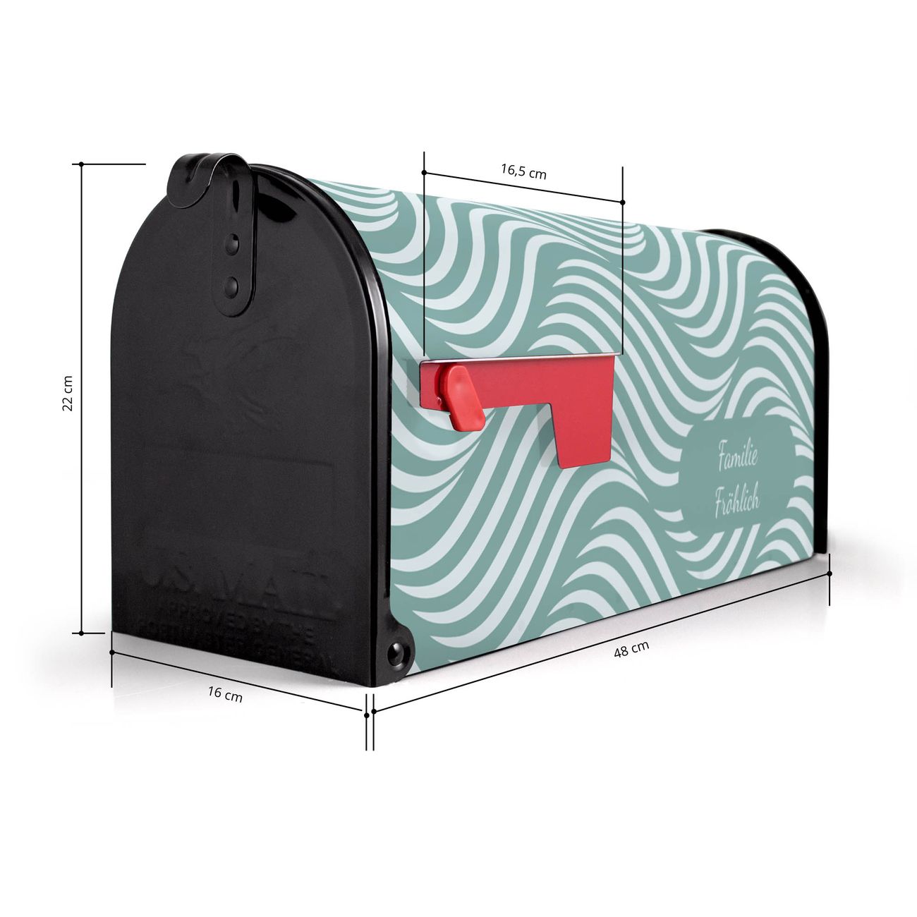 Der amerikanische Briefkasten von banjado mit Wellen Lindgrün Motiv bietet Ihnen ausreichend Fassungsvermögen, um große A4 Sendungen und Zeitschriften zu empfangen. Die typisch amerikanische rote Fahne zeigt Ihnen an, wenn Sie Post erhalten haben. Die US-Mailbox besteht aus verzinktem Stahlblech welches lackiert wurde und ist 48 x 22 x 16 CM (BxHxT) groß. Die Folie mit Motiv Wellen Lindgrün besteht aus einer wetter- und UV-resistenten Folie, die mit einem Schutzlaminat überzogen ist, sodass die US Mailbox zusätzlich vor Kratzern geschützt ist. An der Unterkante sind 4 Löcher je Seite um die Mailbox, typisch amerikanisch, an einem Holzpfahl oder einem Zaun zu befestigen. Auf Wunsch können Sie bei uns den passenden Standfuß oder die passende Wandhalterung kaufen um die US-Mailbox sicher zu befestigen. Wir bieten Ihnen ebenfalls Namensschilder, bereits beschriftet oder frei zu beschriften, und verschiedene selbst gestaltete Bitte-Keine-Werbung-Aufkleber.
