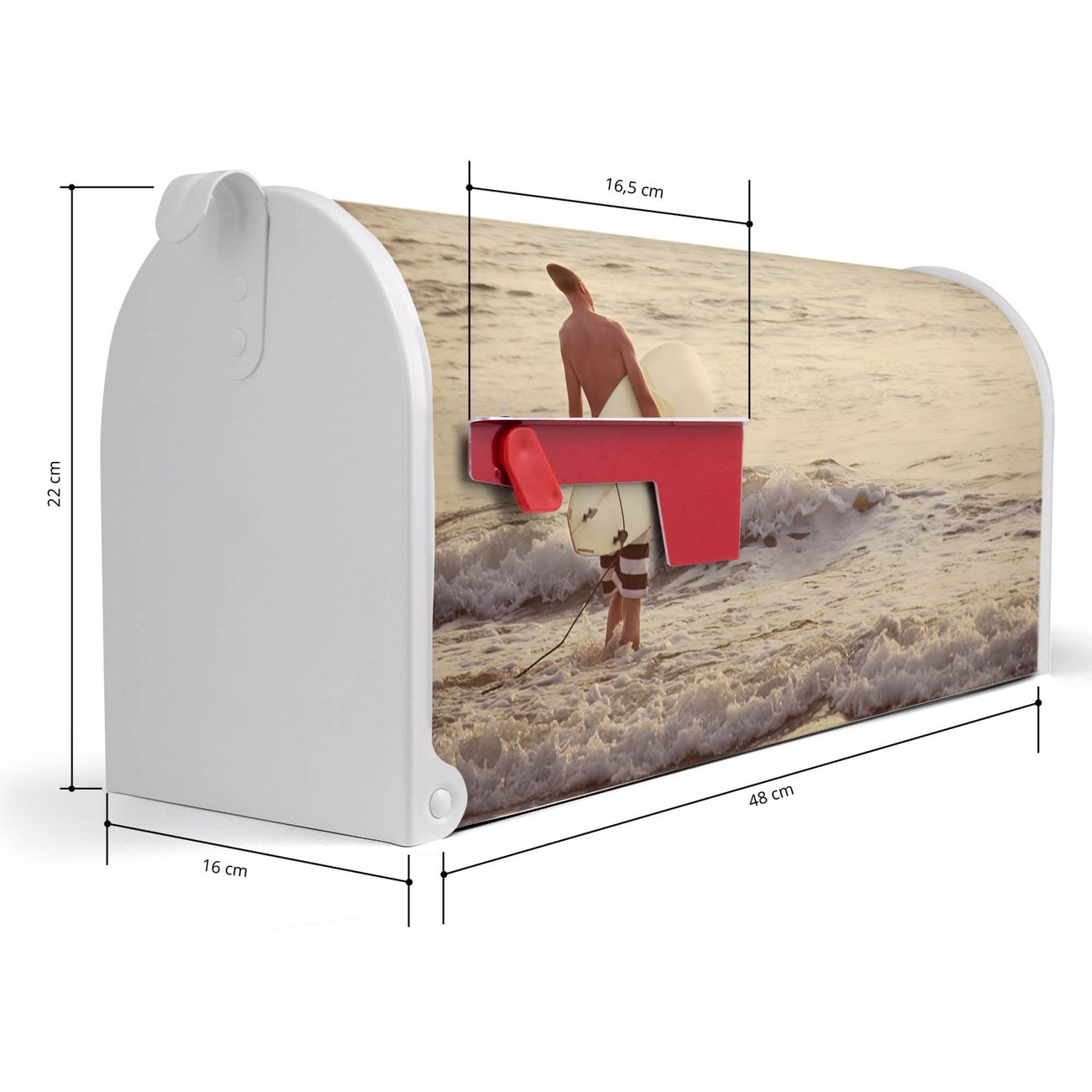 Der amerikanische Briefkasten von banjado mit Wellenreiten Gehen 2 Motiv bietet Ihnen ausreichend Fassungsvermögen, um große A4 Sendungen und Zeitschriften zu empfangen. Die typisch amerikanische rote Fahne zeigt Ihnen an, wenn Sie Post erhalten haben. Die US-Mailbox besteht aus verzinktem Stahlblech welches lackiert wurde und ist 48 x 22 x 16 CM (BxHxT) groß. Die Folie mit Motiv Wellenreiten Gehen 2 besteht aus einer wetter- und UV-resistenten Folie, die mit einem Schutzlaminat überzogen ist, sodass die US Mailbox zusätzlich vor Kratzern geschützt ist. An der Unterkante sind 4 Löcher je Seite um die Mailbox, typisch amerikanisch, an einem Holzpfahl oder einem Zaun zu befestigen. Auf Wunsch können Sie bei uns den passenden Standfuß oder die passende Wandhalterung kaufen um die US-Mailbox sicher zu befestigen. Wir bieten Ihnen ebenfalls Namensschilder, bereits beschriftet oder frei zu beschriften, und verschiedene selbst gestaltete Bitte-Keine-Werbung-Aufkleber.