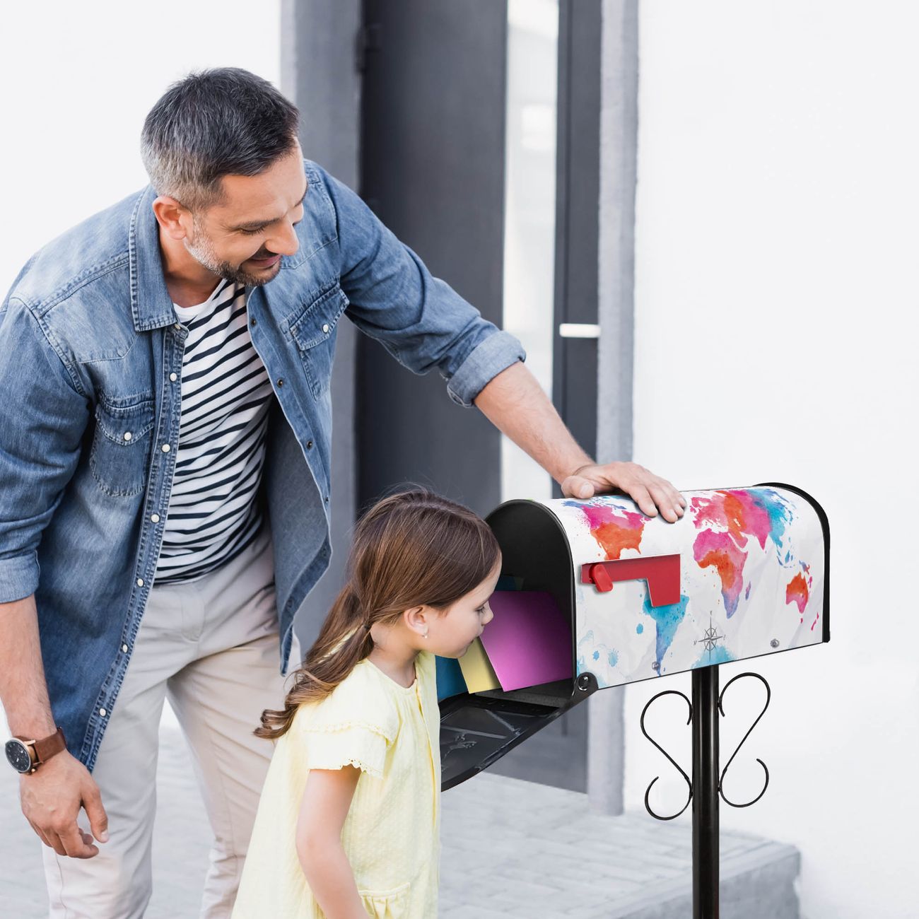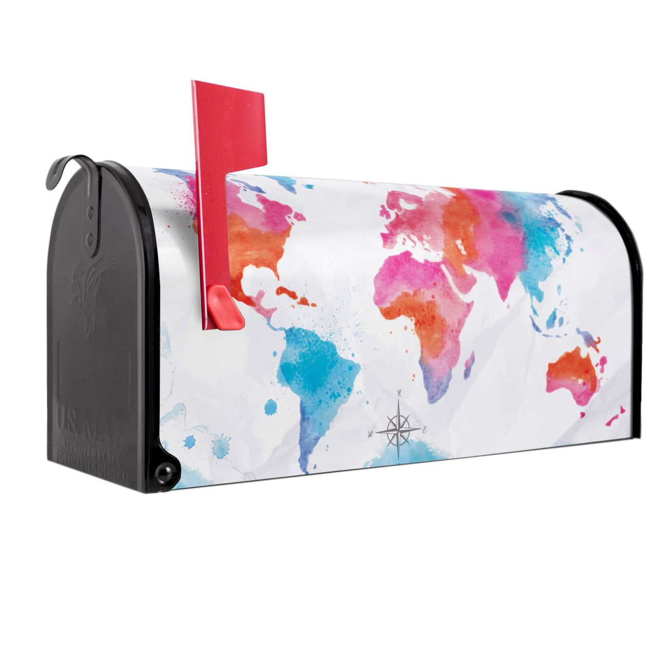 Der amerikanische Briefkasten von banjado mit Weltkarte pastell Motiv bietet Ihnen ausreichend Fassungsvermögen, um große A4 Sendungen und Zeitschriften zu empfangen. Die typisch amerikanische rote Fahne zeigt Ihnen an, wenn Sie Post erhalten haben. Die US-Mailbox besteht aus verzinktem Stahlblech welches lackiert wurde und ist 48 x 22 x 16 CM (BxHxT) groß. Die Folie mit Motiv Weltkarte pastell besteht aus einer wetter- und UV-resistenten Folie, die mit einem Schutzlaminat überzogen ist, sodass die US Mailbox zusätzlich vor Kratzern geschützt ist. An der Unterkante sind 4 Löcher je Seite um die Mailbox, typisch amerikanisch, an einem Holzpfahl oder einem Zaun zu befestigen. Auf Wunsch können Sie bei uns den passenden Standfuß oder die passende Wandhalterung kaufen um die US-Mailbox sicher zu befestigen. Wir bieten Ihnen ebenfalls Namensschilder, bereits beschriftet oder frei zu beschriften, und verschiedene selbst gestaltete Bitte-Keine-Werbung-Aufkleber.