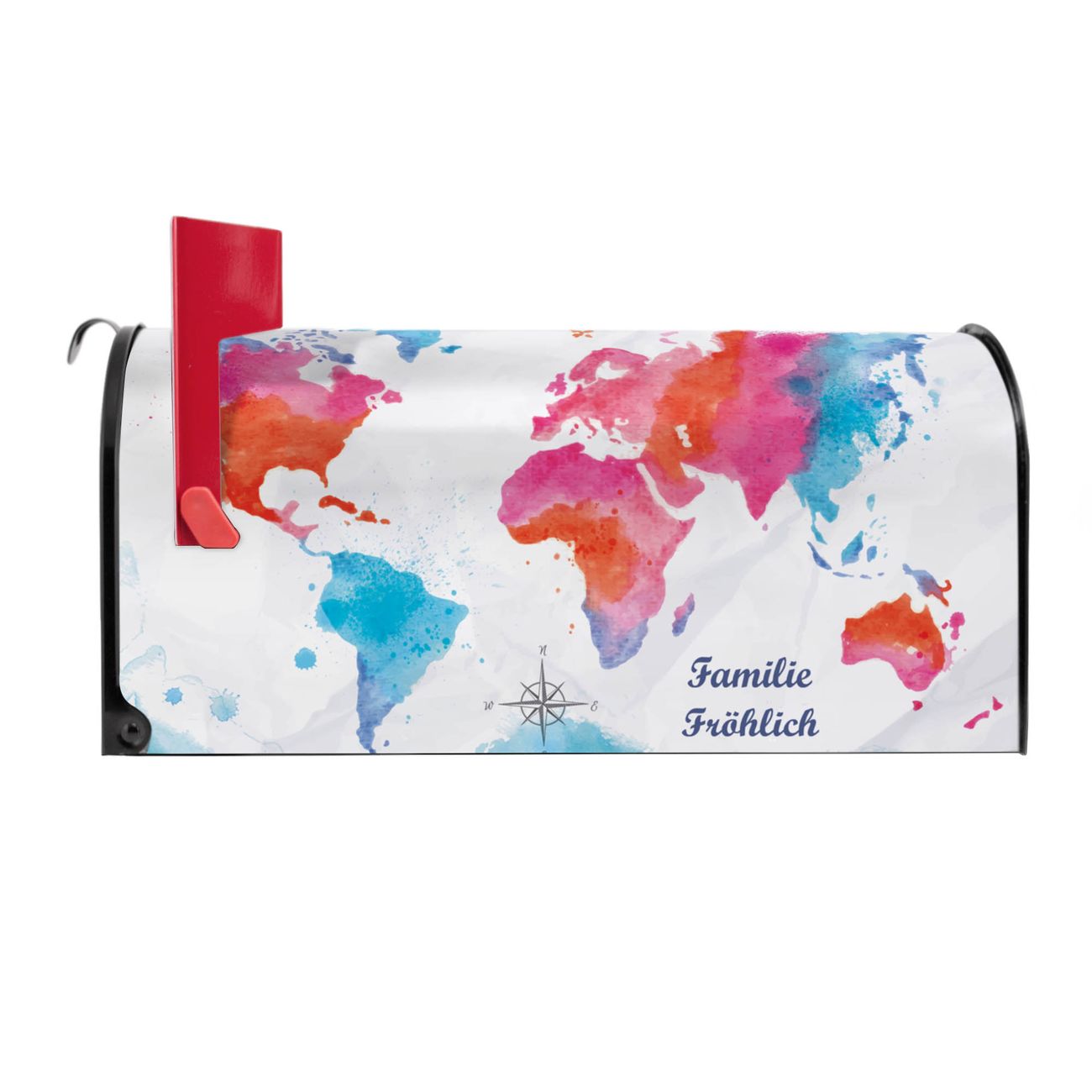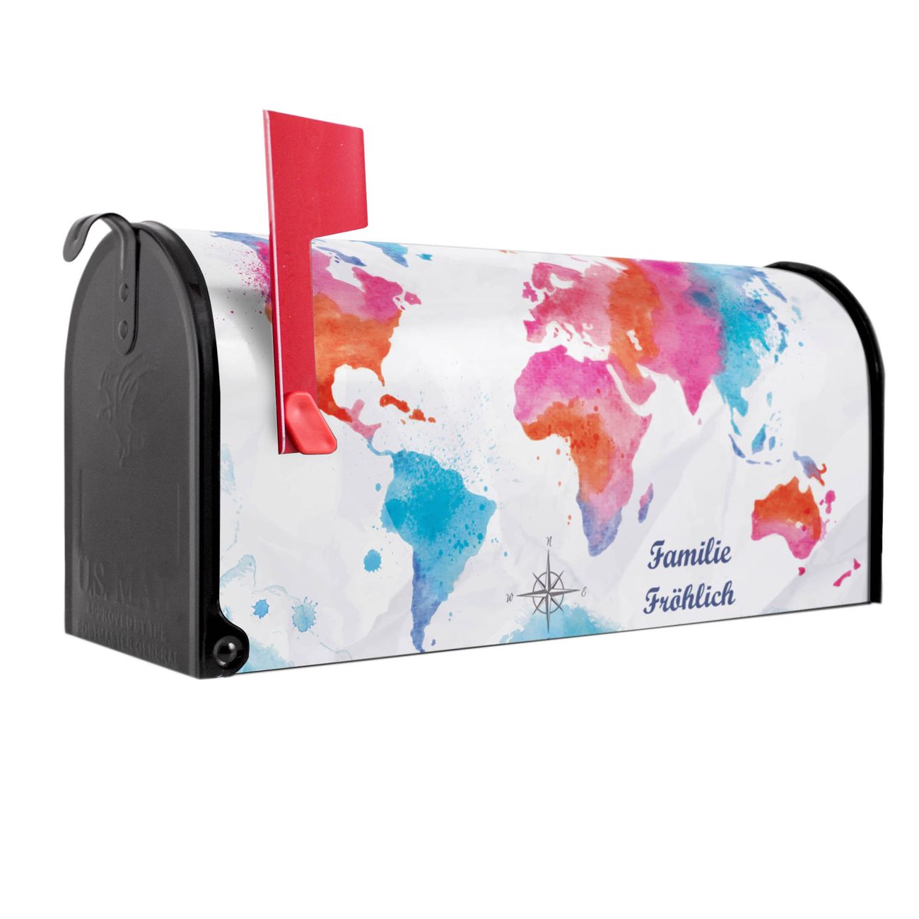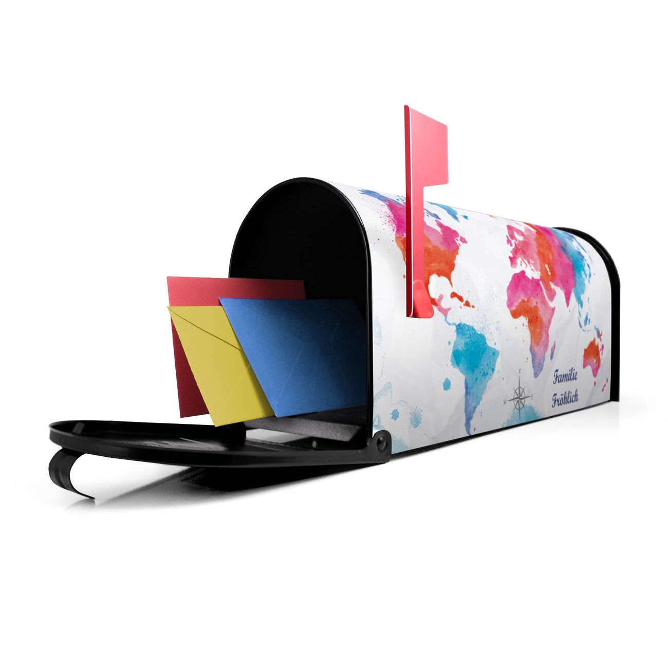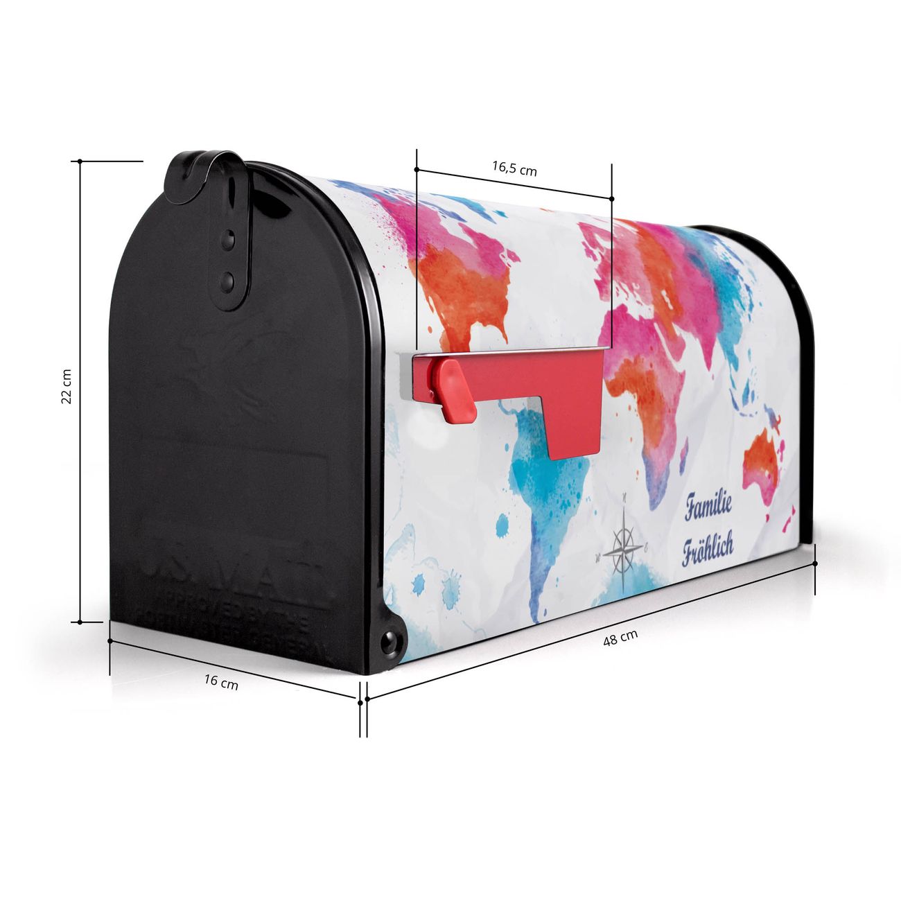 Der amerikanische Briefkasten von banjado mit Weltkarte pastell Motiv bietet Ihnen ausreichend Fassungsvermögen, um große A4 Sendungen und Zeitschriften zu empfangen. Die typisch amerikanische rote Fahne zeigt Ihnen an, wenn Sie Post erhalten haben. Die US-Mailbox besteht aus verzinktem Stahlblech welches lackiert wurde und ist 48 x 22 x 16 CM (BxHxT) groß. Die Folie mit Motiv Weltkarte pastell besteht aus einer wetter- und UV-resistenten Folie, die mit einem Schutzlaminat überzogen ist, sodass die US Mailbox zusätzlich vor Kratzern geschützt ist. An der Unterkante sind 4 Löcher je Seite um die Mailbox, typisch amerikanisch, an einem Holzpfahl oder einem Zaun zu befestigen. Auf Wunsch können Sie bei uns den passenden Standfuß oder die passende Wandhalterung kaufen um die US-Mailbox sicher zu befestigen. Wir bieten Ihnen ebenfalls Namensschilder, bereits beschriftet oder frei zu beschriften, und verschiedene selbst gestaltete Bitte-Keine-Werbung-Aufkleber.