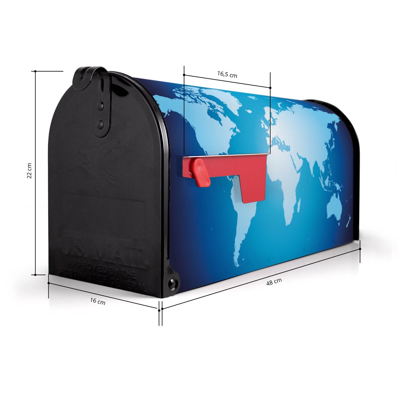 Der amerikanische Briefkasten von banjado mit Weltkarte Motiv bietet Ihnen ausreichend Fassungsvermögen, um große A4 Sendungen und Zeitschriften zu empfangen. Die typisch amerikanische rote Fahne zeigt Ihnen an, wenn Sie Post erhalten haben. Die US-Mailbox besteht aus verzinktem Stahlblech welches lackiert wurde und ist 48 x 22 x 16 CM (BxHxT) groß. Die Folie mit Motiv Weltkarte besteht aus einer wetter- und UV-resistenten Folie, die mit einem Schutzlaminat überzogen ist, sodass die US Mailbox zusätzlich vor Kratzern geschützt ist. An der Unterkante sind 4 Löcher je Seite um die Mailbox, typisch amerikanisch, an einem Holzpfahl oder einem Zaun zu befestigen. Auf Wunsch können Sie bei uns den passenden Standfuß oder die passende Wandhalterung kaufen um die US-Mailbox sicher zu befestigen. Wir bieten Ihnen ebenfalls Namensschilder, bereits beschriftet oder frei zu beschriften, und verschiedene selbst gestaltete Bitte-Keine-Werbung-Aufkleber.