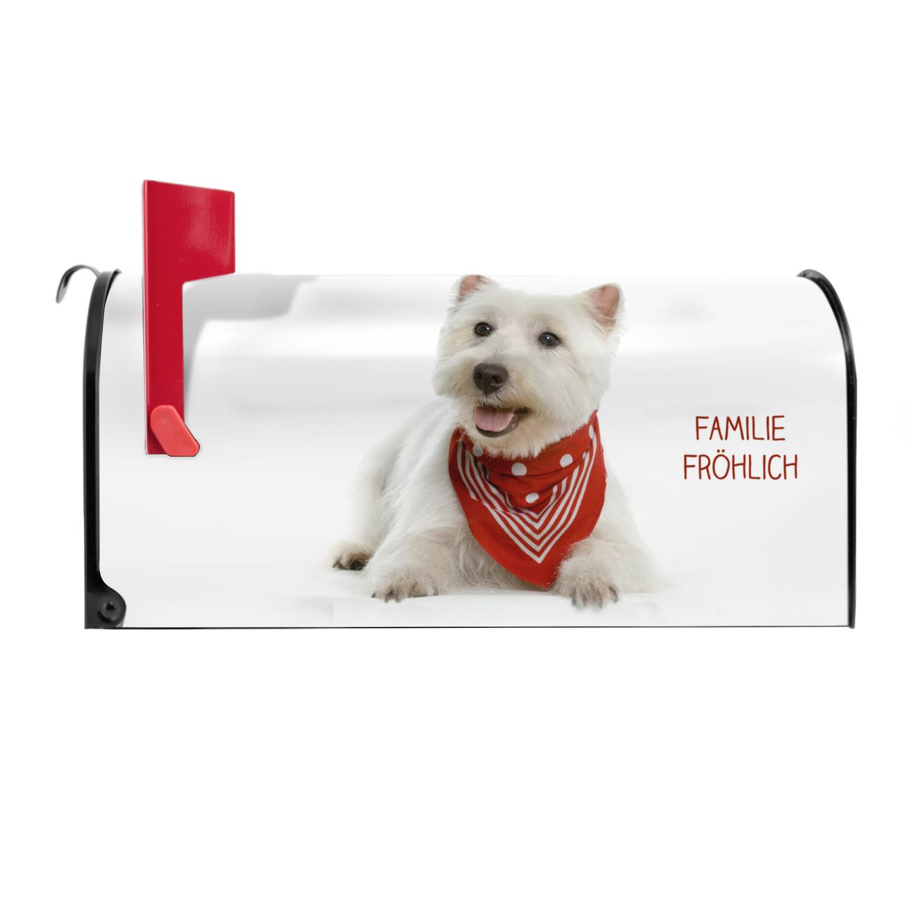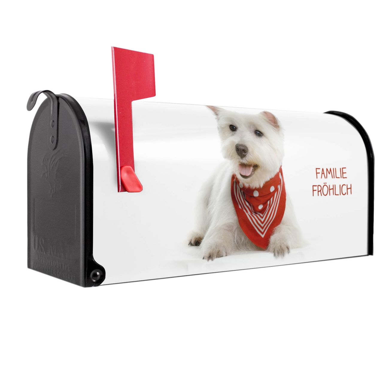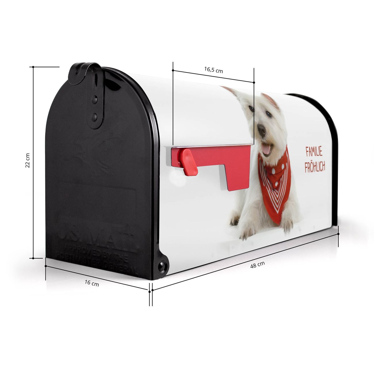 Der amerikanische Briefkasten von banjado mit Westie Motiv bietet Ihnen ausreichend Fassungsvermögen, um große A4 Sendungen und Zeitschriften zu empfangen. Die typisch amerikanische rote Fahne zeigt Ihnen an, wenn Sie Post erhalten haben. Die US-Mailbox besteht aus verzinktem Stahlblech welches lackiert wurde und ist 48 x 22 x 16 CM (BxHxT) groß. Die Folie mit Motiv Westie besteht aus einer wetter- und UV-resistenten Folie, die mit einem Schutzlaminat überzogen ist, sodass die US Mailbox zusätzlich vor Kratzern geschützt ist. An der Unterkante sind 4 Löcher je Seite um die Mailbox, typisch amerikanisch, an einem Holzpfahl oder einem Zaun zu befestigen. Auf Wunsch können Sie bei uns den passenden Standfuß oder die passende Wandhalterung kaufen um die US-Mailbox sicher zu befestigen. Wir bieten Ihnen ebenfalls Namensschilder, bereits beschriftet oder frei zu beschriften, und verschiedene selbst gestaltete Bitte-Keine-Werbung-Aufkleber.