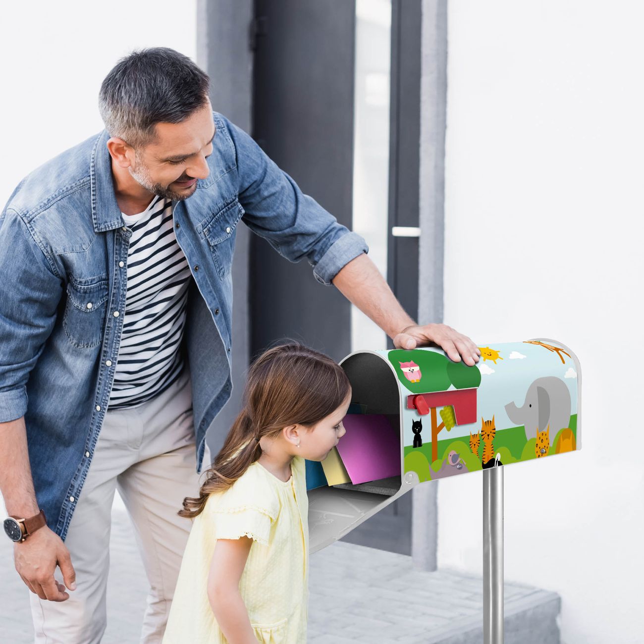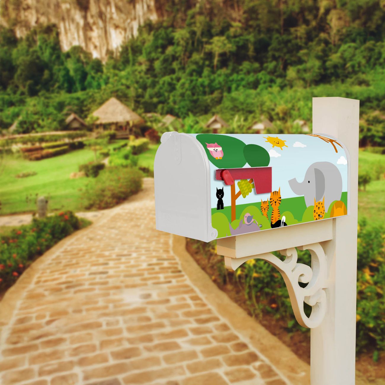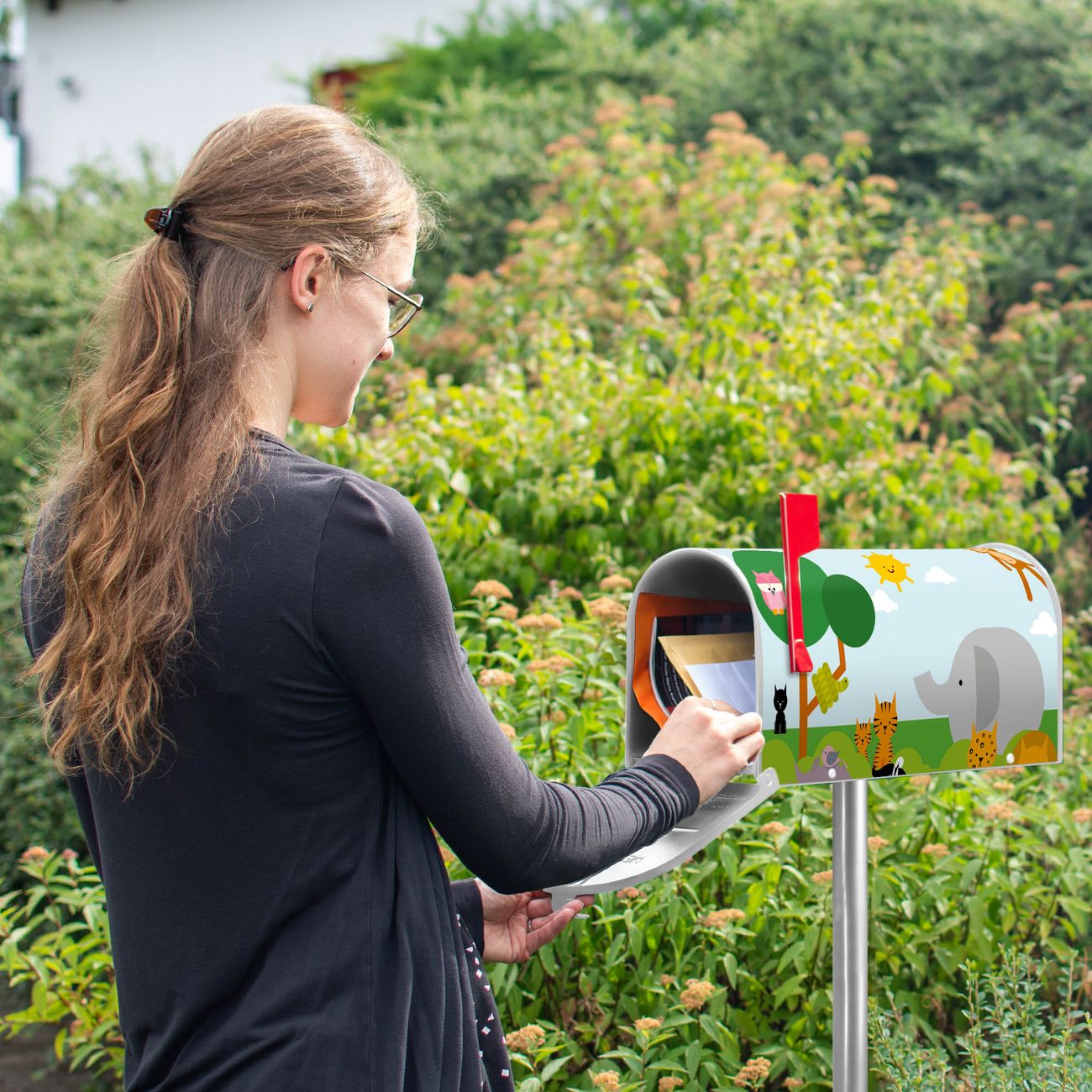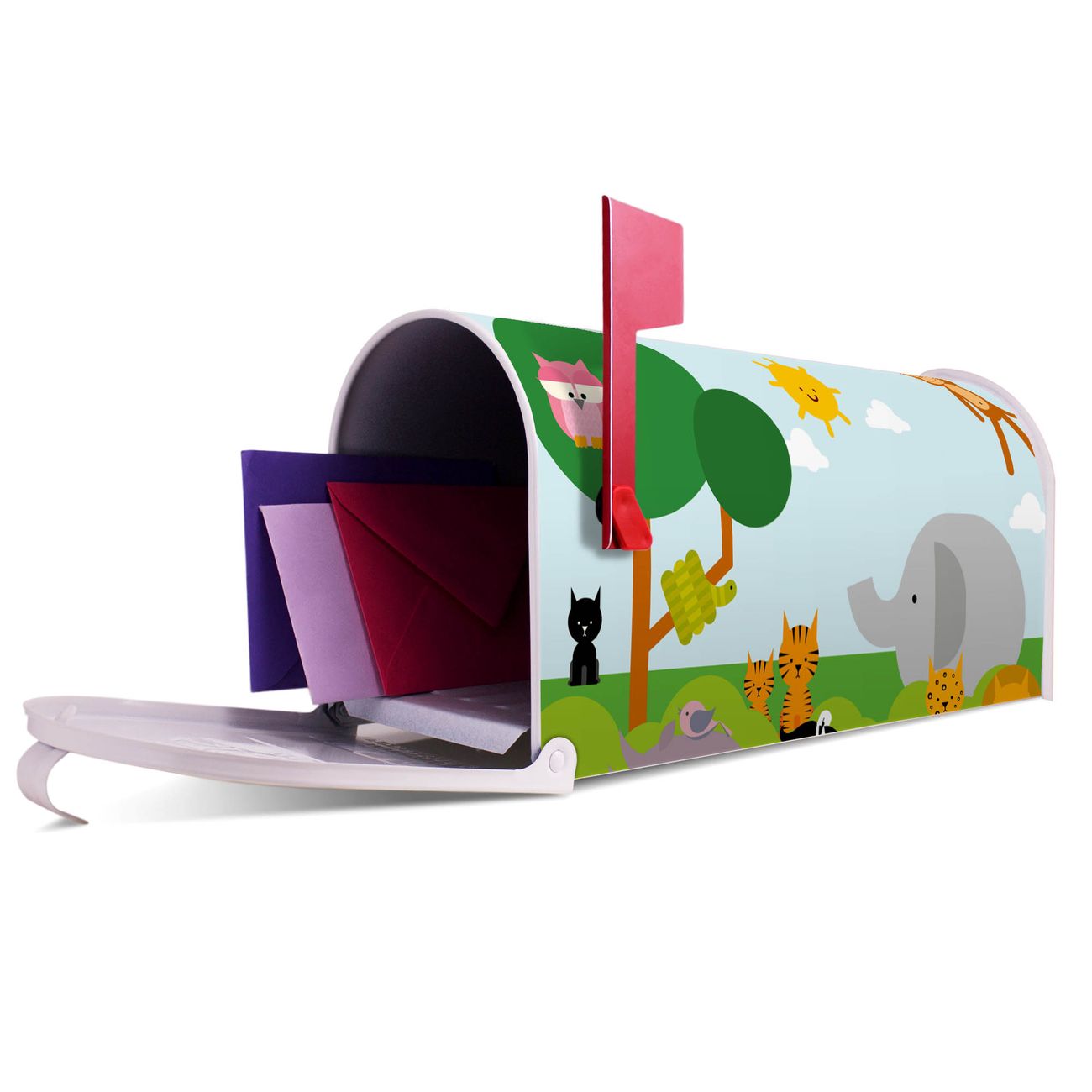 Der amerikanische Briefkasten von banjado mit Wilde Tiere Motiv bietet Ihnen ausreichend Fassungsvermögen, um große A4 Sendungen und Zeitschriften zu empfangen. Die typisch amerikanische rote Fahne zeigt Ihnen an, wenn Sie Post erhalten haben. Die US-Mailbox besteht aus verzinktem Stahlblech welches lackiert wurde und ist 48 x 22 x 16 CM (BxHxT) groß. Die Folie mit Motiv Wilde Tiere besteht aus einer wetter- und UV-resistenten Folie, die mit einem Schutzlaminat überzogen ist, sodass die US Mailbox zusätzlich vor Kratzern geschützt ist. An der Unterkante sind 4 Löcher je Seite um die Mailbox, typisch amerikanisch, an einem Holzpfahl oder einem Zaun zu befestigen. Auf Wunsch können Sie bei uns den passenden Standfuß oder die passende Wandhalterung kaufen um die US-Mailbox sicher zu befestigen. Wir bieten Ihnen ebenfalls Namensschilder, bereits beschriftet oder frei zu beschriften, und verschiedene selbst gestaltete Bitte-Keine-Werbung-Aufkleber.