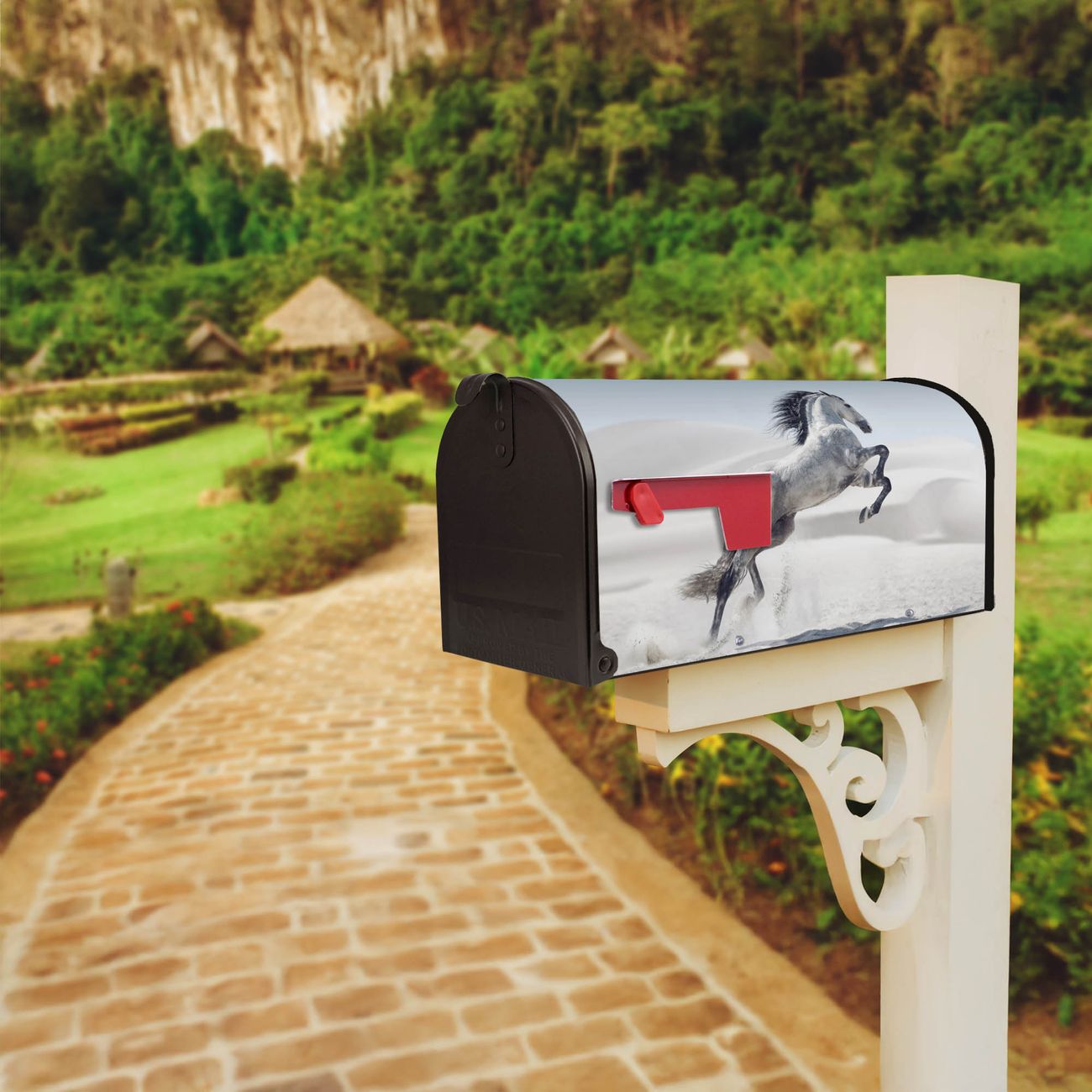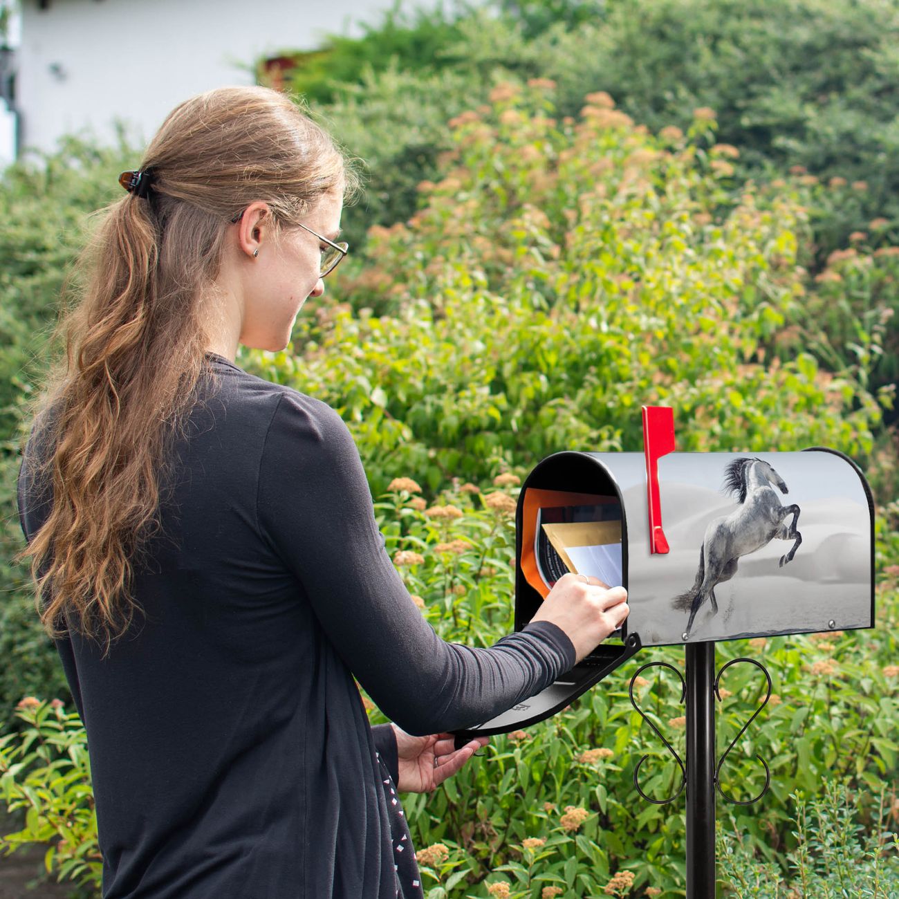 Der amerikanische Briefkasten von banjado mit Wildes Pferd Motiv bietet Ihnen ausreichend Fassungsvermögen, um große A4 Sendungen und Zeitschriften zu empfangen. Die typisch amerikanische rote Fahne zeigt Ihnen an, wenn Sie Post erhalten haben. Die US-Mailbox besteht aus verzinktem Stahlblech welches lackiert wurde und ist 48 x 22 x 16 CM (BxHxT) groß. Die Folie mit Motiv Wildes Pferd besteht aus einer wetter- und UV-resistenten Folie, die mit einem Schutzlaminat überzogen ist, sodass die US Mailbox zusätzlich vor Kratzern geschützt ist. An der Unterkante sind 4 Löcher je Seite um die Mailbox, typisch amerikanisch, an einem Holzpfahl oder einem Zaun zu befestigen. Auf Wunsch können Sie bei uns den passenden Standfuß oder die passende Wandhalterung kaufen um die US-Mailbox sicher zu befestigen. Wir bieten Ihnen ebenfalls Namensschilder, bereits beschriftet oder frei zu beschriften, und verschiedene selbst gestaltete Bitte-Keine-Werbung-Aufkleber.