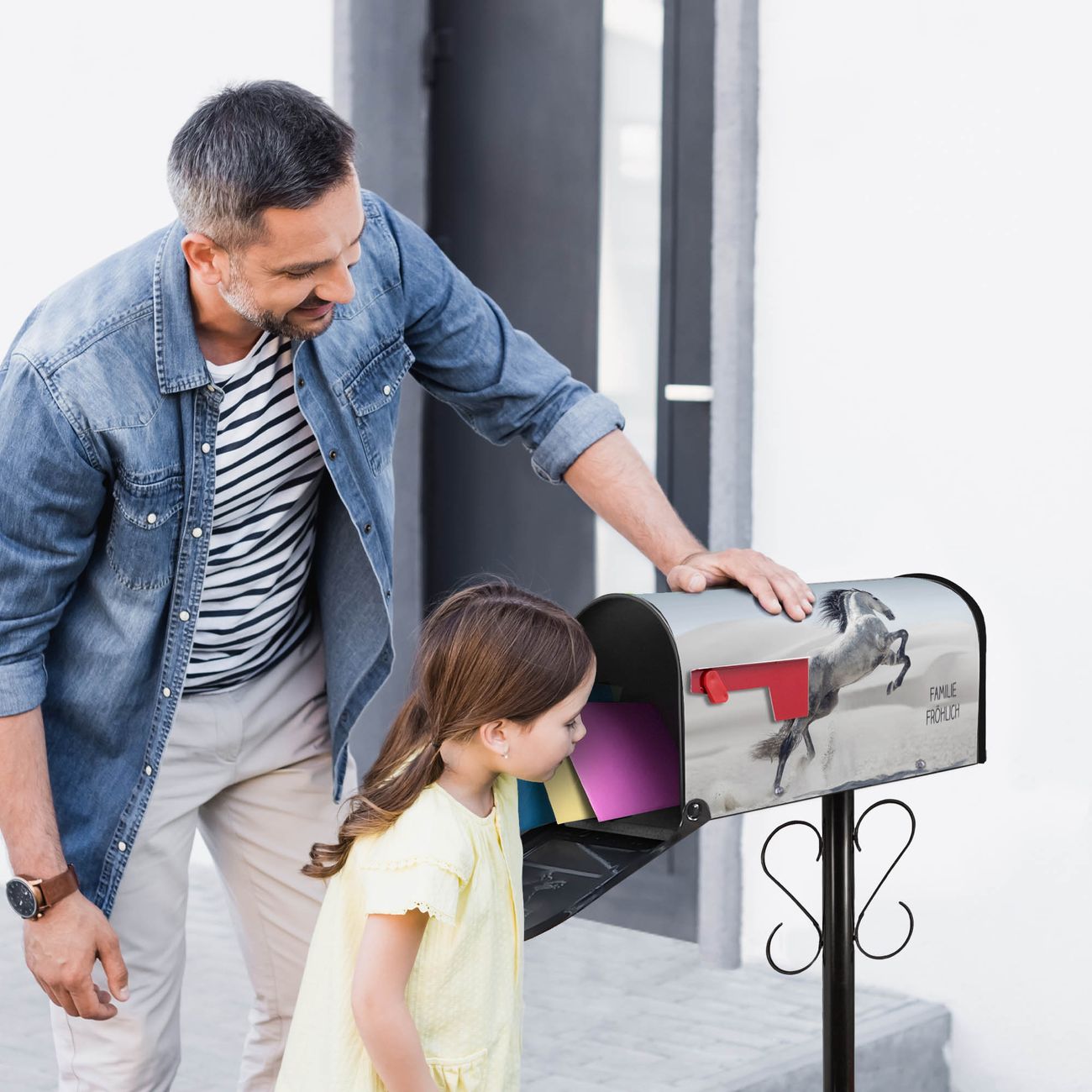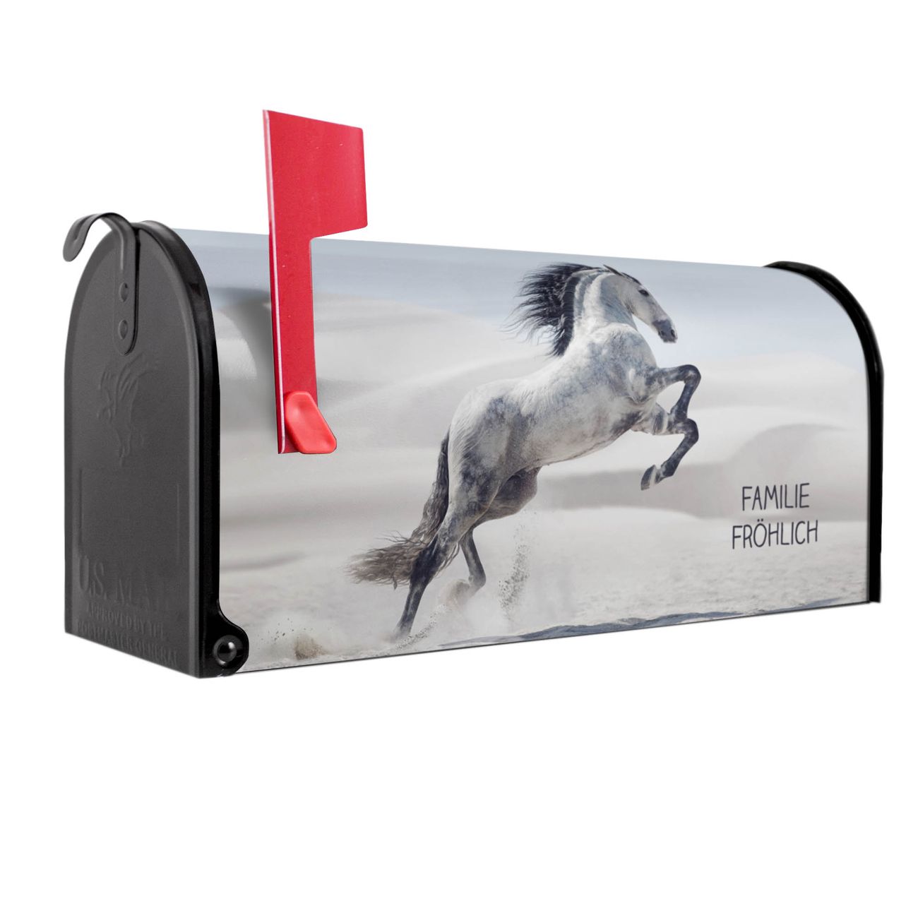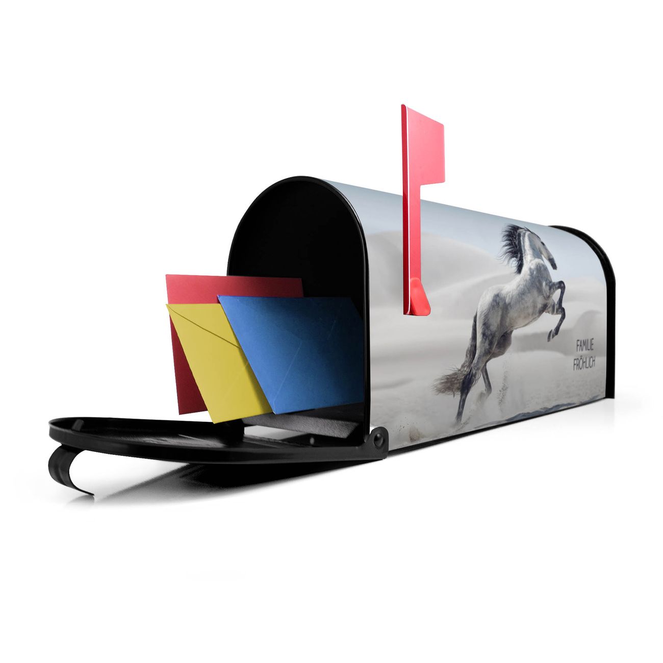 Der amerikanische Briefkasten von banjado mit Wildes Pferd Motiv bietet Ihnen ausreichend Fassungsvermögen, um große A4 Sendungen und Zeitschriften zu empfangen. Die typisch amerikanische rote Fahne zeigt Ihnen an, wenn Sie Post erhalten haben. Die US-Mailbox besteht aus verzinktem Stahlblech welches lackiert wurde und ist 48 x 22 x 16 CM (BxHxT) groß. Die Folie mit Motiv Wildes Pferd besteht aus einer wetter- und UV-resistenten Folie, die mit einem Schutzlaminat überzogen ist, sodass die US Mailbox zusätzlich vor Kratzern geschützt ist. An der Unterkante sind 4 Löcher je Seite um die Mailbox, typisch amerikanisch, an einem Holzpfahl oder einem Zaun zu befestigen. Auf Wunsch können Sie bei uns den passenden Standfuß oder die passende Wandhalterung kaufen um die US-Mailbox sicher zu befestigen. Wir bieten Ihnen ebenfalls Namensschilder, bereits beschriftet oder frei zu beschriften, und verschiedene selbst gestaltete Bitte-Keine-Werbung-Aufkleber.