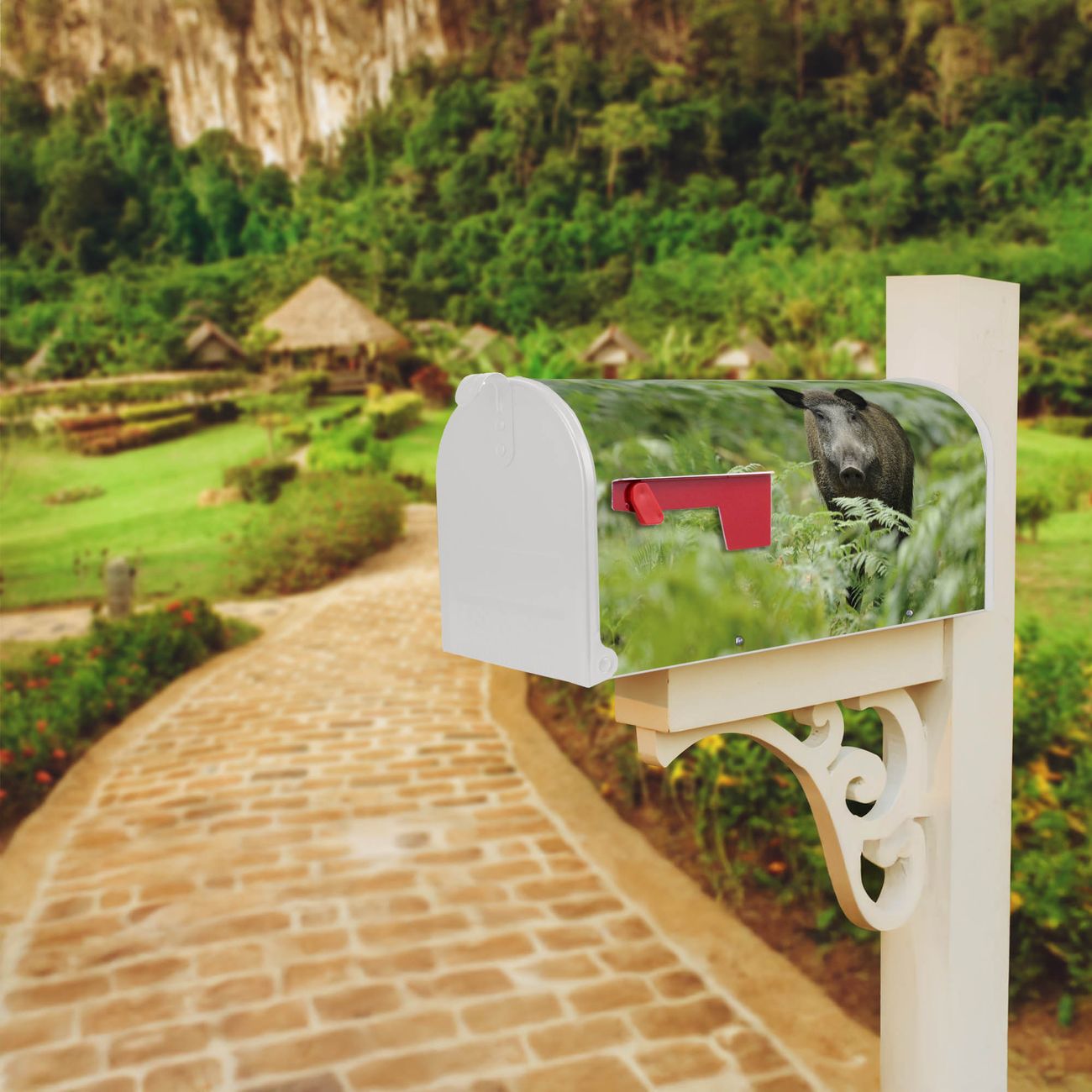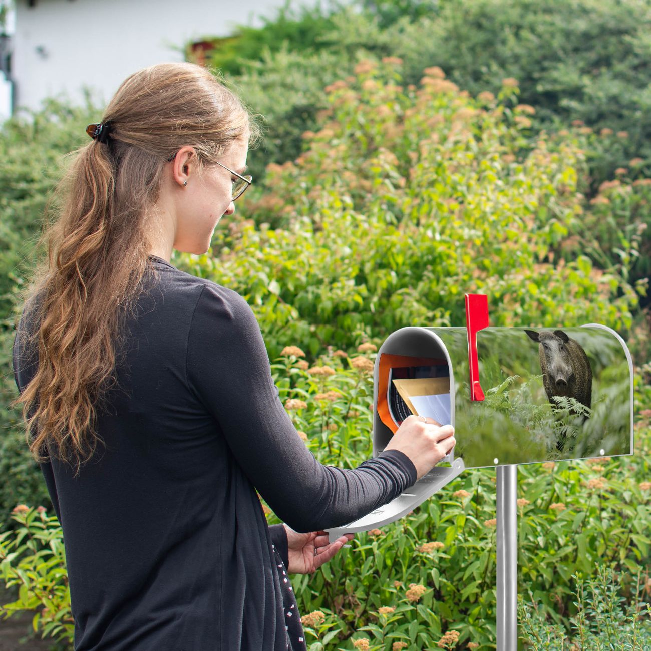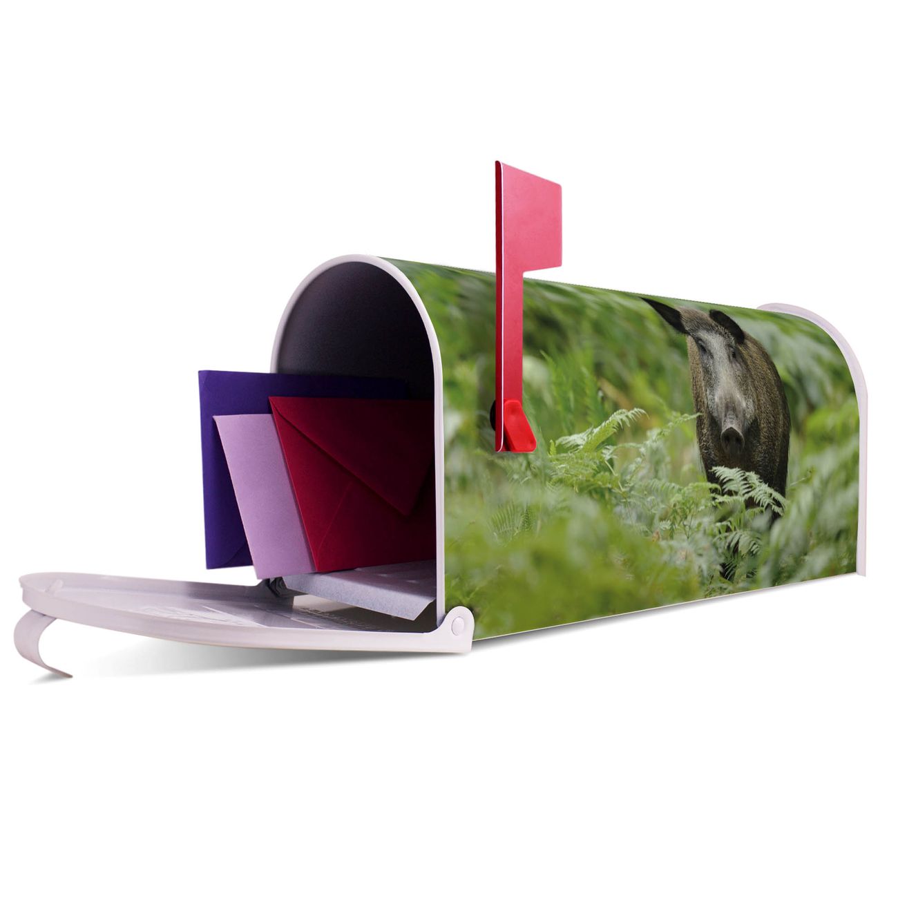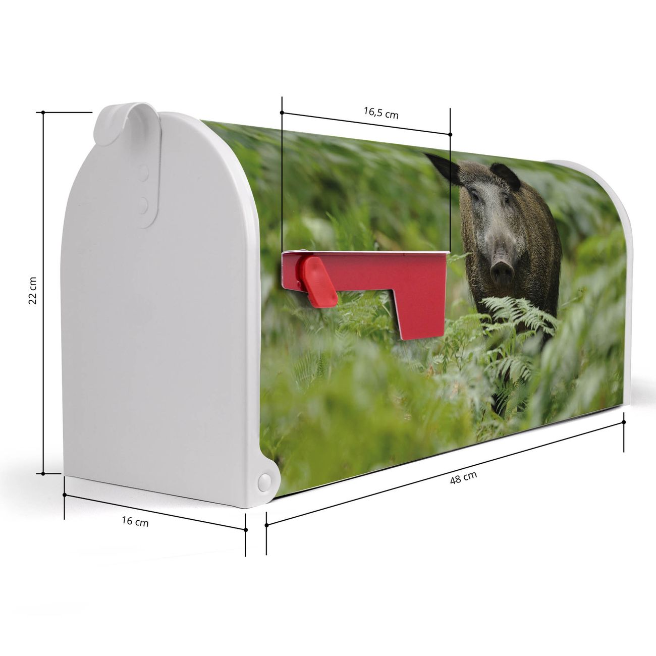 Der amerikanische Briefkasten von banjado mit Wildschwein Motiv bietet Ihnen ausreichend Fassungsvermögen, um große A4 Sendungen und Zeitschriften zu empfangen. Die typisch amerikanische rote Fahne zeigt Ihnen an, wenn Sie Post erhalten haben. Die US-Mailbox besteht aus verzinktem Stahlblech welches lackiert wurde und ist 48 x 22 x 16 CM (BxHxT) groß. Die Folie mit Motiv Wildschwein besteht aus einer wetter- und UV-resistenten Folie, die mit einem Schutzlaminat überzogen ist, sodass die US Mailbox zusätzlich vor Kratzern geschützt ist. An der Unterkante sind 4 Löcher je Seite um die Mailbox, typisch amerikanisch, an einem Holzpfahl oder einem Zaun zu befestigen. Auf Wunsch können Sie bei uns den passenden Standfuß oder die passende Wandhalterung kaufen um die US-Mailbox sicher zu befestigen. Wir bieten Ihnen ebenfalls Namensschilder, bereits beschriftet oder frei zu beschriften, und verschiedene selbst gestaltete Bitte-Keine-Werbung-Aufkleber.