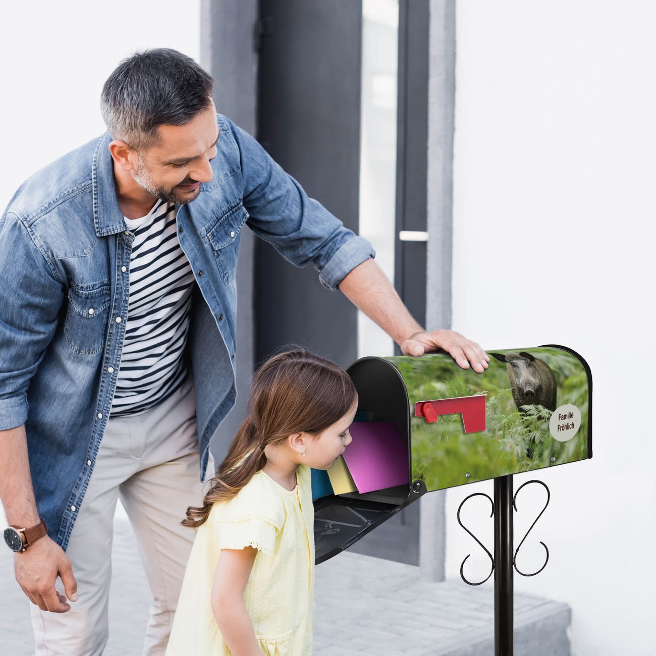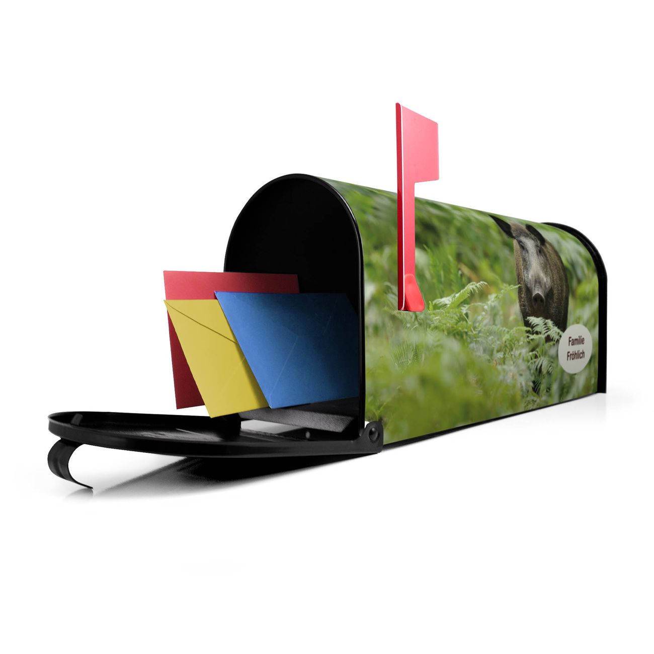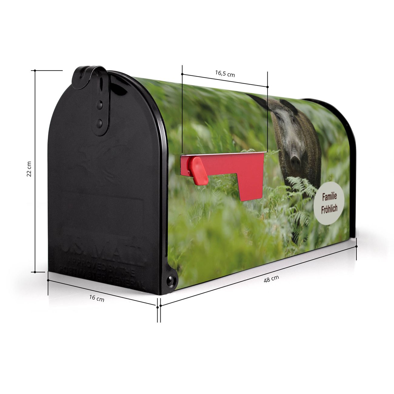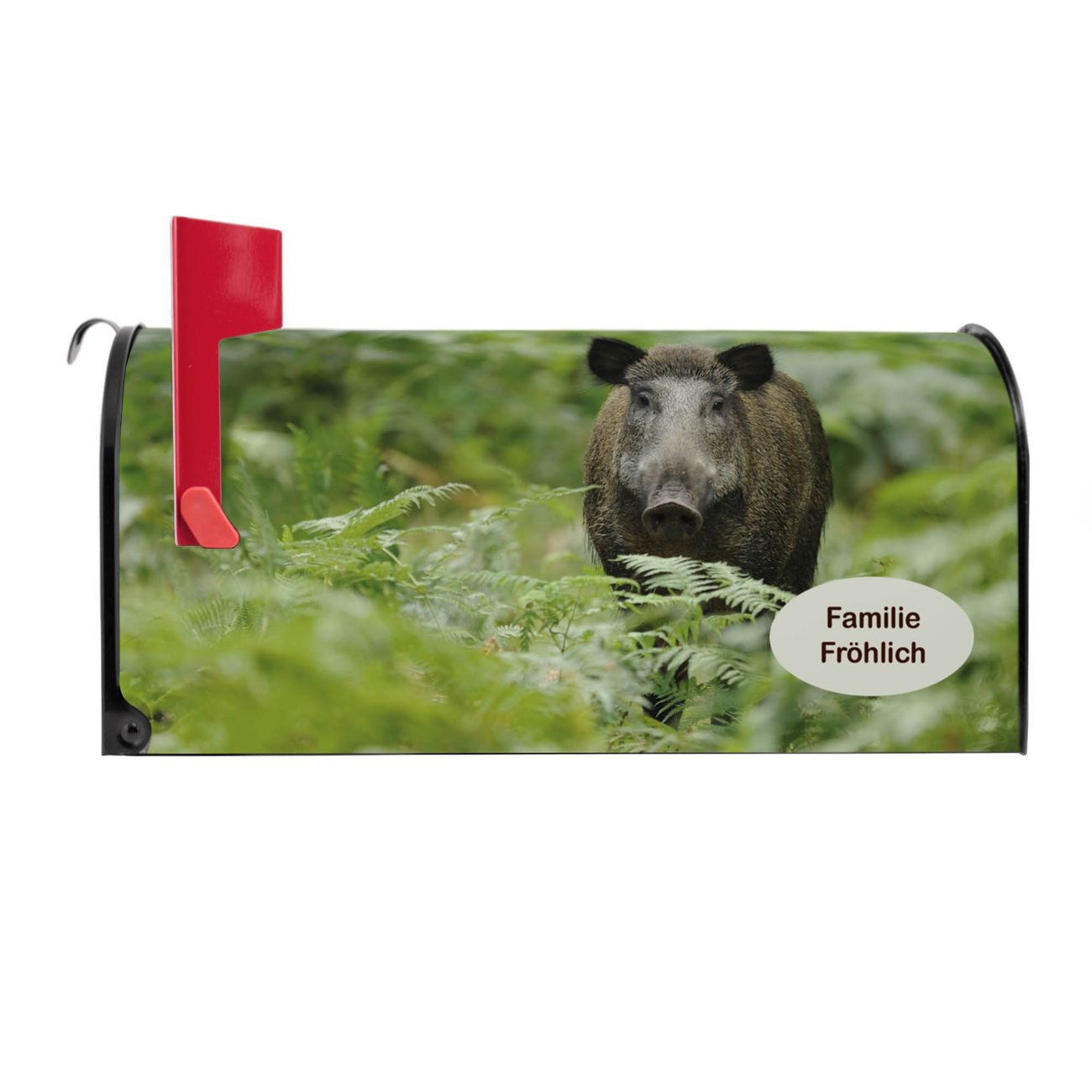 Der amerikanische Briefkasten von banjado mit Wildschwein Motiv bietet Ihnen ausreichend Fassungsvermögen, um große A4 Sendungen und Zeitschriften zu empfangen. Die typisch amerikanische rote Fahne zeigt Ihnen an, wenn Sie Post erhalten haben. Die US-Mailbox besteht aus verzinktem Stahlblech welches lackiert wurde und ist 48 x 22 x 16 CM (BxHxT) groß. Die Folie mit Motiv Wildschwein besteht aus einer wetter- und UV-resistenten Folie, die mit einem Schutzlaminat überzogen ist, sodass die US Mailbox zusätzlich vor Kratzern geschützt ist. An der Unterkante sind 4 Löcher je Seite um die Mailbox, typisch amerikanisch, an einem Holzpfahl oder einem Zaun zu befestigen. Auf Wunsch können Sie bei uns den passenden Standfuß oder die passende Wandhalterung kaufen um die US-Mailbox sicher zu befestigen. Wir bieten Ihnen ebenfalls Namensschilder, bereits beschriftet oder frei zu beschriften, und verschiedene selbst gestaltete Bitte-Keine-Werbung-Aufkleber.