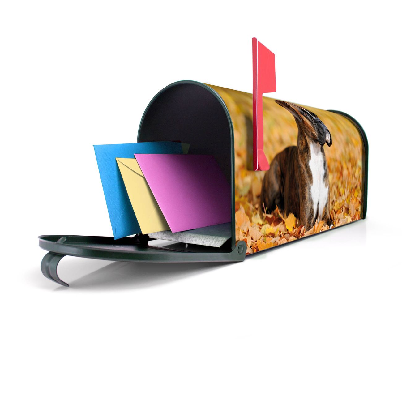 Der amerikanische Briefkasten von banjado mit Wilhelm Motiv bietet Ihnen ausreichend Fassungsvermögen, um große A4 Sendungen und Zeitschriften zu empfangen. Die typisch amerikanische rote Fahne zeigt Ihnen an, wenn Sie Post erhalten haben. Die US-Mailbox besteht aus verzinktem Stahlblech welches lackiert wurde und ist 48 x 22 x 16 CM (BxHxT) groß. Die Folie mit Motiv Wilhelm besteht aus einer wetter- und UV-resistenten Folie, die mit einem Schutzlaminat überzogen ist, sodass die US Mailbox zusätzlich vor Kratzern geschützt ist. An der Unterkante sind 4 Löcher je Seite um die Mailbox, typisch amerikanisch, an einem Holzpfahl oder einem Zaun zu befestigen. Auf Wunsch können Sie bei uns den passenden Standfuß oder die passende Wandhalterung kaufen um die US-Mailbox sicher zu befestigen. Wir bieten Ihnen ebenfalls Namensschilder, bereits beschriftet oder frei zu beschriften, und verschiedene selbst gestaltete Bitte-Keine-Werbung-Aufkleber.