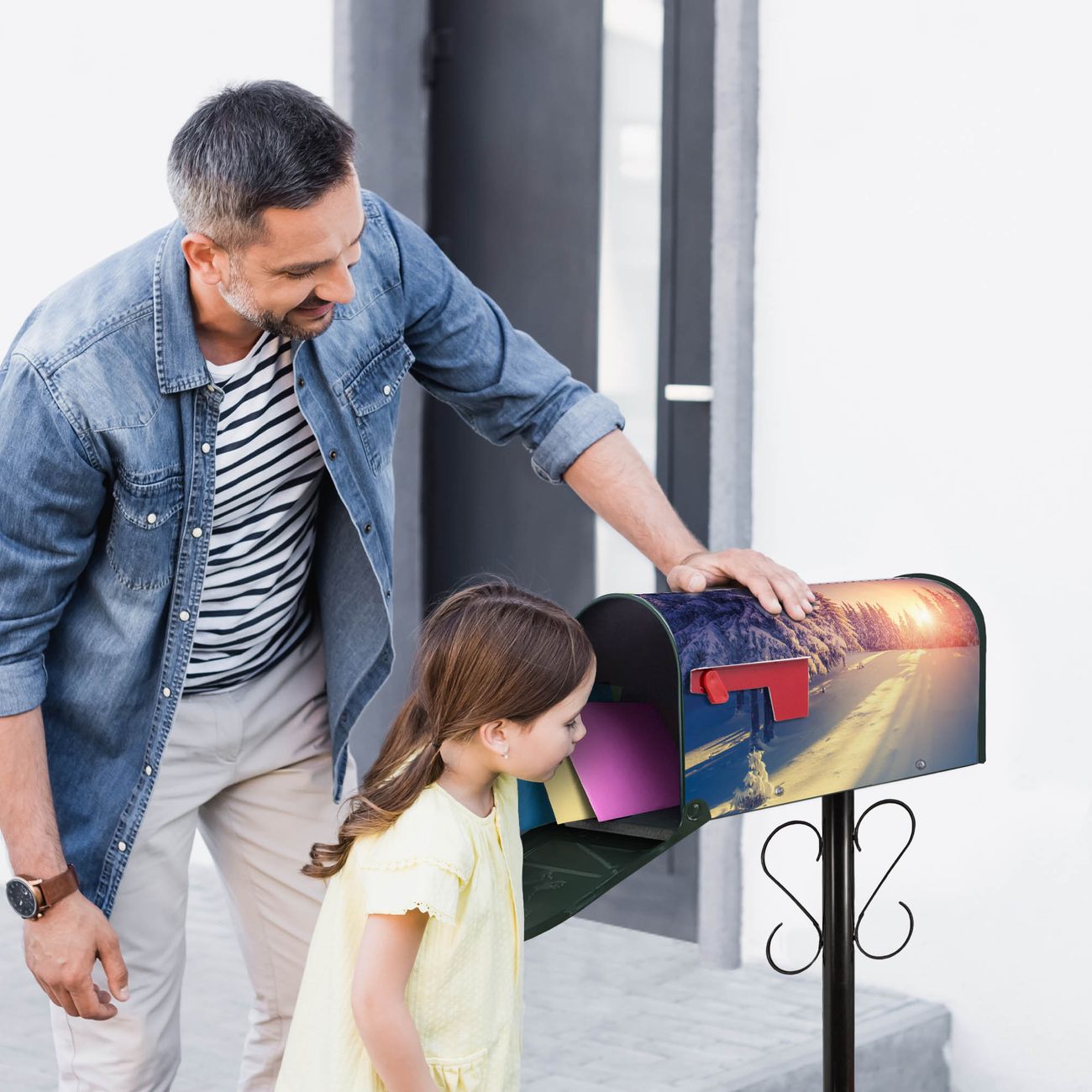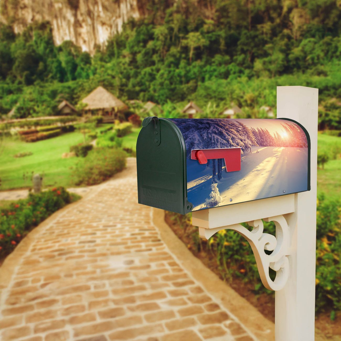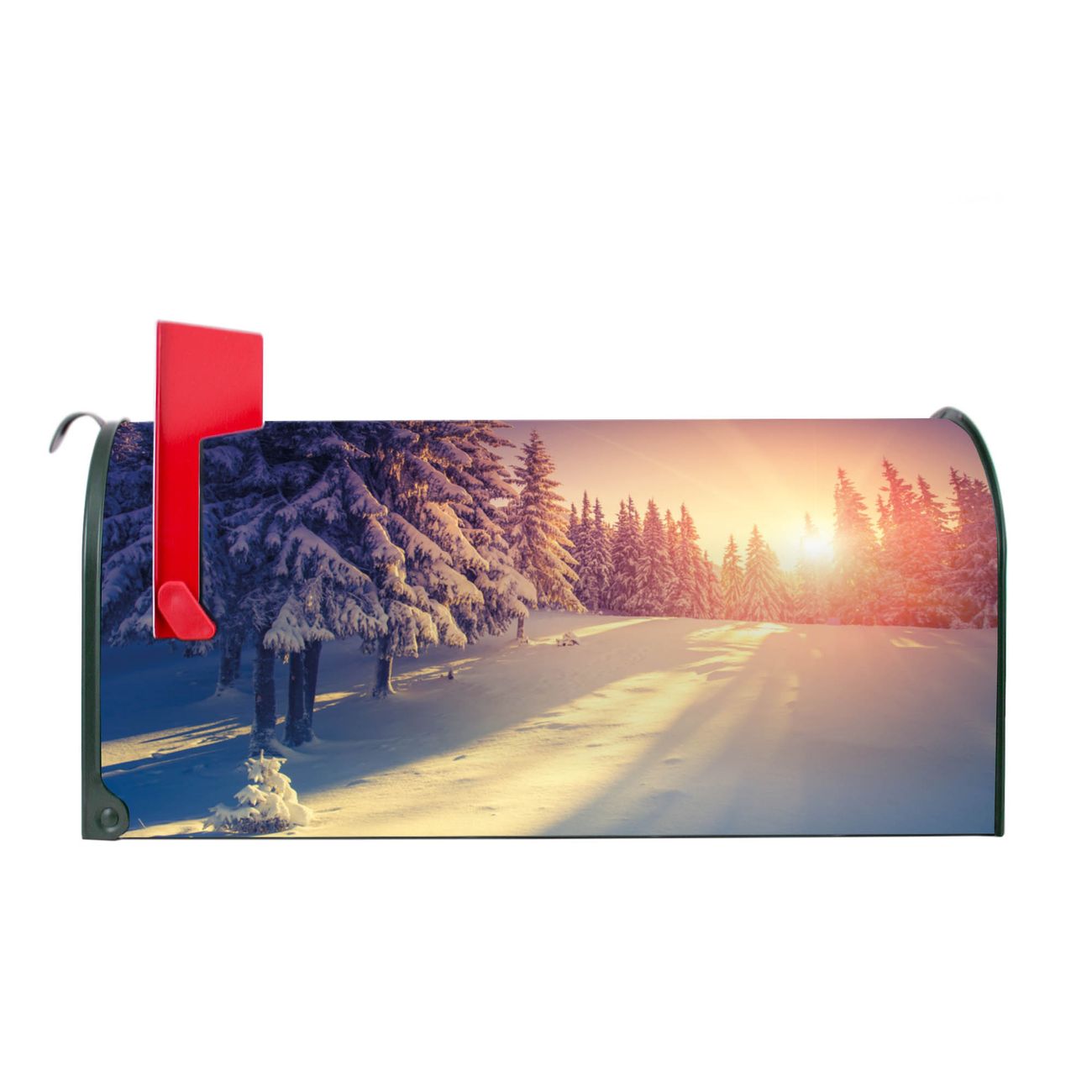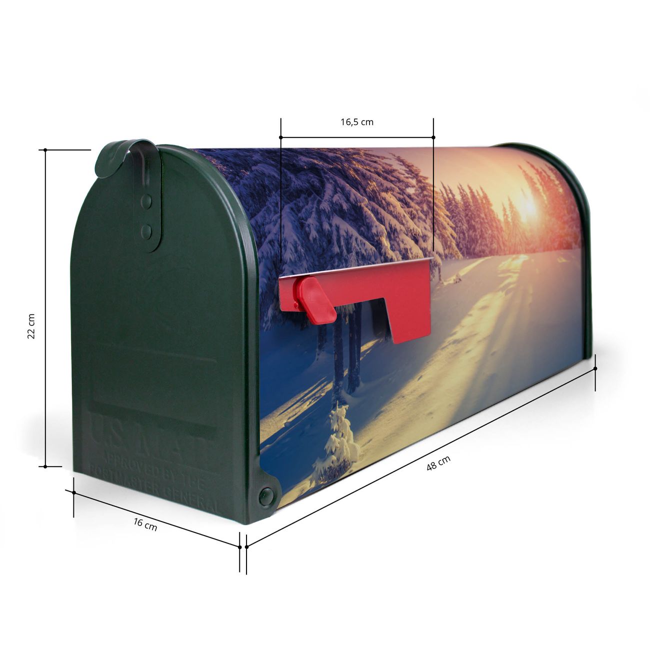 Der amerikanische Briefkasten von banjado mit Winterabend Motiv bietet Ihnen ausreichend Fassungsvermögen, um große A4 Sendungen und Zeitschriften zu empfangen. Die typisch amerikanische rote Fahne zeigt Ihnen an, wenn Sie Post erhalten haben. Die US-Mailbox besteht aus verzinktem Stahlblech welches lackiert wurde und ist 48 x 22 x 16 CM (BxHxT) groß. Die Folie mit Motiv Winterabend besteht aus einer wetter- und UV-resistenten Folie, die mit einem Schutzlaminat überzogen ist, sodass die US Mailbox zusätzlich vor Kratzern geschützt ist. An der Unterkante sind 4 Löcher je Seite um die Mailbox, typisch amerikanisch, an einem Holzpfahl oder einem Zaun zu befestigen. Auf Wunsch können Sie bei uns den passenden Standfuß oder die passende Wandhalterung kaufen um die US-Mailbox sicher zu befestigen. Wir bieten Ihnen ebenfalls Namensschilder, bereits beschriftet oder frei zu beschriften, und verschiedene selbst gestaltete Bitte-Keine-Werbung-Aufkleber.
