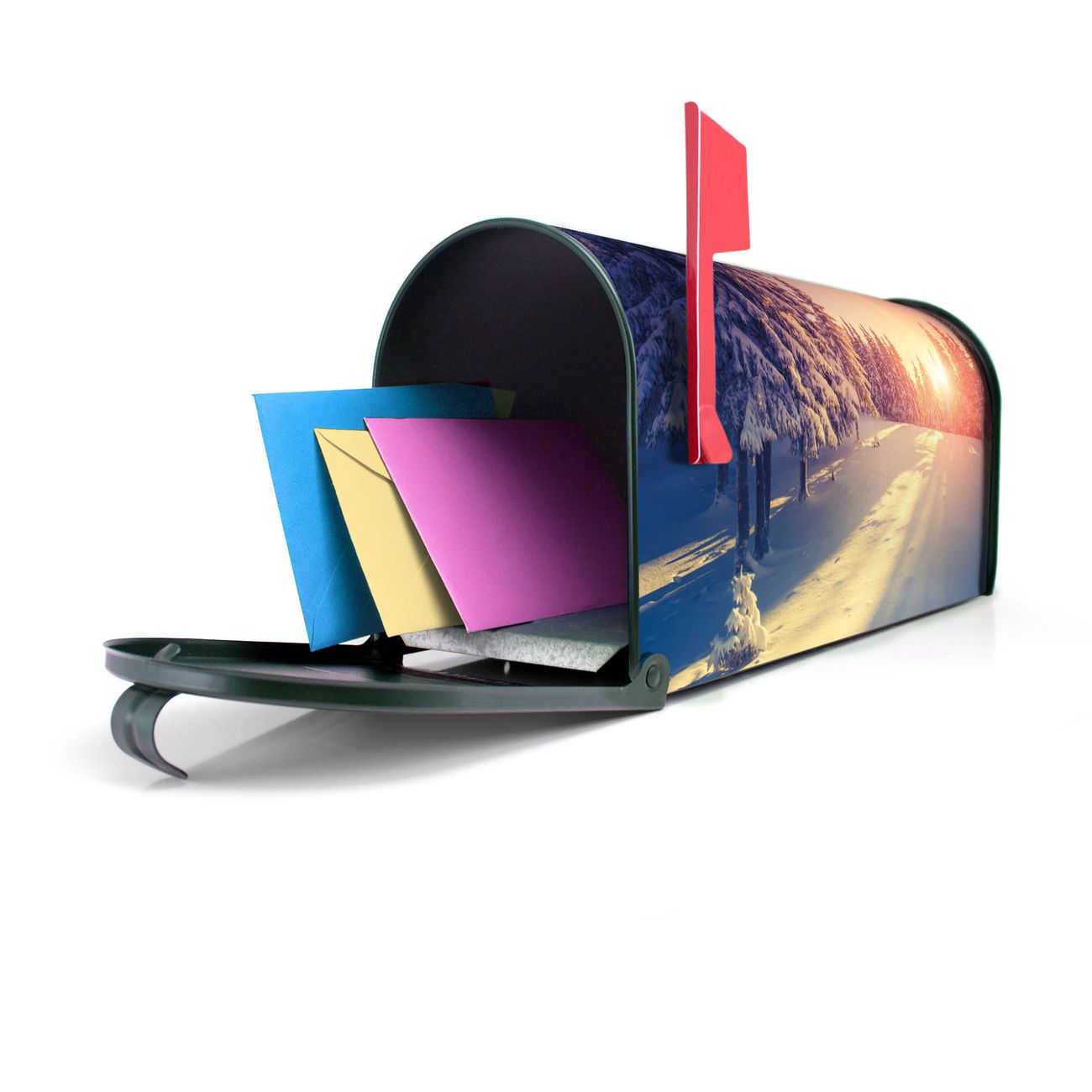 Unser amerikanischer Briefkasten mit dem Motiv Winterabend hat ein sehr ansprechendes und ausgefallenes Design, ist in der Grundfarbe weiß, grün oder schwarz erhältlich. Damit entlocken Sie Ihren Nachbarn und dem Postboten immer wieder ein Lächeln. Die Mailbox ist ein Original Import aus Mississippi USA und wird von unserer kleinen Manufaktur in Sachsen von Hand veredelt. Die US-Mailbox bietet ausreichend Platz auch für große Sendungen, eine Fahne die Ihnen Post anzeigt, wetterfestes und äußerst stabiles Material - so macht Post empfangen Freude.