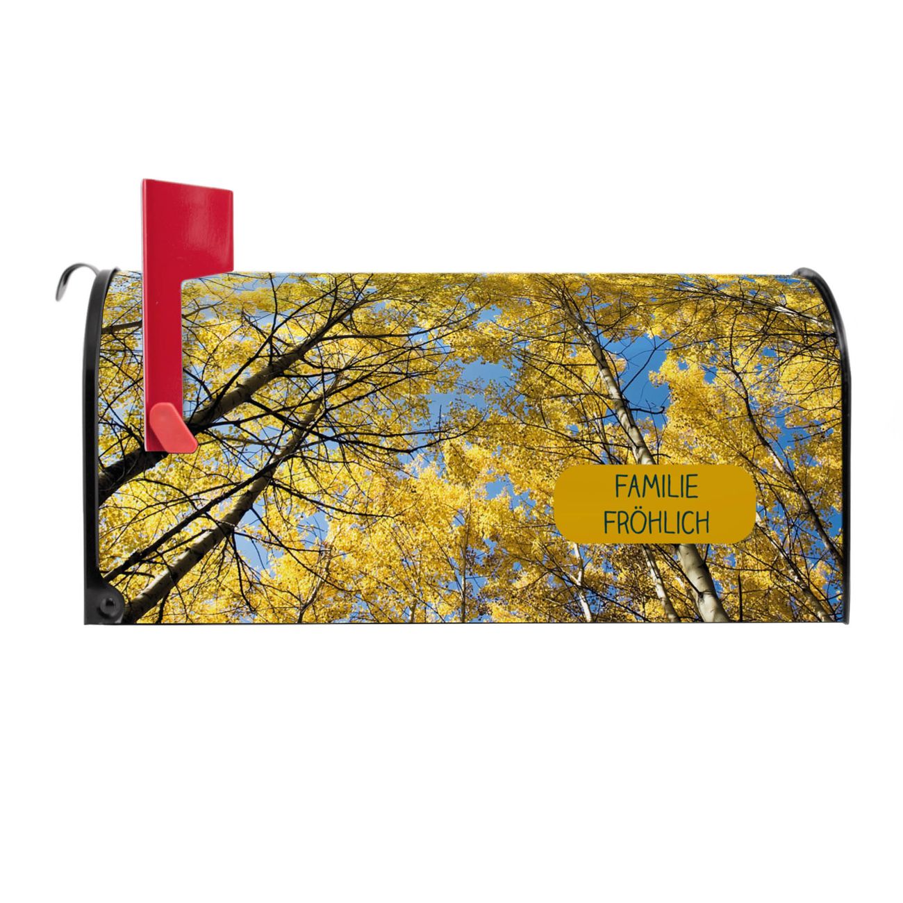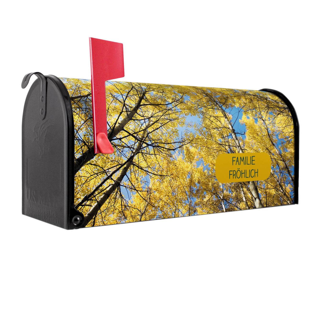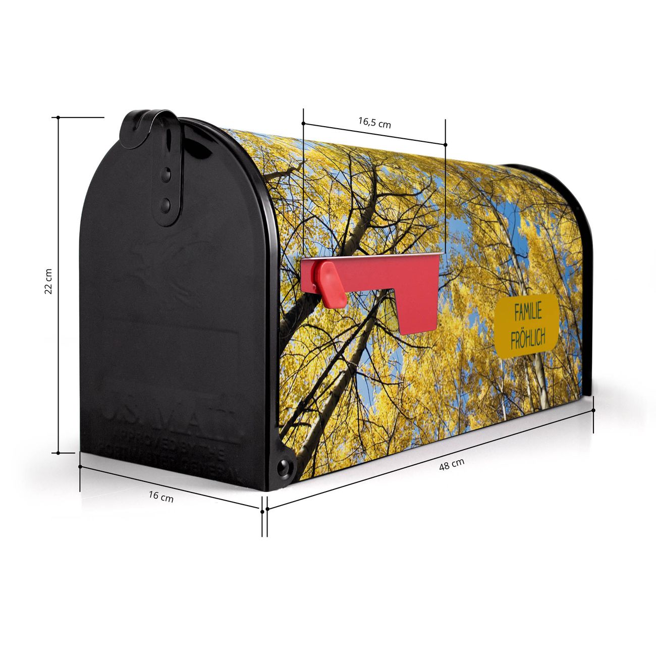 Der amerikanische Briefkasten von banjado mit Wipfel Motiv bietet Ihnen ausreichend Fassungsvermögen, um große A4 Sendungen und Zeitschriften zu empfangen. Die typisch amerikanische rote Fahne zeigt Ihnen an, wenn Sie Post erhalten haben. Die US-Mailbox besteht aus verzinktem Stahlblech welches lackiert wurde und ist 48 x 22 x 16 CM (BxHxT) groß. Die Folie mit Motiv Wipfel besteht aus einer wetter- und UV-resistenten Folie, die mit einem Schutzlaminat überzogen ist, sodass die US Mailbox zusätzlich vor Kratzern geschützt ist. An der Unterkante sind 4 Löcher je Seite um die Mailbox, typisch amerikanisch, an einem Holzpfahl oder einem Zaun zu befestigen. Auf Wunsch können Sie bei uns den passenden Standfuß oder die passende Wandhalterung kaufen um die US-Mailbox sicher zu befestigen. Wir bieten Ihnen ebenfalls Namensschilder, bereits beschriftet oder frei zu beschriften, und verschiedene selbst gestaltete Bitte-Keine-Werbung-Aufkleber.