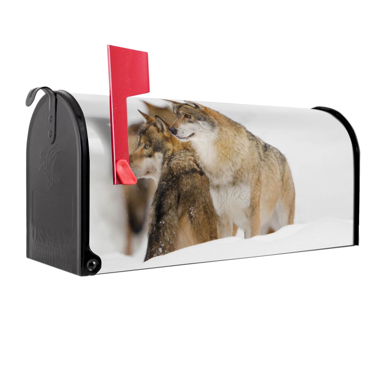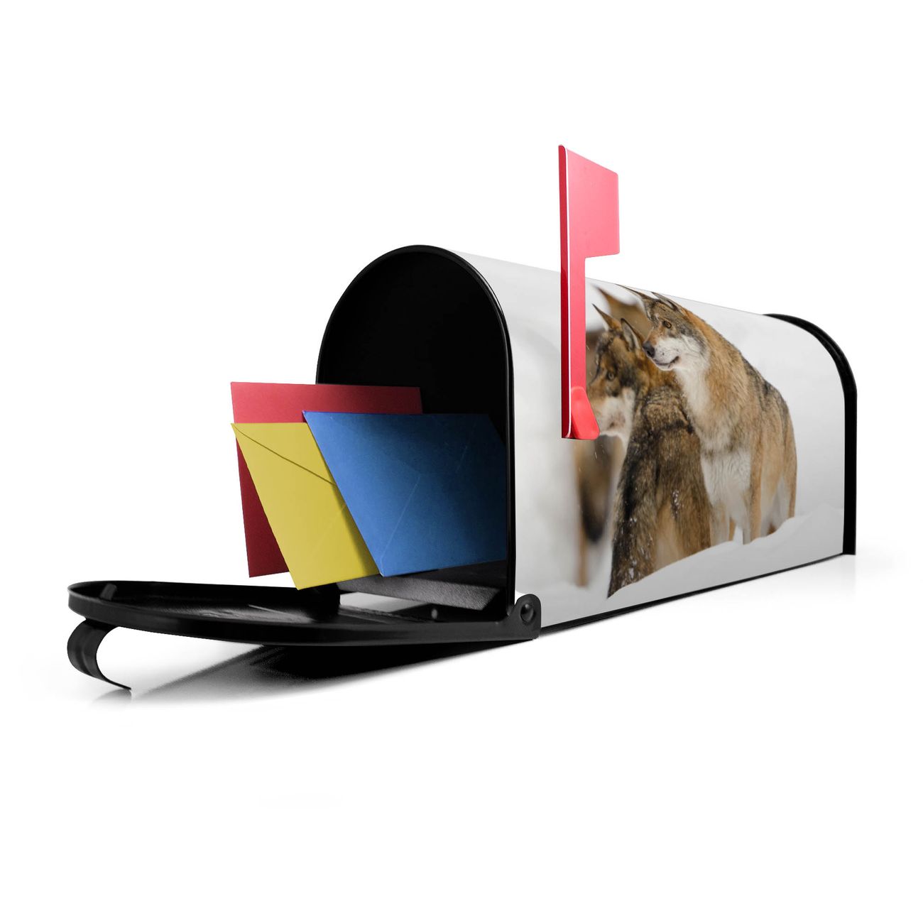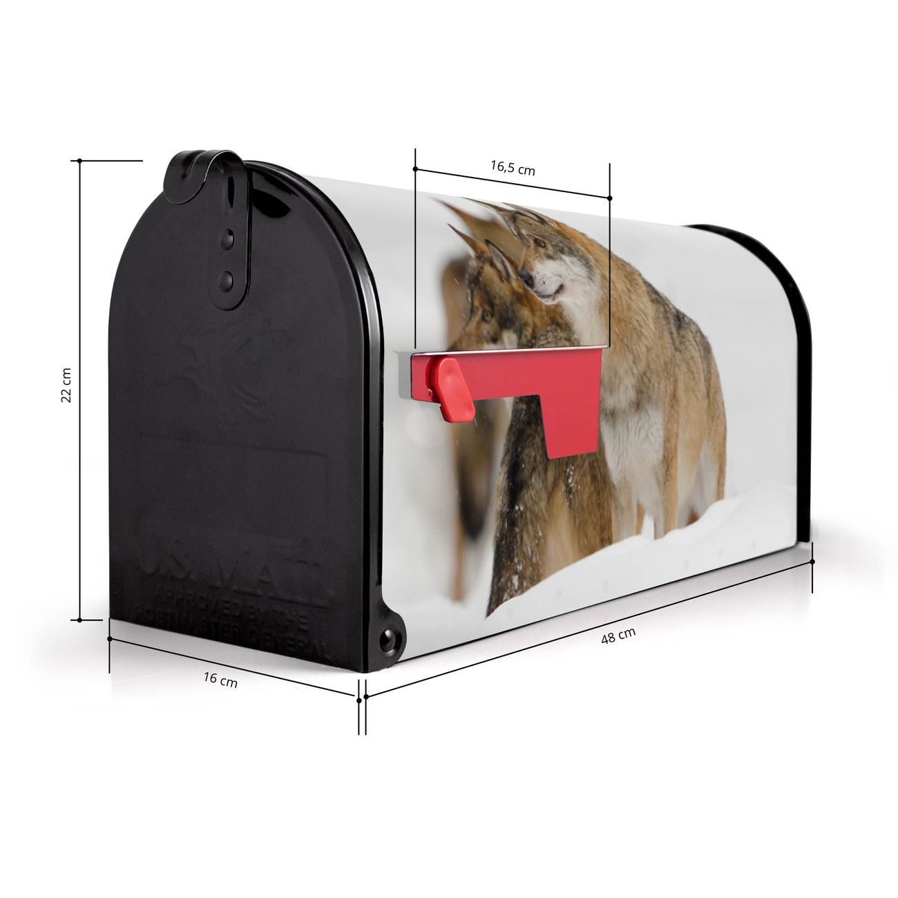 Der amerikanische Briefkasten von banjado mit Wölfe Motiv bietet Ihnen ausreichend Fassungsvermögen, um große A4 Sendungen und Zeitschriften zu empfangen. Die typisch amerikanische rote Fahne zeigt Ihnen an, wenn Sie Post erhalten haben. Die US-Mailbox besteht aus verzinktem Stahlblech welches lackiert wurde und ist 48 x 22 x 16 CM (BxHxT) groß. Die Folie mit Motiv Wölfe besteht aus einer wetter- und UV-resistenten Folie, die mit einem Schutzlaminat überzogen ist, sodass die US Mailbox zusätzlich vor Kratzern geschützt ist. An der Unterkante sind 4 Löcher je Seite um die Mailbox, typisch amerikanisch, an einem Holzpfahl oder einem Zaun zu befestigen. Auf Wunsch können Sie bei uns den passenden Standfuß oder die passende Wandhalterung kaufen um die US-Mailbox sicher zu befestigen. Wir bieten Ihnen ebenfalls Namensschilder, bereits beschriftet oder frei zu beschriften, und verschiedene selbst gestaltete Bitte-Keine-Werbung-Aufkleber.