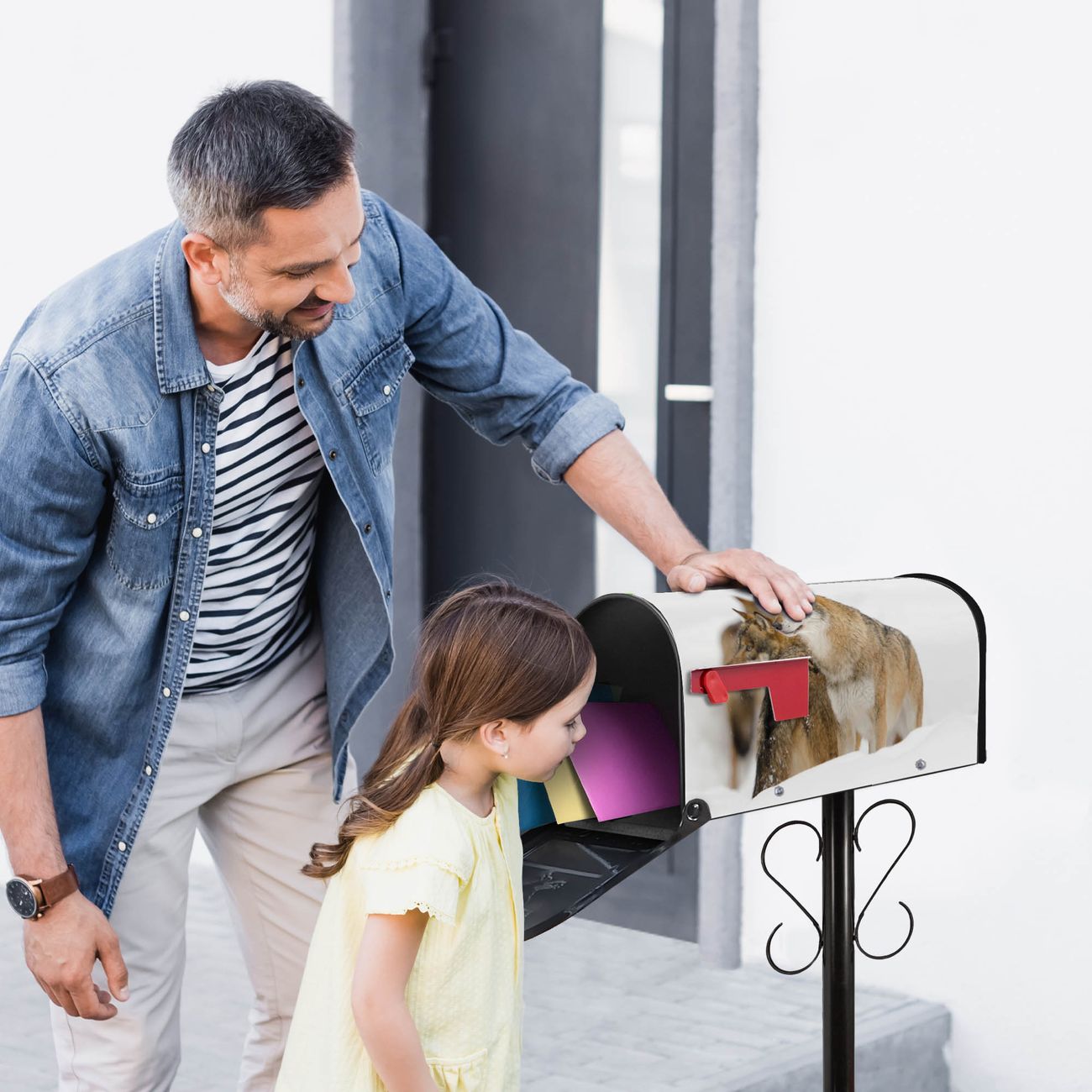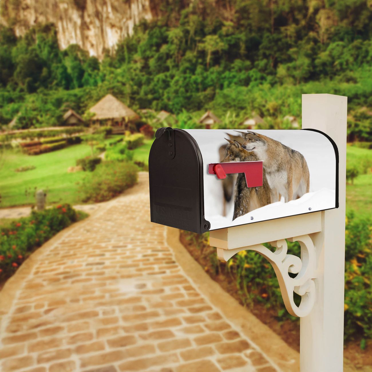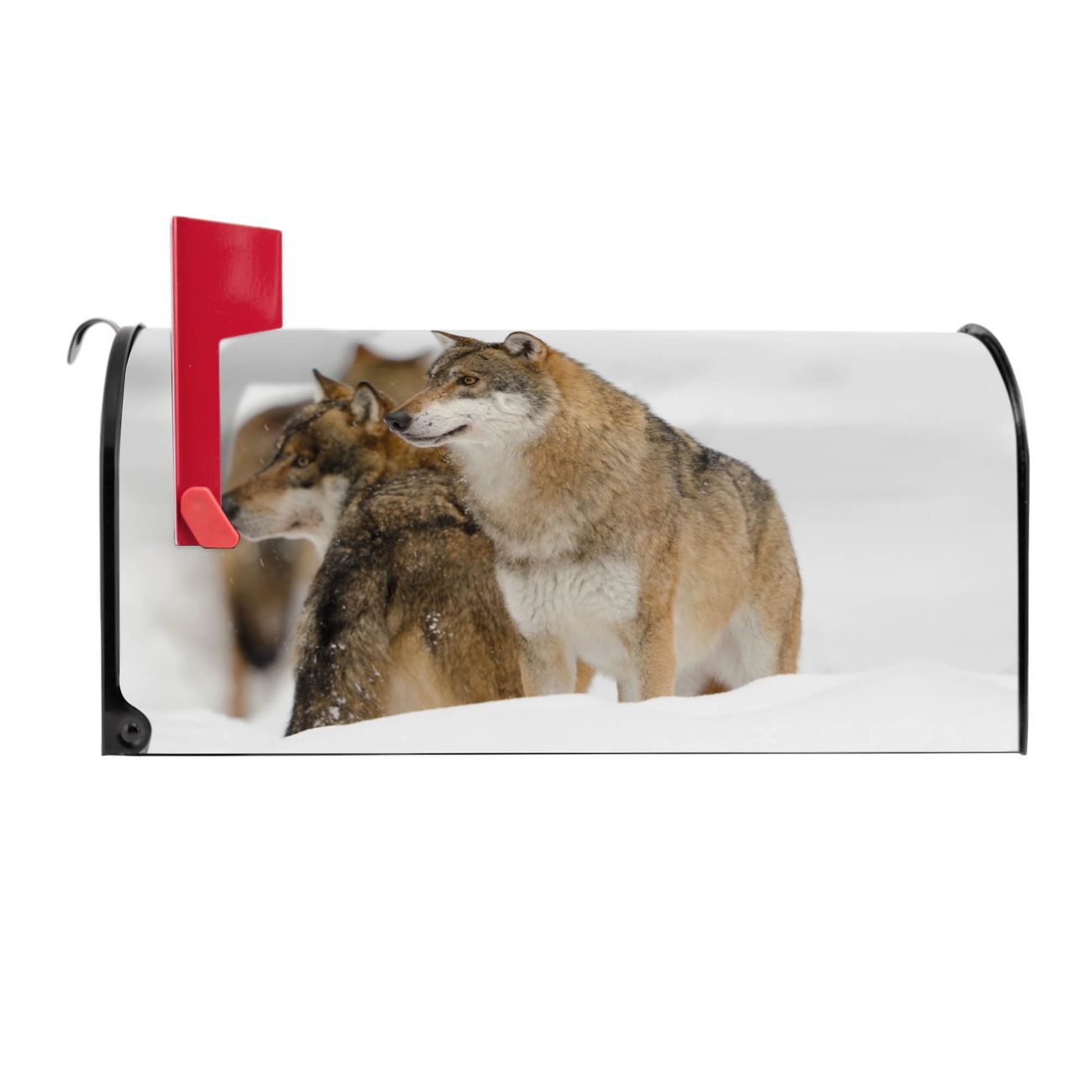 Der amerikanische Briefkasten von banjado mit Wölfe Motiv bietet Ihnen ausreichend Fassungsvermögen, um große A4 Sendungen und Zeitschriften zu empfangen. Die typisch amerikanische rote Fahne zeigt Ihnen an, wenn Sie Post erhalten haben. Die US-Mailbox besteht aus verzinktem Stahlblech welches lackiert wurde und ist 48 x 22 x 16 CM (BxHxT) groß. Die Folie mit Motiv Wölfe besteht aus einer wetter- und UV-resistenten Folie, die mit einem Schutzlaminat überzogen ist, sodass die US Mailbox zusätzlich vor Kratzern geschützt ist. An der Unterkante sind 4 Löcher je Seite um die Mailbox, typisch amerikanisch, an einem Holzpfahl oder einem Zaun zu befestigen. Auf Wunsch können Sie bei uns den passenden Standfuß oder die passende Wandhalterung kaufen um die US-Mailbox sicher zu befestigen. Wir bieten Ihnen ebenfalls Namensschilder, bereits beschriftet oder frei zu beschriften, und verschiedene selbst gestaltete Bitte-Keine-Werbung-Aufkleber.
