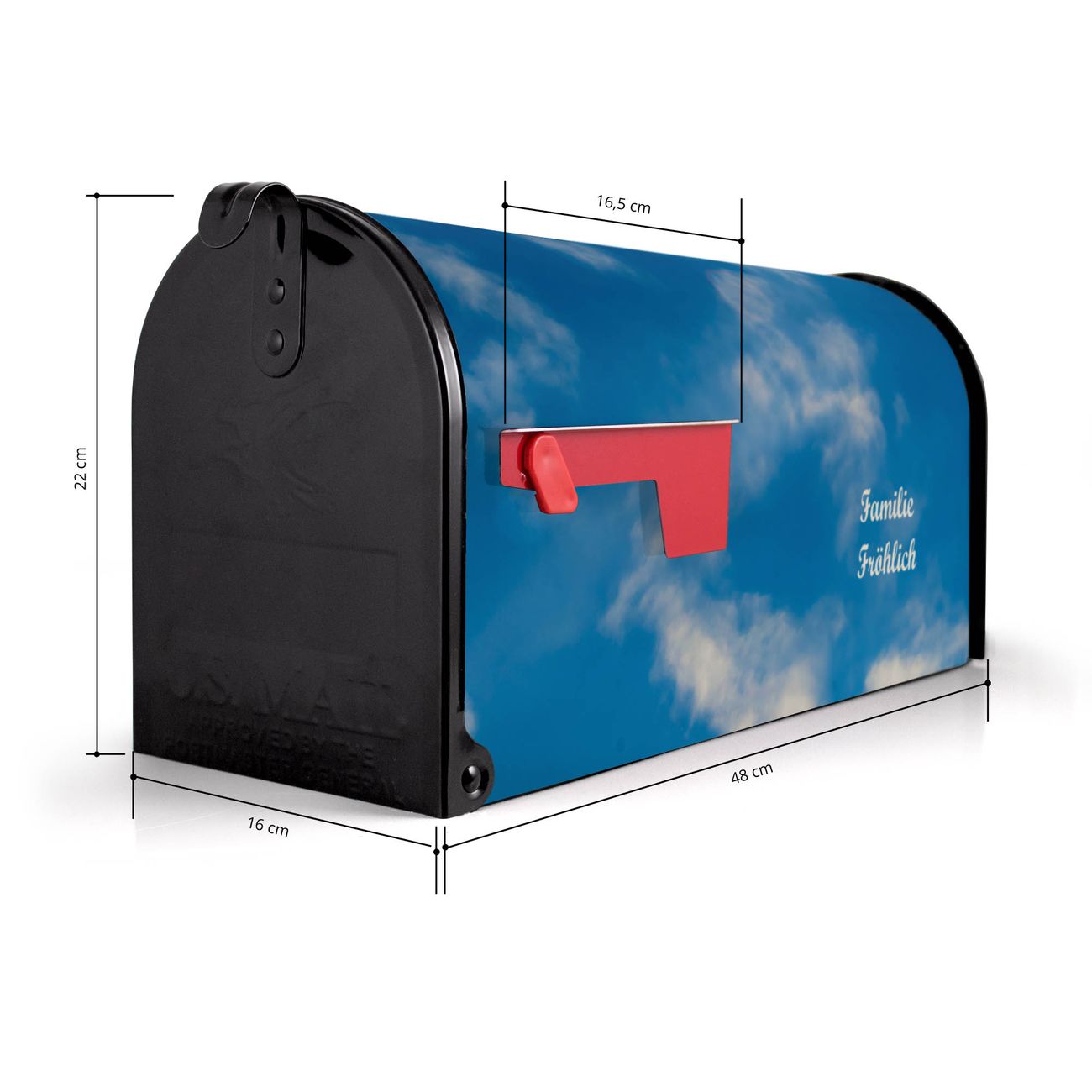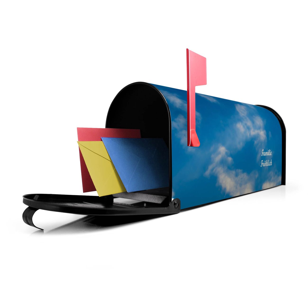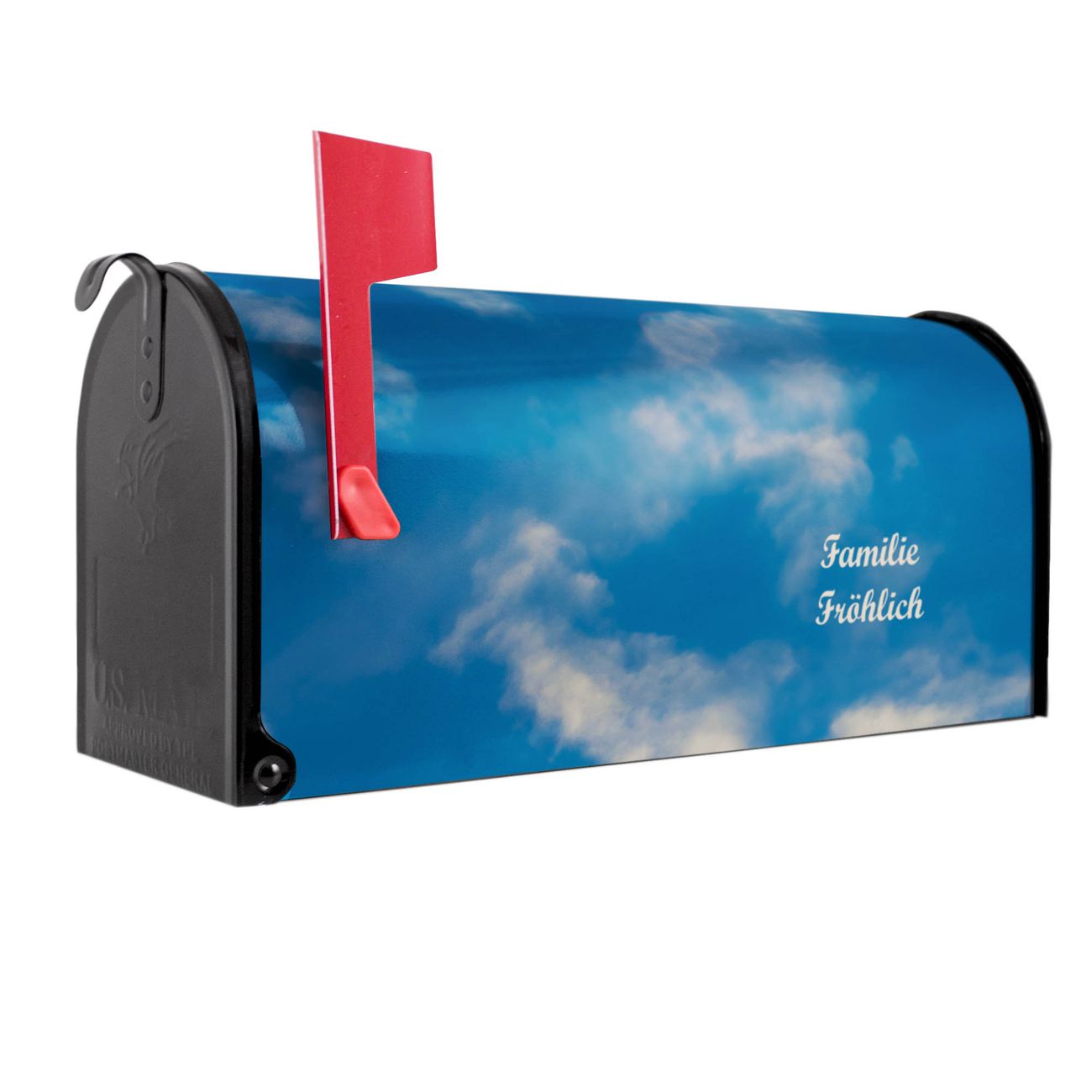 Unser amerikanischer Briefkasten mit dem Motiv Wolken 11 hat ein sehr ansprechendes und ausgefallenes Design, ist in der Grundfarbe weiß, grün oder schwarz erhältlich. Damit entlocken Sie Ihren Nachbarn und dem Postboten immer wieder ein Lächeln. Die Mailbox ist ein Original Import aus Mississippi USA und wird von unserer kleinen Manufaktur in Sachsen von Hand veredelt. Die US-Mailbox bietet ausreichend Platz auch für große Sendungen, eine Fahne die Ihnen Post anzeigt, wetterfestes und äußerst stabiles Material - so macht Post empfangen Freude.