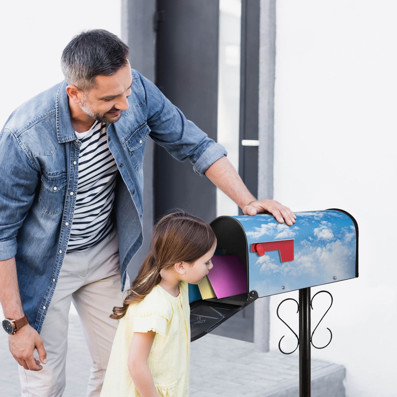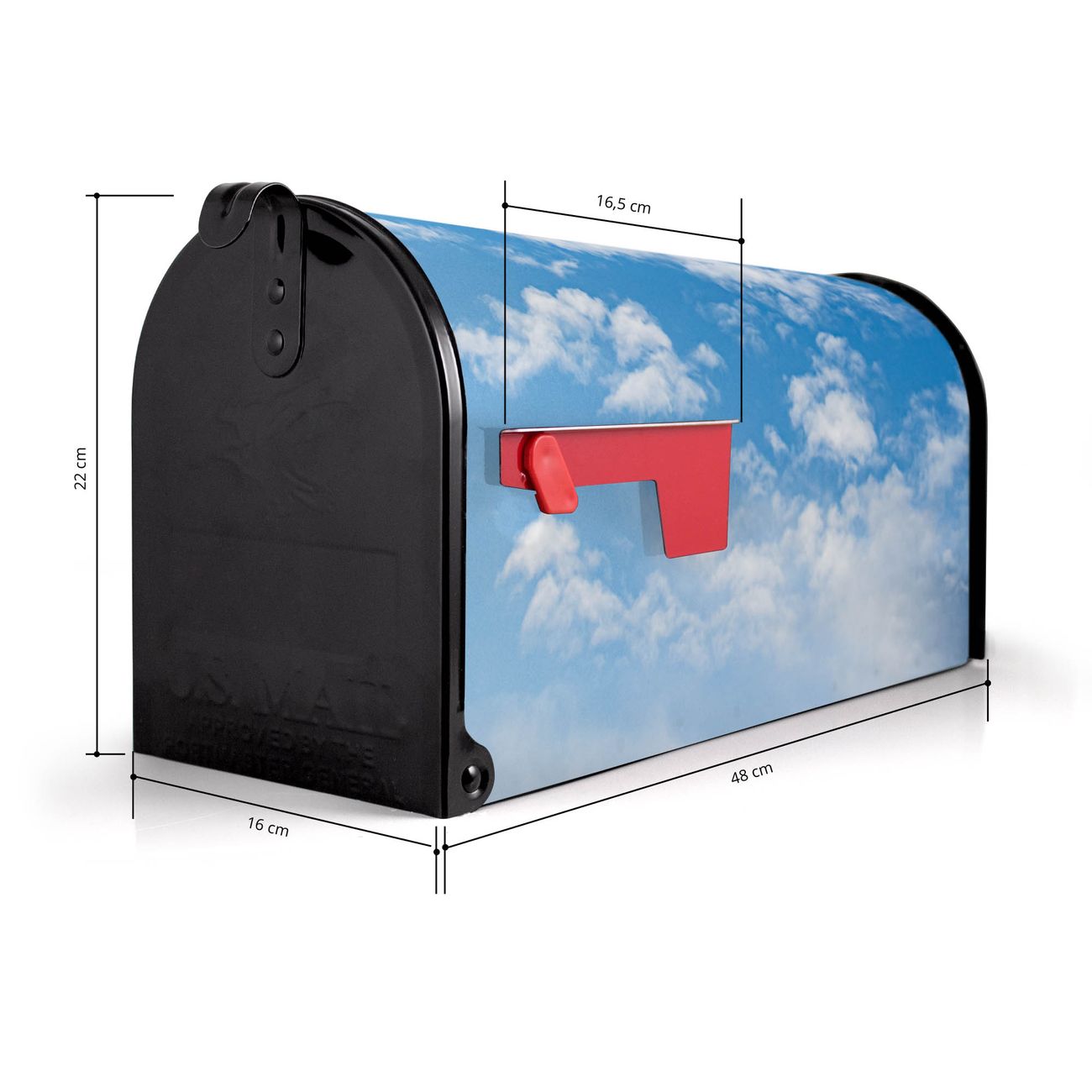Der amerikanische Briefkasten von banjado mit Wolken 1 Motiv bietet Ihnen ausreichend Fassungsvermögen, um große A4 Sendungen und Zeitschriften zu empfangen. Die typisch amerikanische rote Fahne zeigt Ihnen an, wenn Sie Post erhalten haben. Die US-Mailbox besteht aus verzinktem Stahlblech welches lackiert wurde und ist 48 x 22 x 16 CM (BxHxT) groß. Die Folie mit Motiv Wolken 1 besteht aus einer wetter- und UV-resistenten Folie, die mit einem Schutzlaminat überzogen ist, sodass die US Mailbox zusätzlich vor Kratzern geschützt ist. An der Unterkante sind 4 Löcher je Seite um die Mailbox, typisch amerikanisch, an einem Holzpfahl oder einem Zaun zu befestigen. Auf Wunsch können Sie bei uns den passenden Standfuß oder die passende Wandhalterung kaufen um die US-Mailbox sicher zu befestigen. Wir bieten Ihnen ebenfalls Namensschilder, bereits beschriftet oder frei zu beschriften, und verschiedene selbst gestaltete Bitte-Keine-Werbung-Aufkleber.