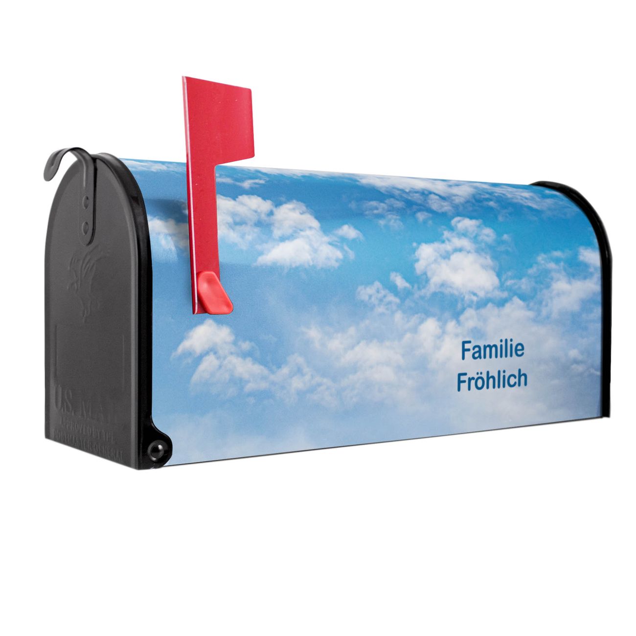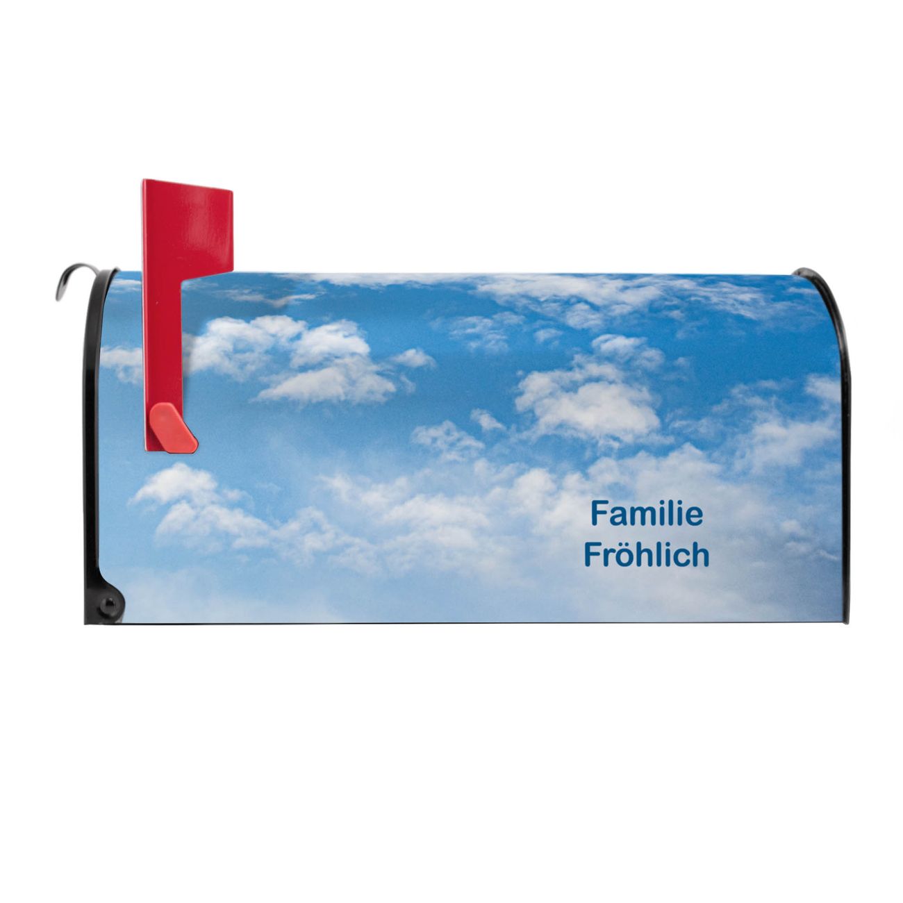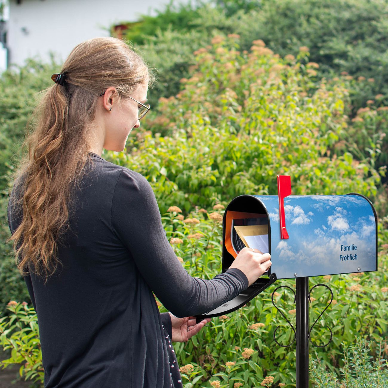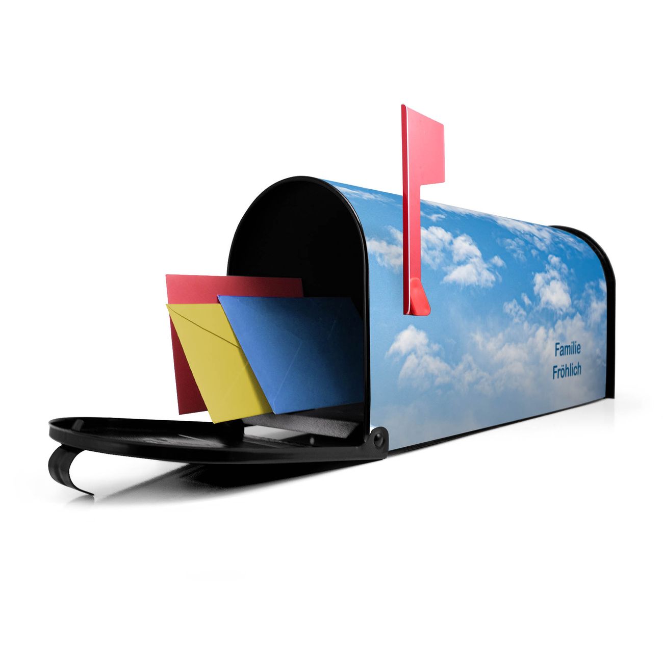 Der amerikanische Briefkasten von banjado mit Wolken 1 Motiv bietet Ihnen ausreichend Fassungsvermögen, um große A4 Sendungen und Zeitschriften zu empfangen. Die typisch amerikanische rote Fahne zeigt Ihnen an, wenn Sie Post erhalten haben. Die US-Mailbox besteht aus verzinktem Stahlblech welches lackiert wurde und ist 48 x 22 x 16 CM (BxHxT) groß. Die Folie mit Motiv Wolken 1 besteht aus einer wetter- und UV-resistenten Folie, die mit einem Schutzlaminat überzogen ist, sodass die US Mailbox zusätzlich vor Kratzern geschützt ist. An der Unterkante sind 4 Löcher je Seite um die Mailbox, typisch amerikanisch, an einem Holzpfahl oder einem Zaun zu befestigen. Auf Wunsch können Sie bei uns den passenden Standfuß oder die passende Wandhalterung kaufen um die US-Mailbox sicher zu befestigen. Wir bieten Ihnen ebenfalls Namensschilder, bereits beschriftet oder frei zu beschriften, und verschiedene selbst gestaltete Bitte-Keine-Werbung-Aufkleber.