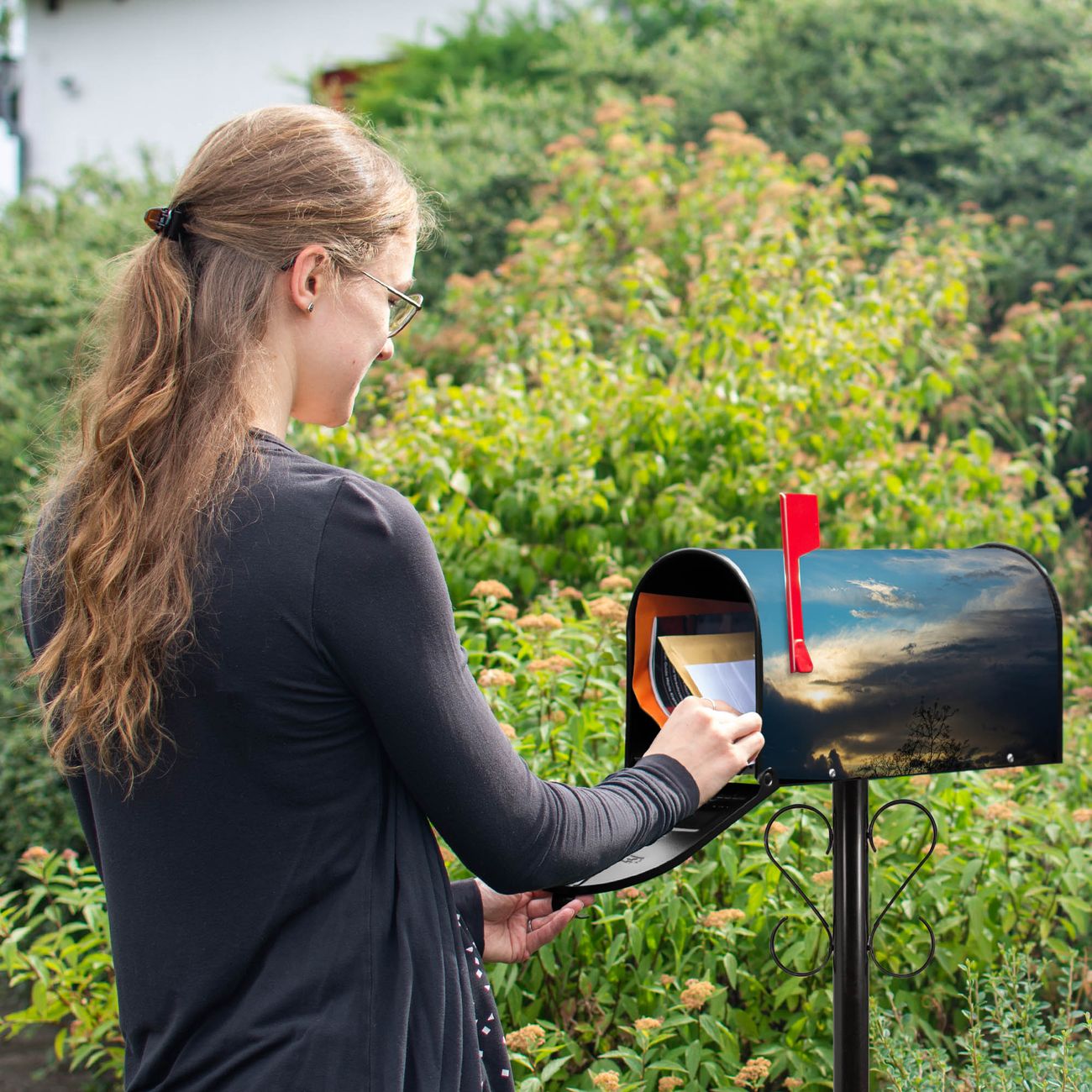 Der amerikanische Briefkasten von banjado mit Wolken 7 Motiv bietet Ihnen ausreichend Fassungsvermögen, um große A4 Sendungen und Zeitschriften zu empfangen. Die typisch amerikanische rote Fahne zeigt Ihnen an, wenn Sie Post erhalten haben. Die US-Mailbox besteht aus verzinktem Stahlblech welches lackiert wurde und ist 48 x 22 x 16 CM (BxHxT) groß. Die Folie mit Motiv Wolken 7 besteht aus einer wetter- und UV-resistenten Folie, die mit einem Schutzlaminat überzogen ist, sodass die US Mailbox zusätzlich vor Kratzern geschützt ist. An der Unterkante sind 4 Löcher je Seite um die Mailbox, typisch amerikanisch, an einem Holzpfahl oder einem Zaun zu befestigen. Auf Wunsch können Sie bei uns den passenden Standfuß oder die passende Wandhalterung kaufen um die US-Mailbox sicher zu befestigen. Wir bieten Ihnen ebenfalls Namensschilder, bereits beschriftet oder frei zu beschriften, und verschiedene selbst gestaltete Bitte-Keine-Werbung-Aufkleber.