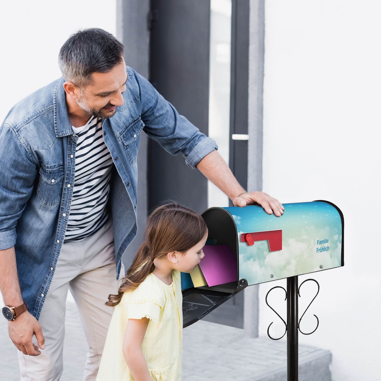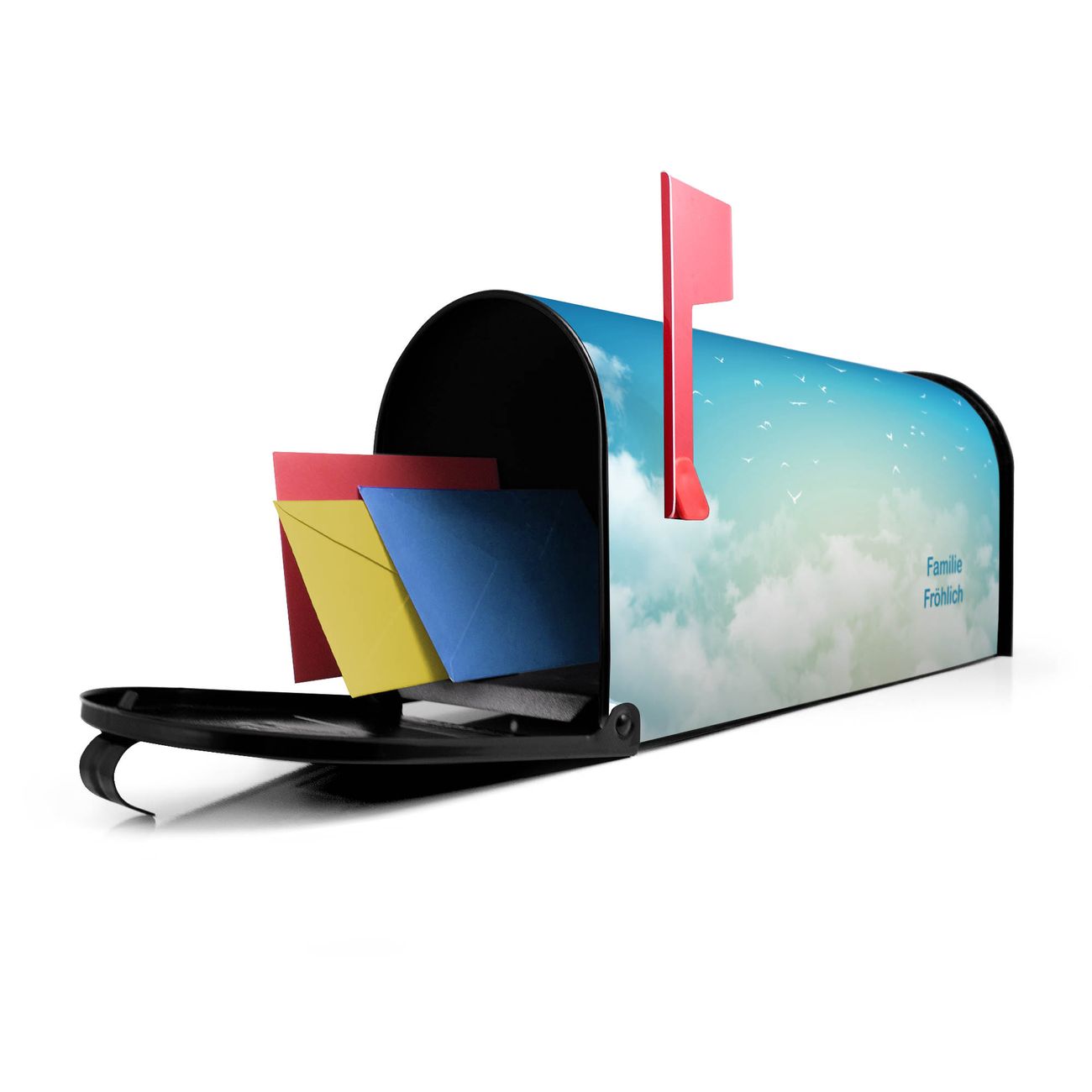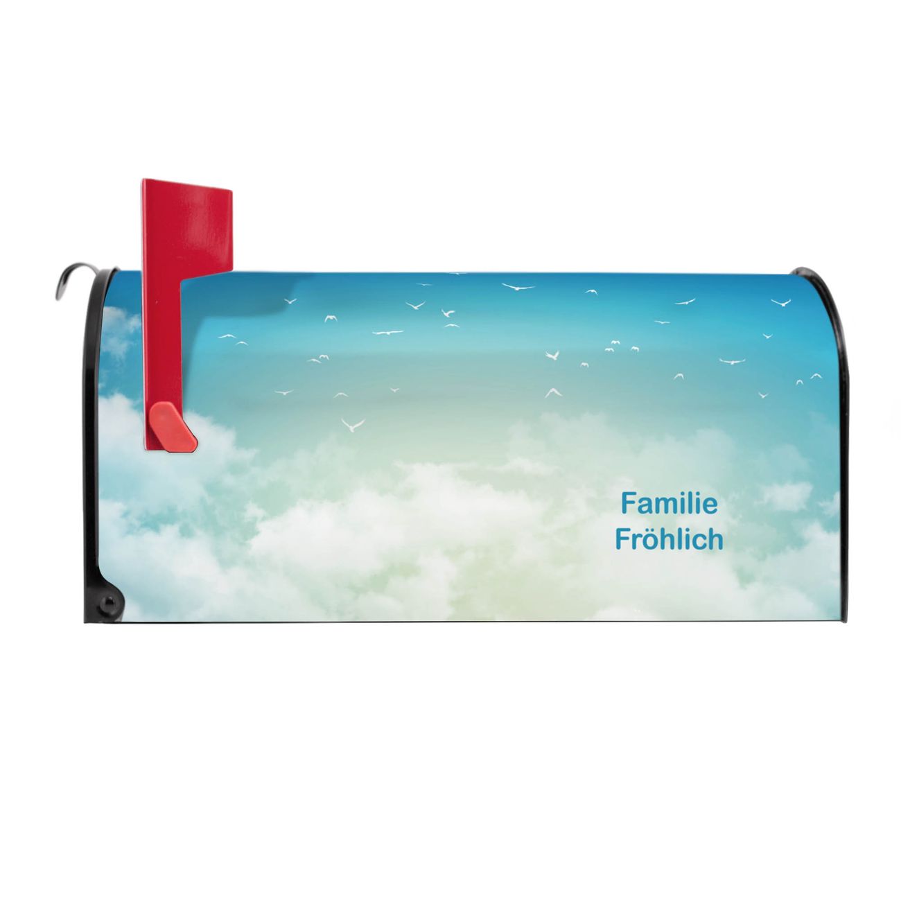 Unser amerikanischer Briefkasten mit dem Motiv Wolken 8 hat ein sehr ansprechendes und ausgefallenes Design, ist in der Grundfarbe weiß, grün oder schwarz erhältlich. Damit entlocken Sie Ihren Nachbarn und dem Postboten immer wieder ein Lächeln. Die Mailbox ist ein Original Import aus Mississippi USA und wird von unserer kleinen Manufaktur in Sachsen von Hand veredelt. Die US-Mailbox bietet ausreichend Platz auch für große Sendungen, eine Fahne die Ihnen Post anzeigt, wetterfestes und äußerst stabiles Material - so macht Post empfangen Freude.