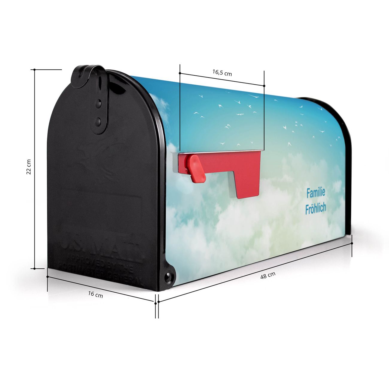 Der amerikanische Briefkasten von banjado mit Wolken 8 Motiv bietet Ihnen ausreichend Fassungsvermögen, um große A4 Sendungen und Zeitschriften zu empfangen. Die typisch amerikanische rote Fahne zeigt Ihnen an, wenn Sie Post erhalten haben. Die US-Mailbox besteht aus verzinktem Stahlblech welches lackiert wurde und ist 48 x 22 x 16 CM (BxHxT) groß. Die Folie mit Motiv Wolken 8 besteht aus einer wetter- und UV-resistenten Folie, die mit einem Schutzlaminat überzogen ist, sodass die US Mailbox zusätzlich vor Kratzern geschützt ist. An der Unterkante sind 4 Löcher je Seite um die Mailbox, typisch amerikanisch, an einem Holzpfahl oder einem Zaun zu befestigen. Auf Wunsch können Sie bei uns den passenden Standfuß oder die passende Wandhalterung kaufen um die US-Mailbox sicher zu befestigen. Wir bieten Ihnen ebenfalls Namensschilder, bereits beschriftet oder frei zu beschriften, und verschiedene selbst gestaltete Bitte-Keine-Werbung-Aufkleber.