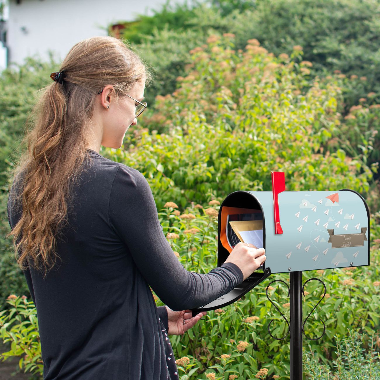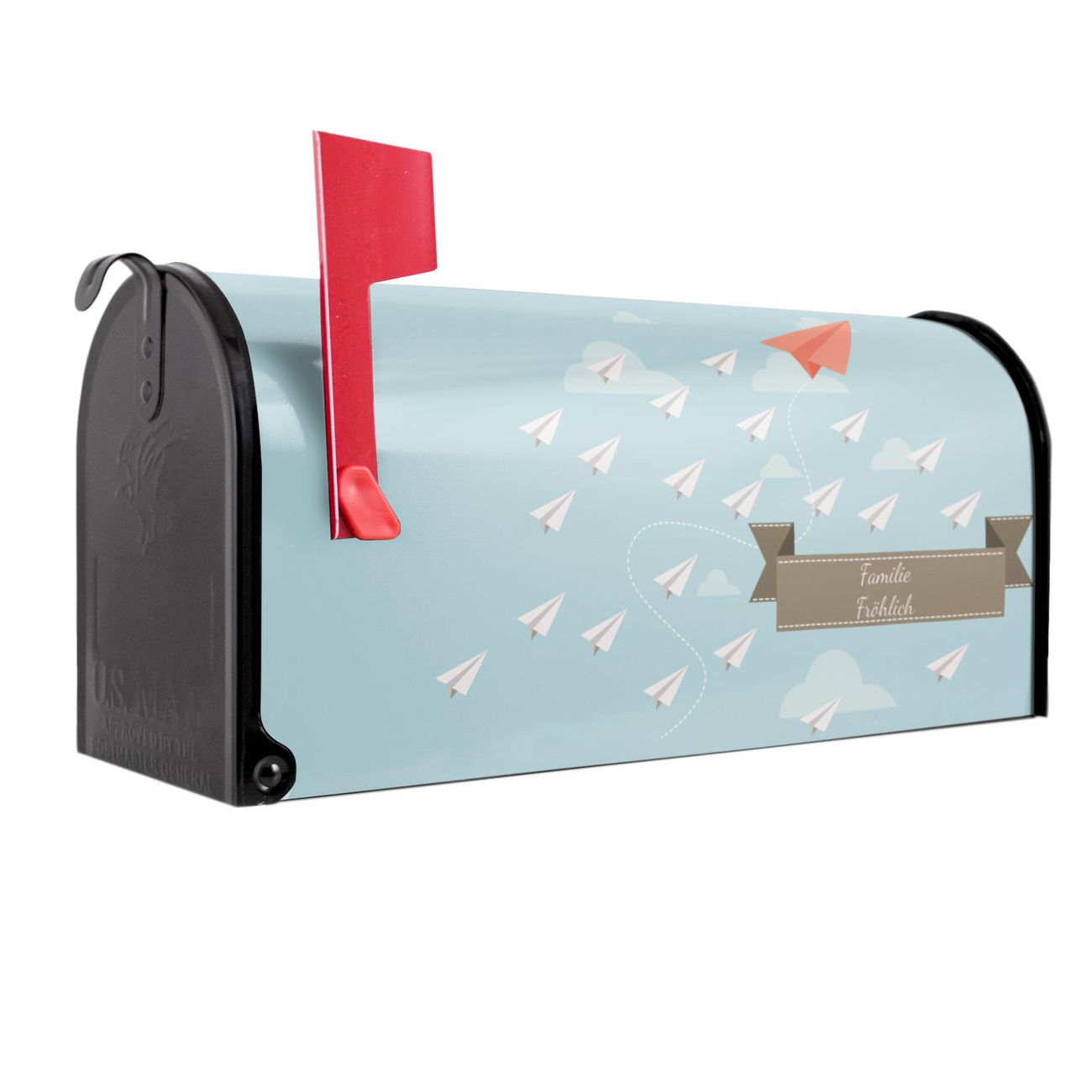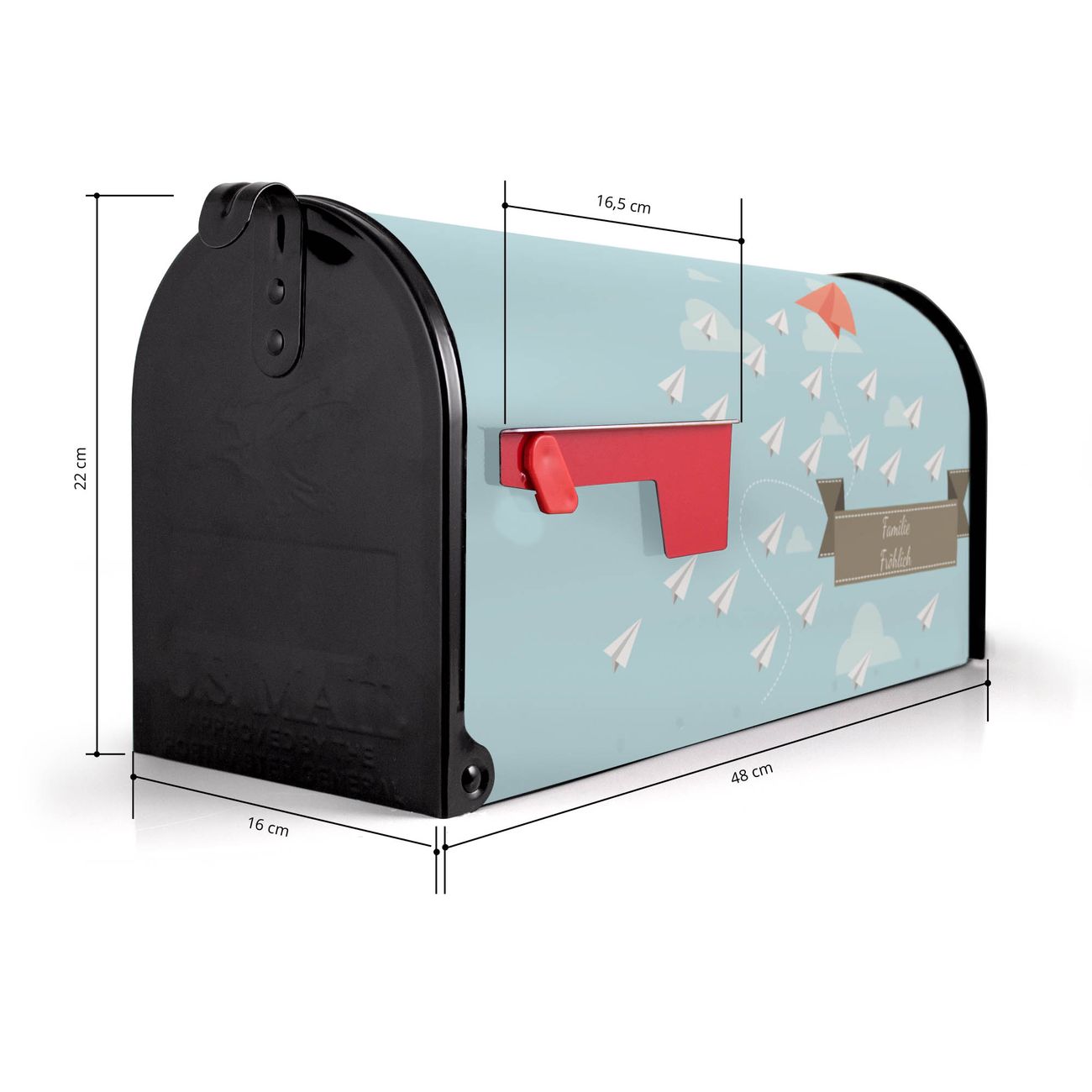 Der amerikanische Briefkasten von banjado mit WT Wolken Motiv bietet Ihnen ausreichend Fassungsvermögen, um große A4 Sendungen und Zeitschriften zu empfangen. Die typisch amerikanische rote Fahne zeigt Ihnen an, wenn Sie Post erhalten haben. Die US-Mailbox besteht aus verzinktem Stahlblech welches lackiert wurde und ist 48 x 22 x 16 CM (BxHxT) groß. Die Folie mit Motiv WT Wolken besteht aus einer wetter- und UV-resistenten Folie, die mit einem Schutzlaminat überzogen ist, sodass die US Mailbox zusätzlich vor Kratzern geschützt ist. An der Unterkante sind 4 Löcher je Seite um die Mailbox, typisch amerikanisch, an einem Holzpfahl oder einem Zaun zu befestigen. Auf Wunsch können Sie bei uns den passenden Standfuß oder die passende Wandhalterung kaufen um die US-Mailbox sicher zu befestigen. Wir bieten Ihnen ebenfalls Namensschilder, bereits beschriftet oder frei zu beschriften, und verschiedene selbst gestaltete Bitte-Keine-Werbung-Aufkleber.